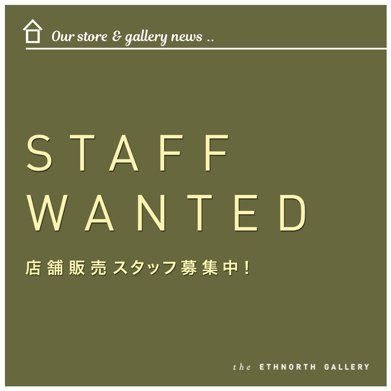 エスノースギャラリーの店頭販売スタッフを募集します。将来正スタッフを目指したい方も大歓迎。是非、働いてみたい! という方は下記の募集要項をご覧の上、ご応募ください。 -