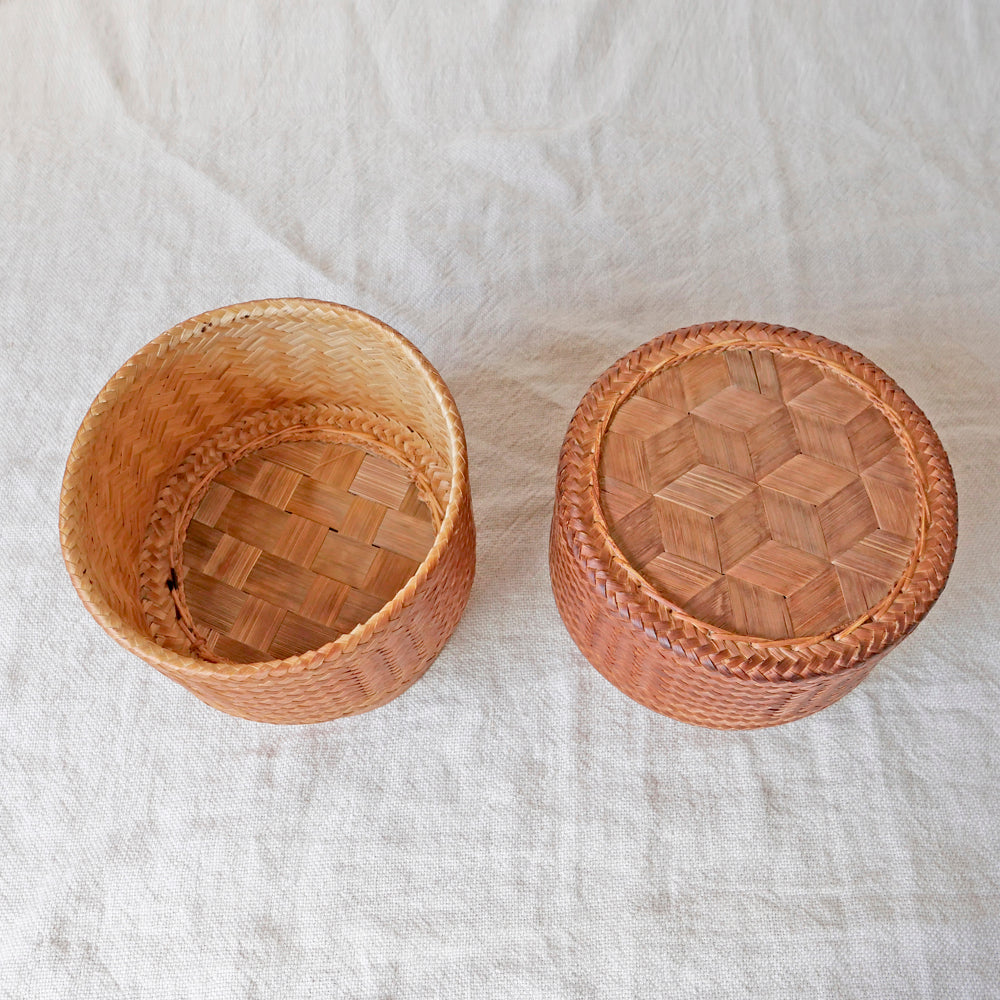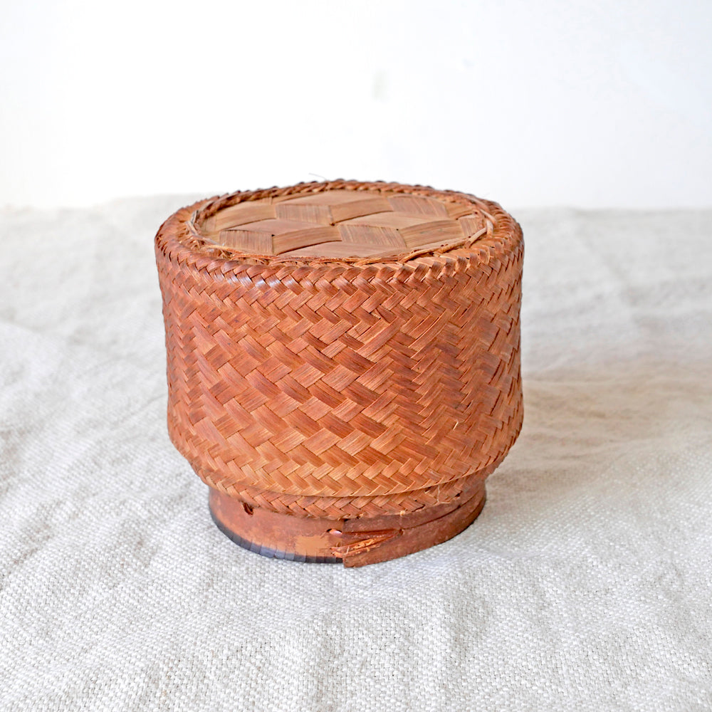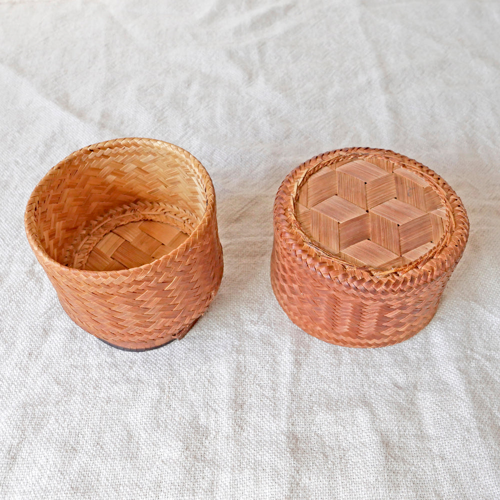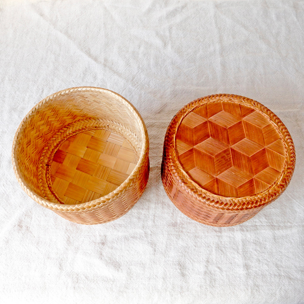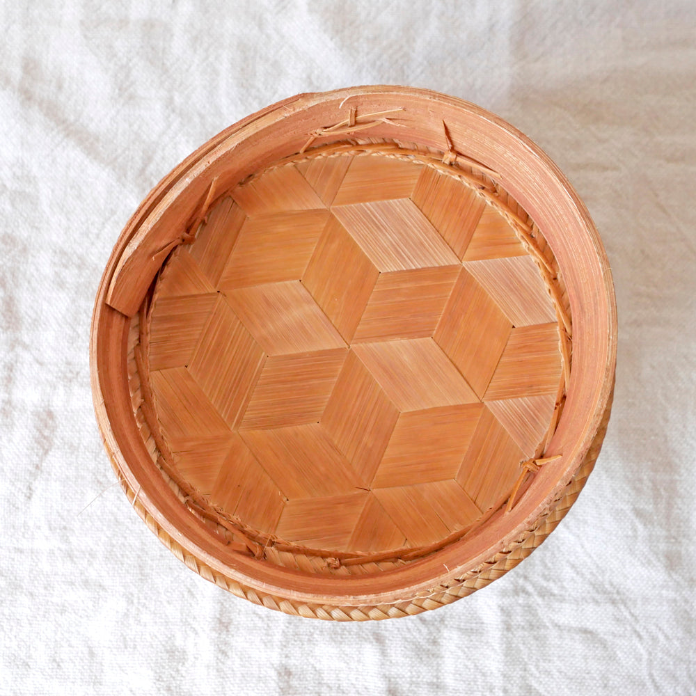 ラオスのバンチェン村で竹皮を編んで作られた蓋付きカゴ。現地ラオスに行くと、彼らの主食であるもち米がこれで出てきました。そのように向こうではおひつ代わりに使われていますが、お裁縫セットや植物入れ、茶器入れなど万能な使い方が考えられます。S,M,Lの3サイズがございます。
