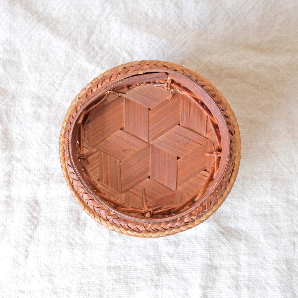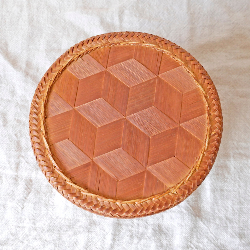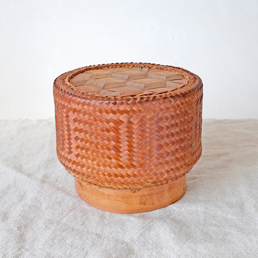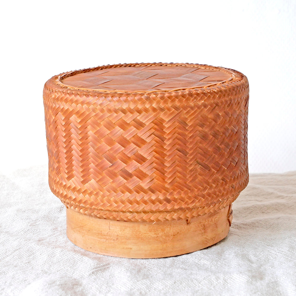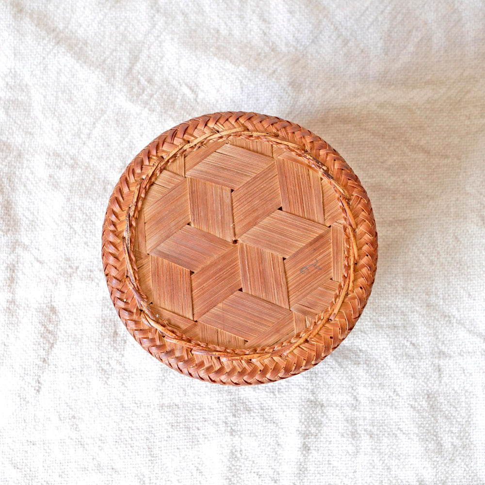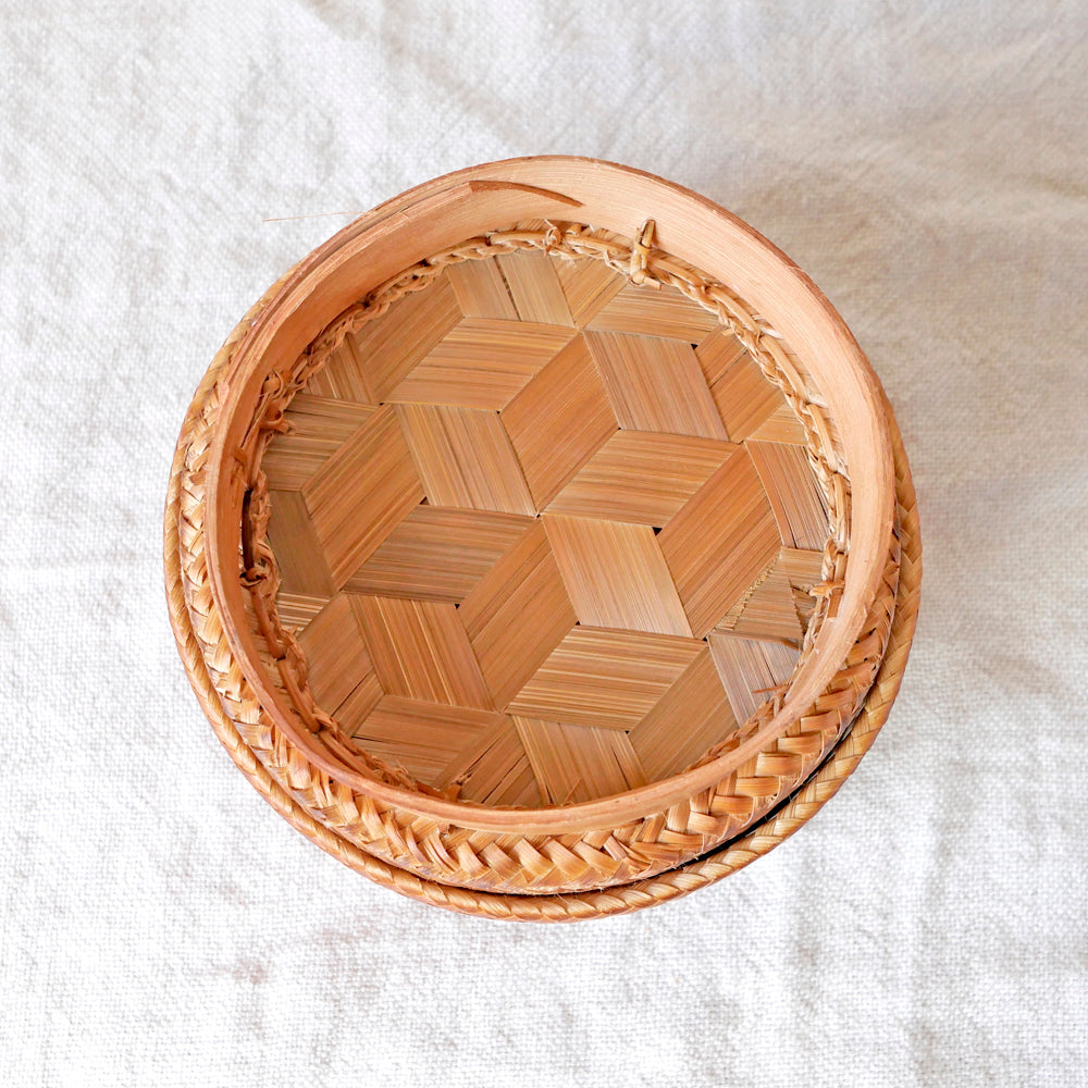 ラオスのバンチェン村で竹皮を編んで作られた蓋付きカゴ。現地ラオスに行くと、彼らの主食であるもち米がこれで出てきました。そのように向こうではおひつ代わりに使われていますが、お裁縫セットや植物入れ、茶器入れなど万能な使い方が考えられます。S,M,Lの3サイズがございます。