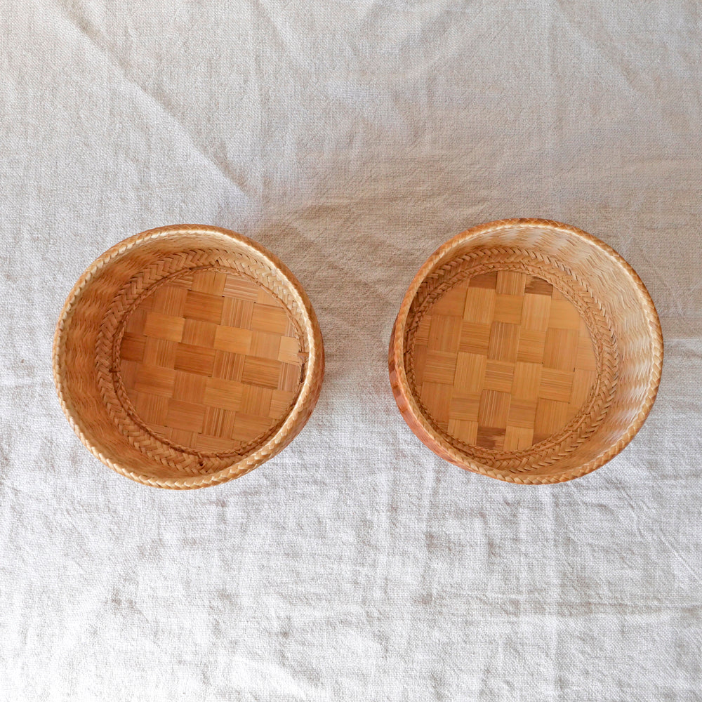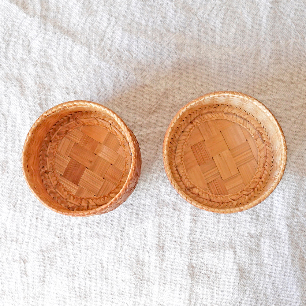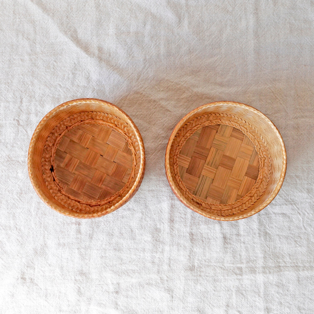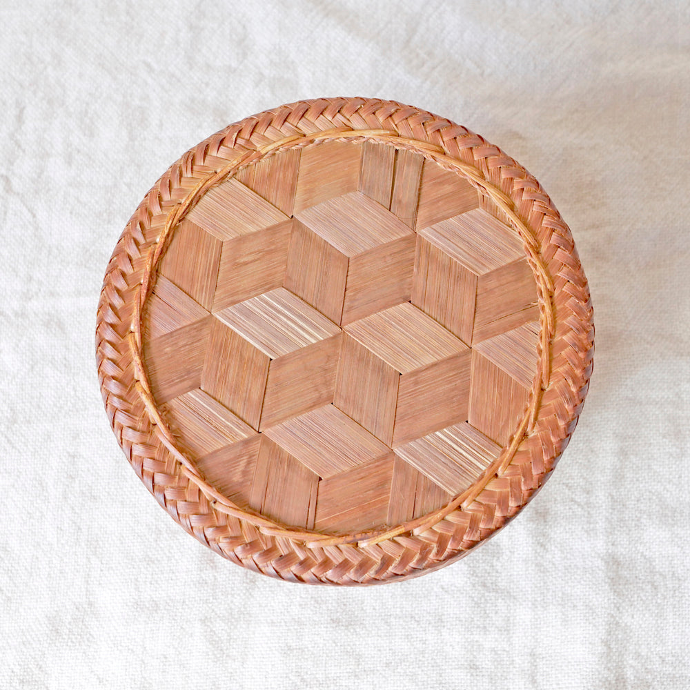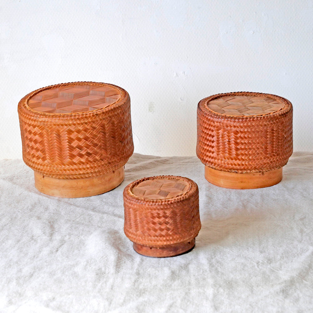 ラオスのバンチェン村で竹皮を編んで作られた蓋付きカゴ。現地ラオスに行くと、彼らの主食であるもち米がこれで出てきました。そのように向こうではおひつ代わりに使われていますが、お裁縫セットや植物入れ、茶器入れなど万能な使い方が考えられます。S,M,Lの3サイズがございます。