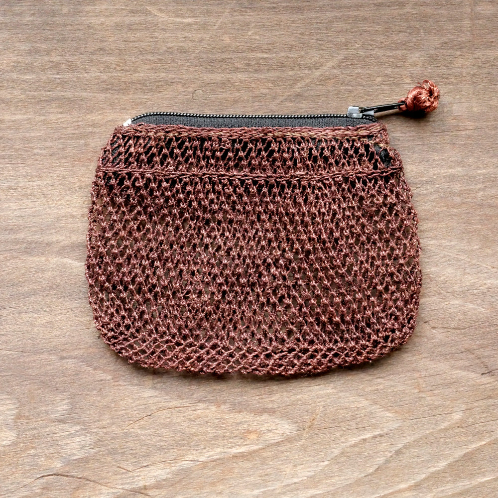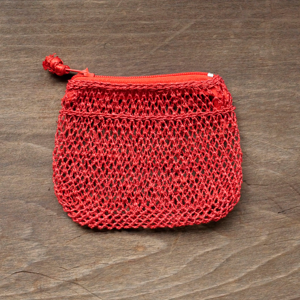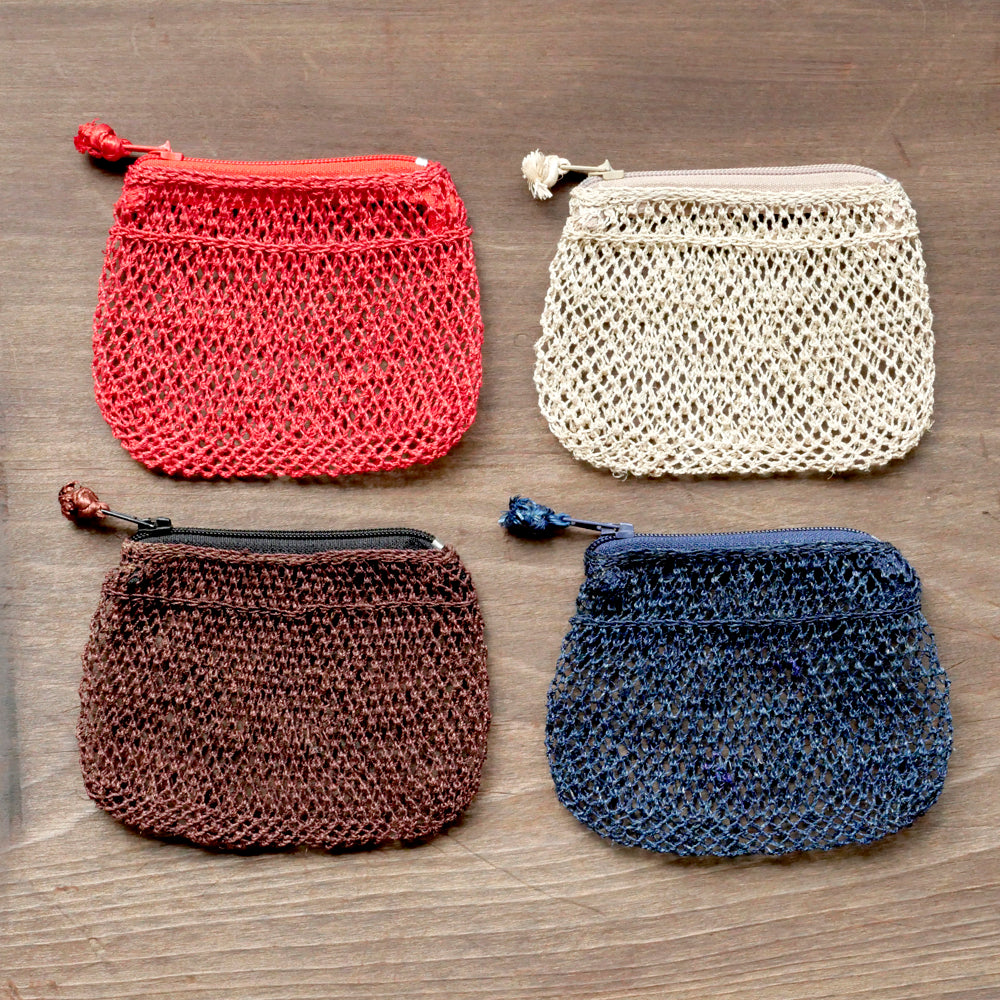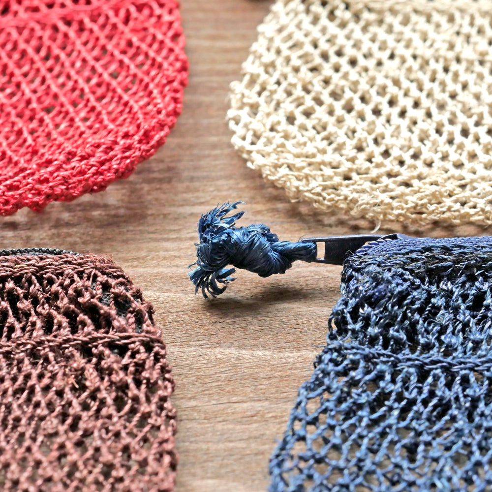 古くはラオスのカム族によって、魚の網を編むようにして作られていた、葛の繊維で出来たポーチ。シースルーでプリミティブな雰囲気がオシャレです。こちらは小型のコインケースサイズのもので中身が見えるので便利です。ファスナー部分にはタッセルが付いています。レッド、ナチュラル、ブラウン、ブルーの4色展開で、生成りのナチュラル以外はすべて現地の植物で染められています。