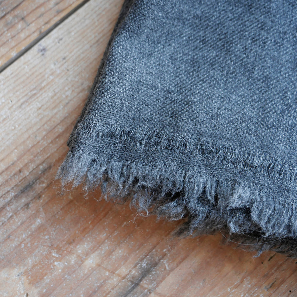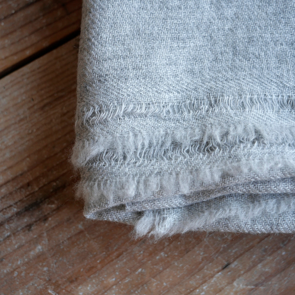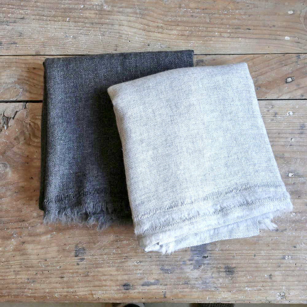 とても繊維が細く弾力性があり、極上の柔らかさを誇る高級素材である手織りのカシミヤのストール。ヒマラヤ山脈に生息する山羊の毛を使用したもので、こちらは原毛色でウールとの混紡タイプになります。保温性や保湿性に優れており、とても重宝します。お洗濯の際にはドライクリーニングに出してください。