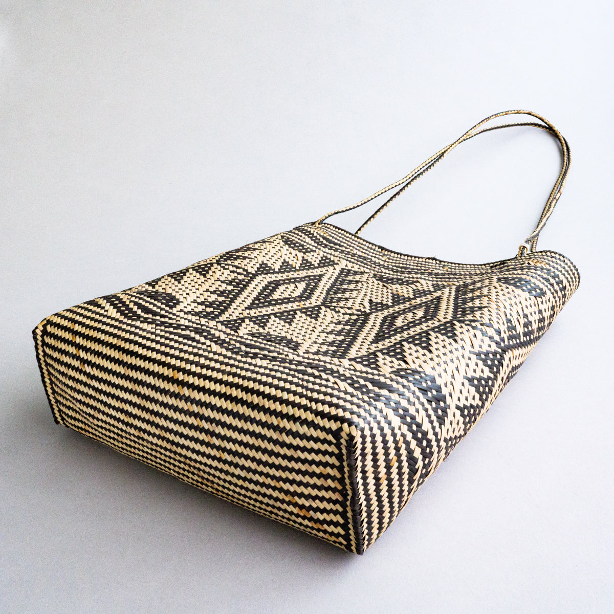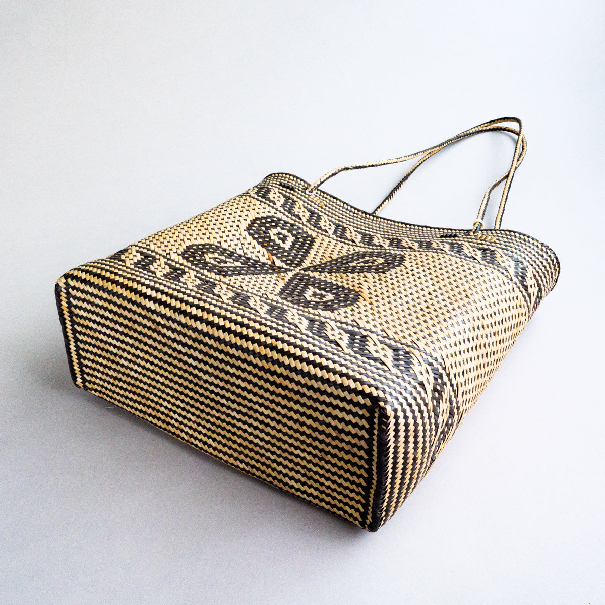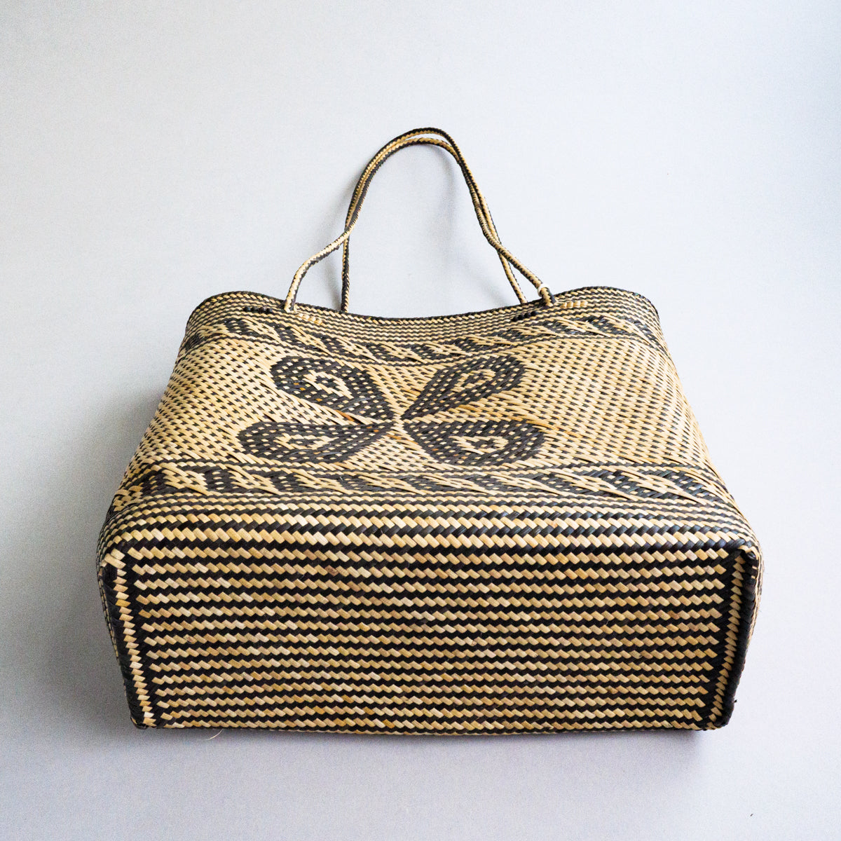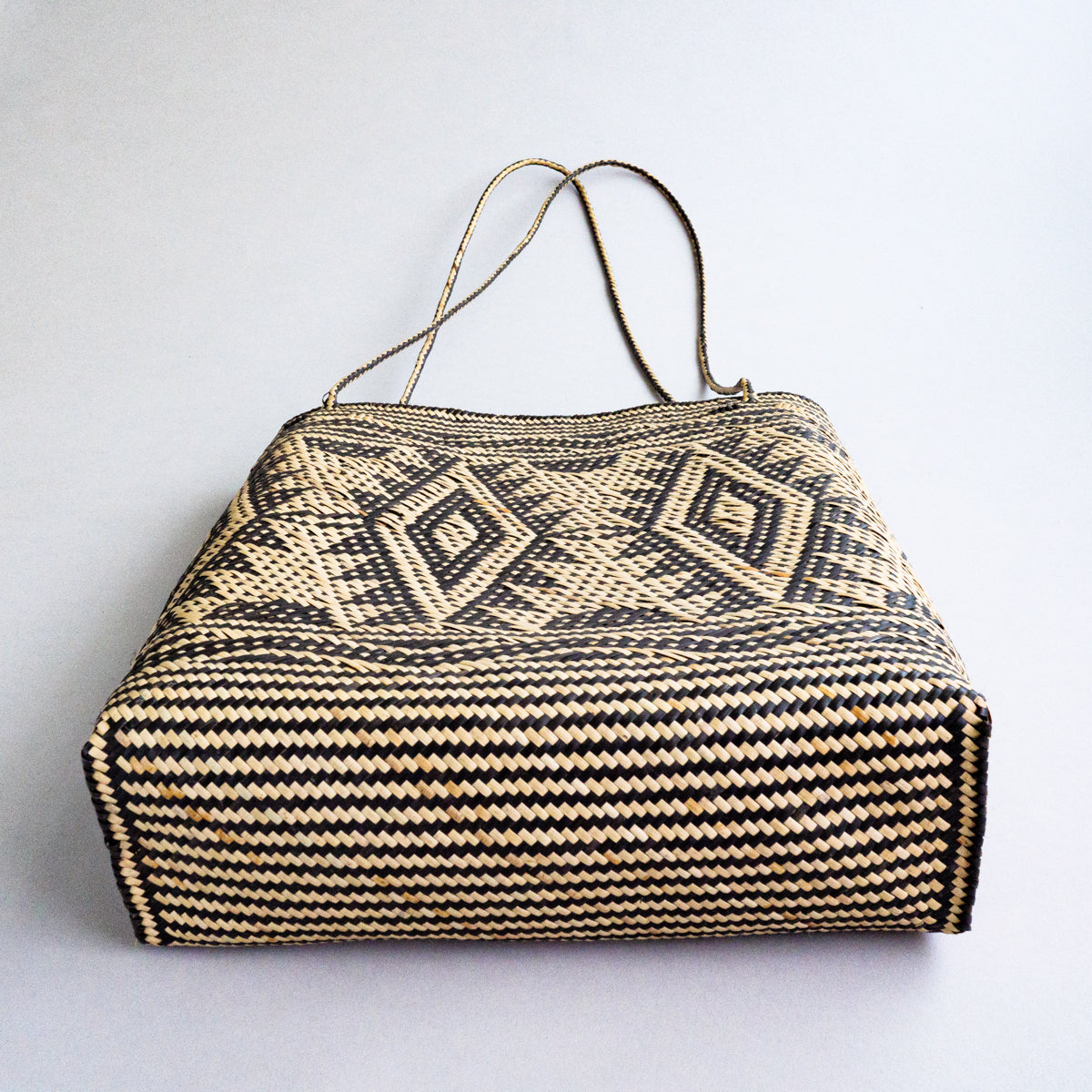 インドネシアはカリマンタン島のダヤック族の伝統的な竹・籐細工のトートバッグ。籐は主にツルの表皮の柔らかい部分を使用し、竹も非常に細かく編んである良質なものです。とても弾力性があり、底にマチがあるので、見た目よりも入ります。細い紐のような持ち手がチャーミングで、とにかく軽量なので、肩にかけて気軽に持ち歩けるのが嬉しいです。
