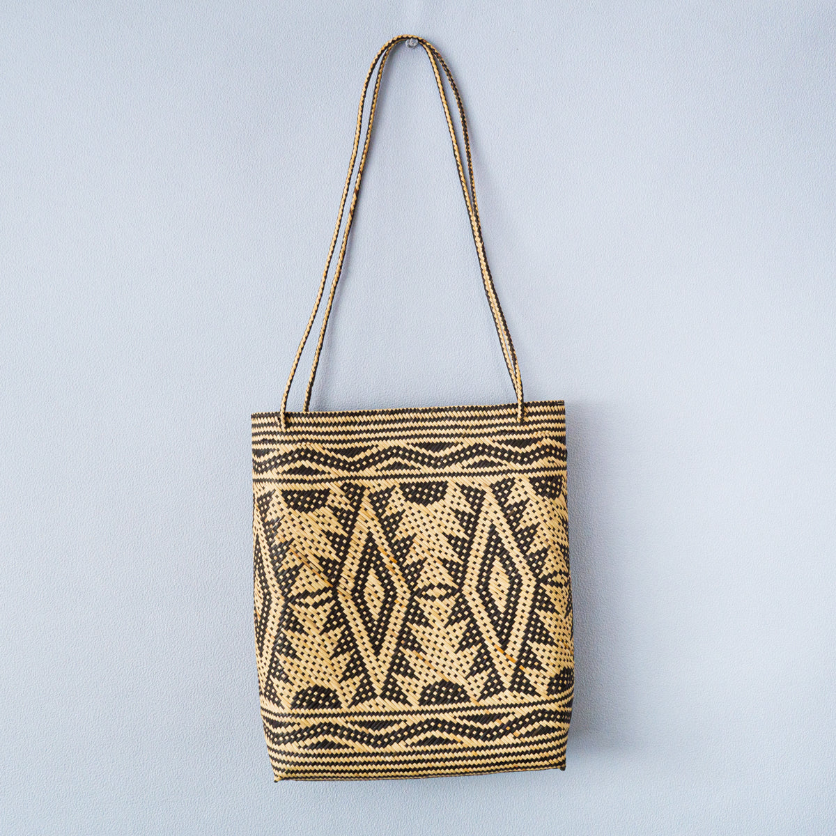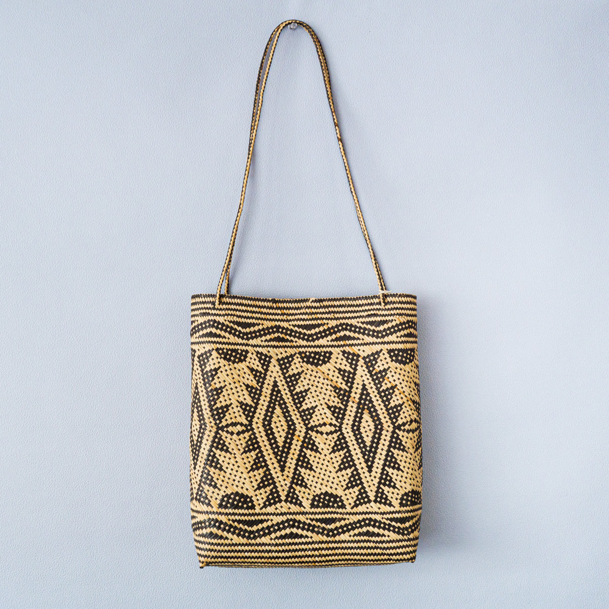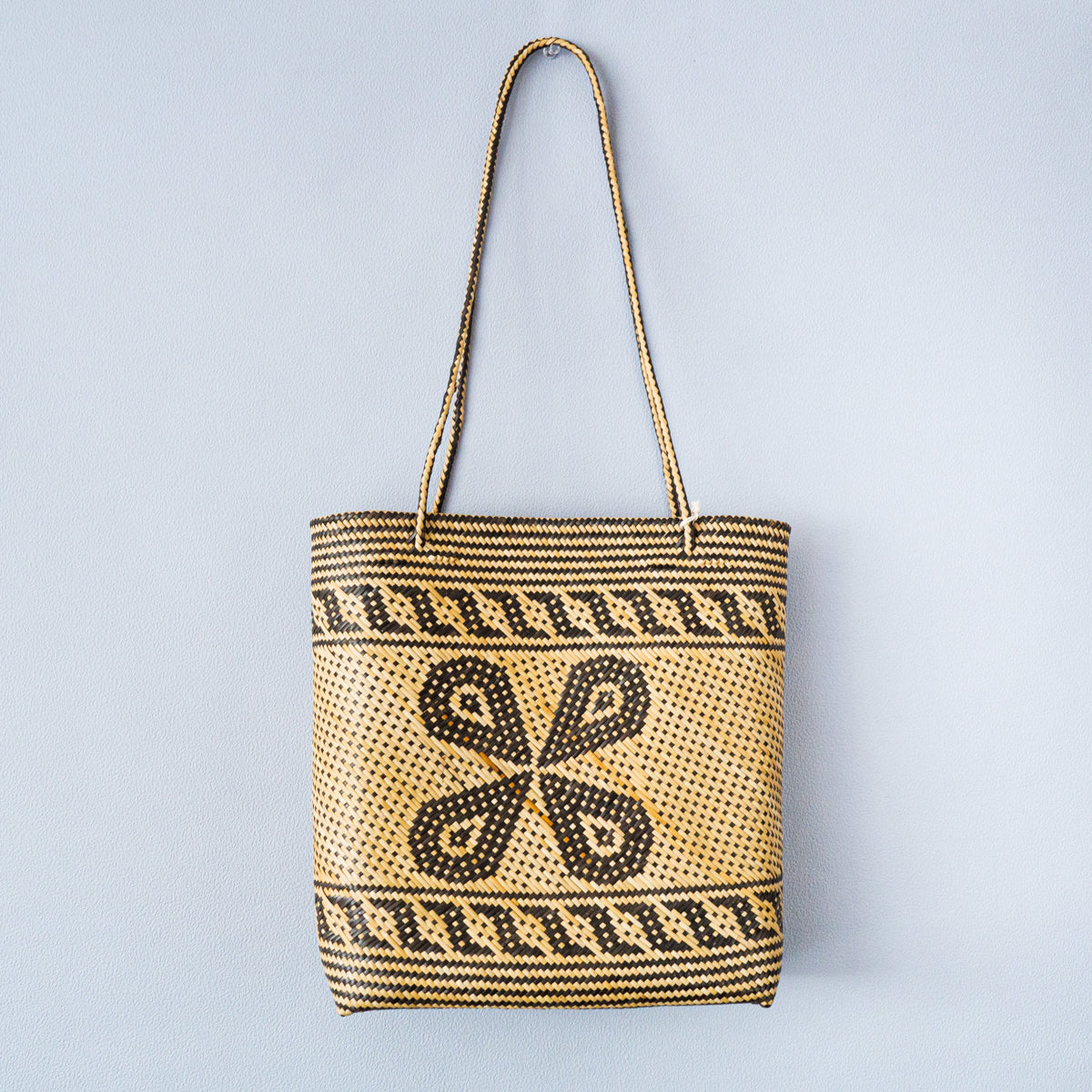 インドネシアはカリマンタン島のダヤック族の伝統的な竹・籐細工のトートバッグ。籐は主にツルの表皮の柔らかい部分を使用し、竹も非常に細かく編んである良質なものです。とても弾力性があり、底にマチがあるので、見た目よりも入ります。細い紐のような持ち手がチャーミングで、とにかく軽量なので、肩にかけて気軽に持ち歩けるのが嬉しいです。