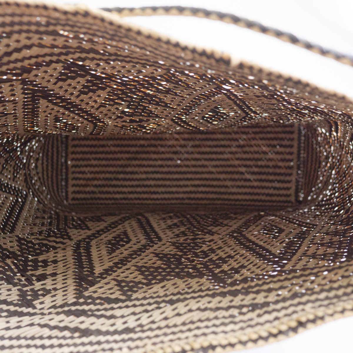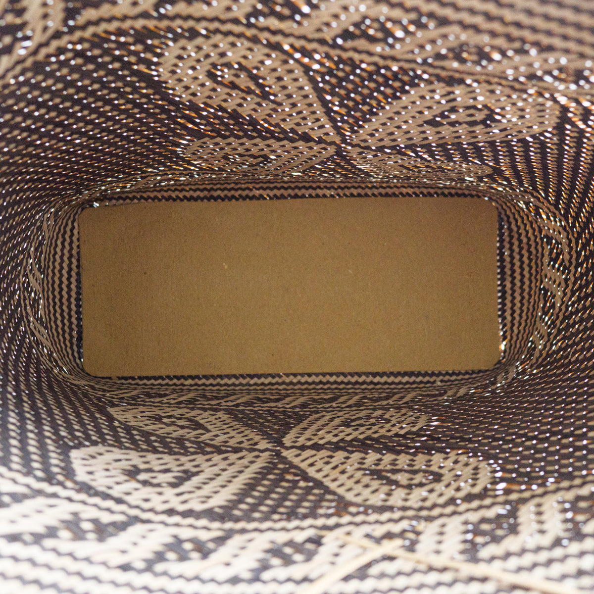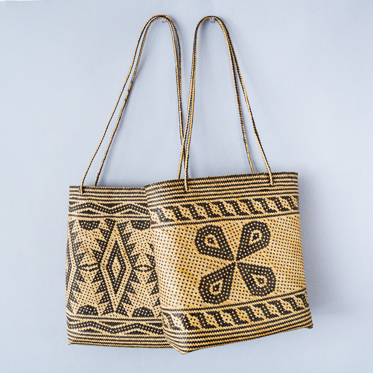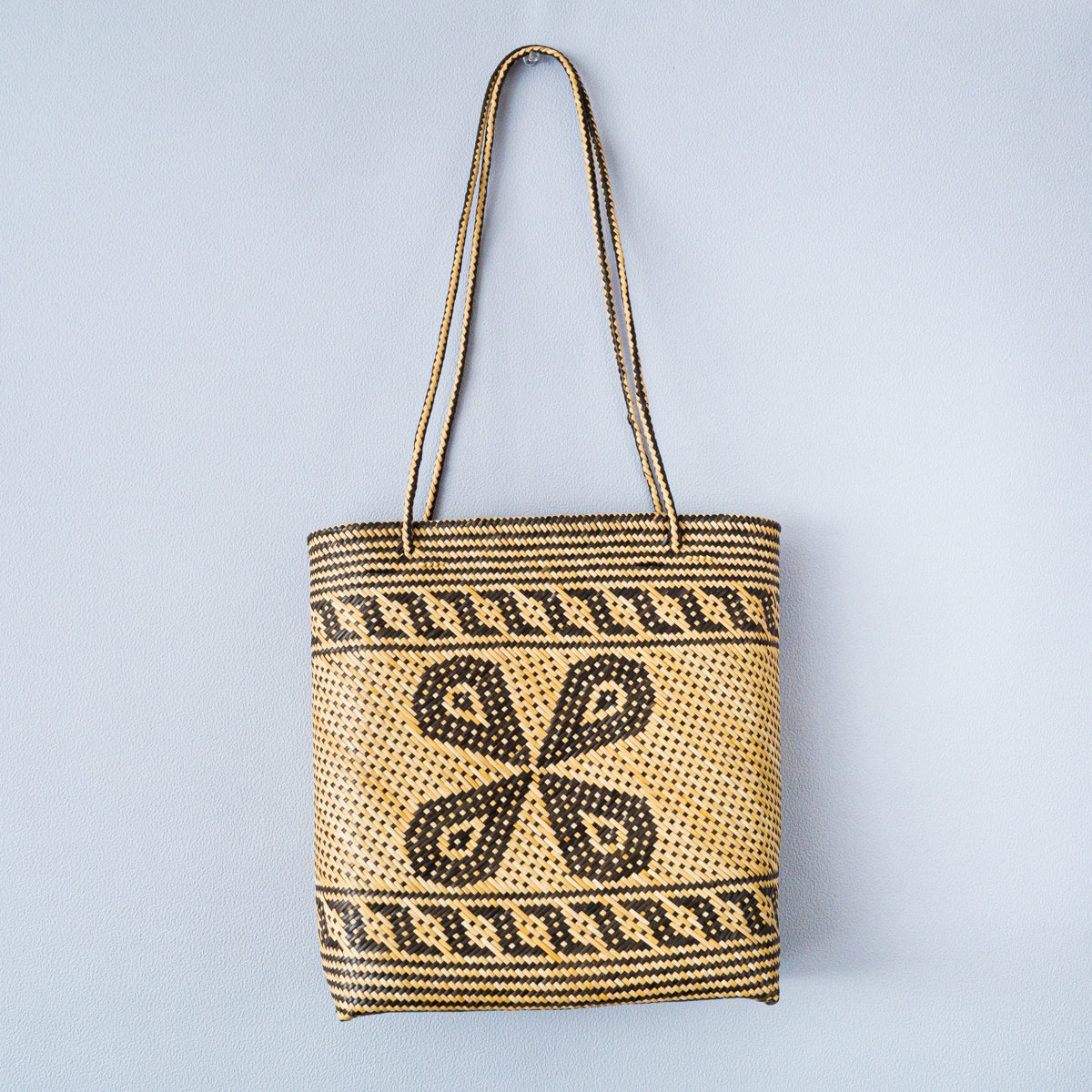 インドネシアはカリマンタン島のダヤック族の伝統的な竹・籐細工のトートバッグ。籐は主にツルの表皮の柔らかい部分を使用し、竹も非常に細かく編んである良質なものです。とても弾力性があり、底にマチがあるので、見た目よりも入ります。細い紐のような持ち手がチャーミングで、とにかく軽量なので、肩にかけて気軽に持ち歩けるのが嬉しいです。