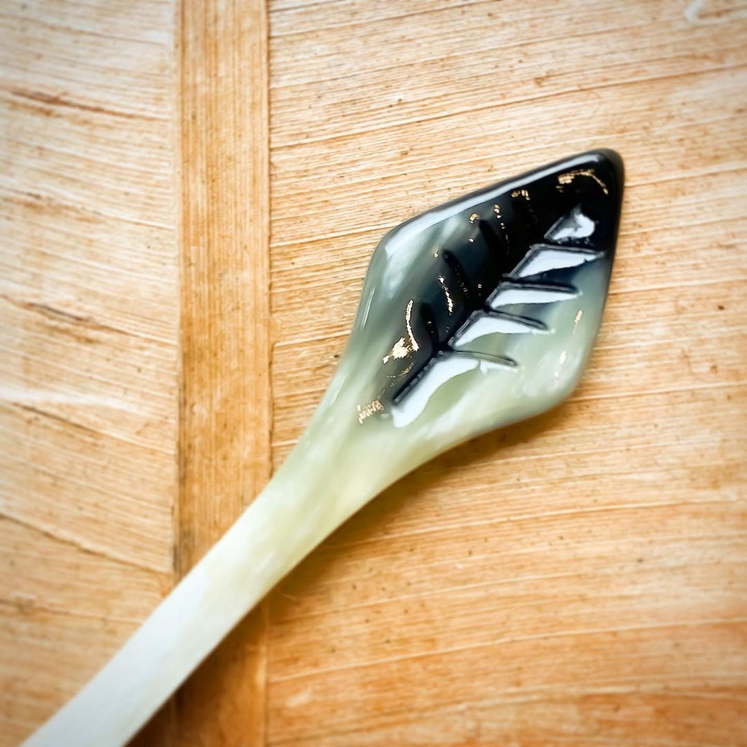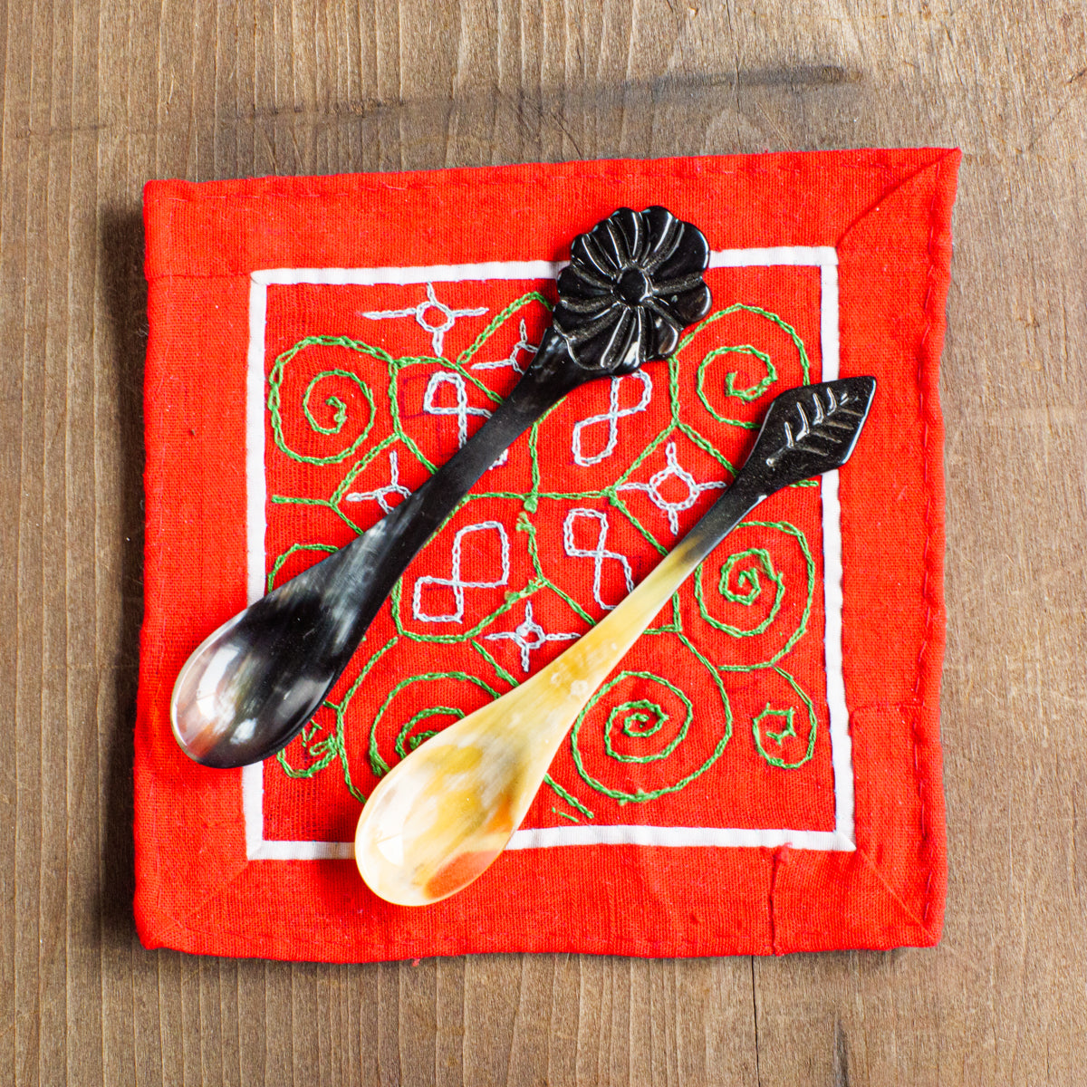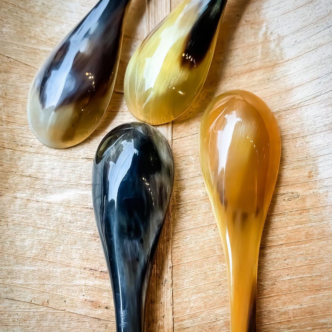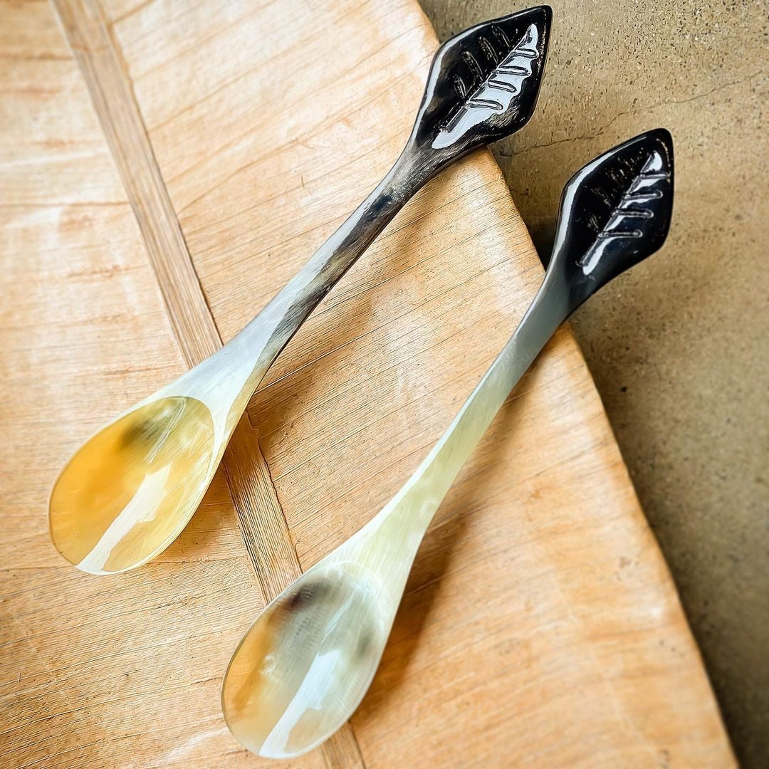 とっても可愛らしいデザインが手彫りされた水牛角を使用したスプーン。我が家でも使用していますが、ヨーグルトなどのデザートを食べると、口あたりがとても滑らかで美味しく感じて頂けます。高熱を加えると変形してしまうので、沸騰したお湯とかに使用するのは避けてください。どれも水牛角そのもののお色です。お花と葉っぱ模様の2種類ございます。