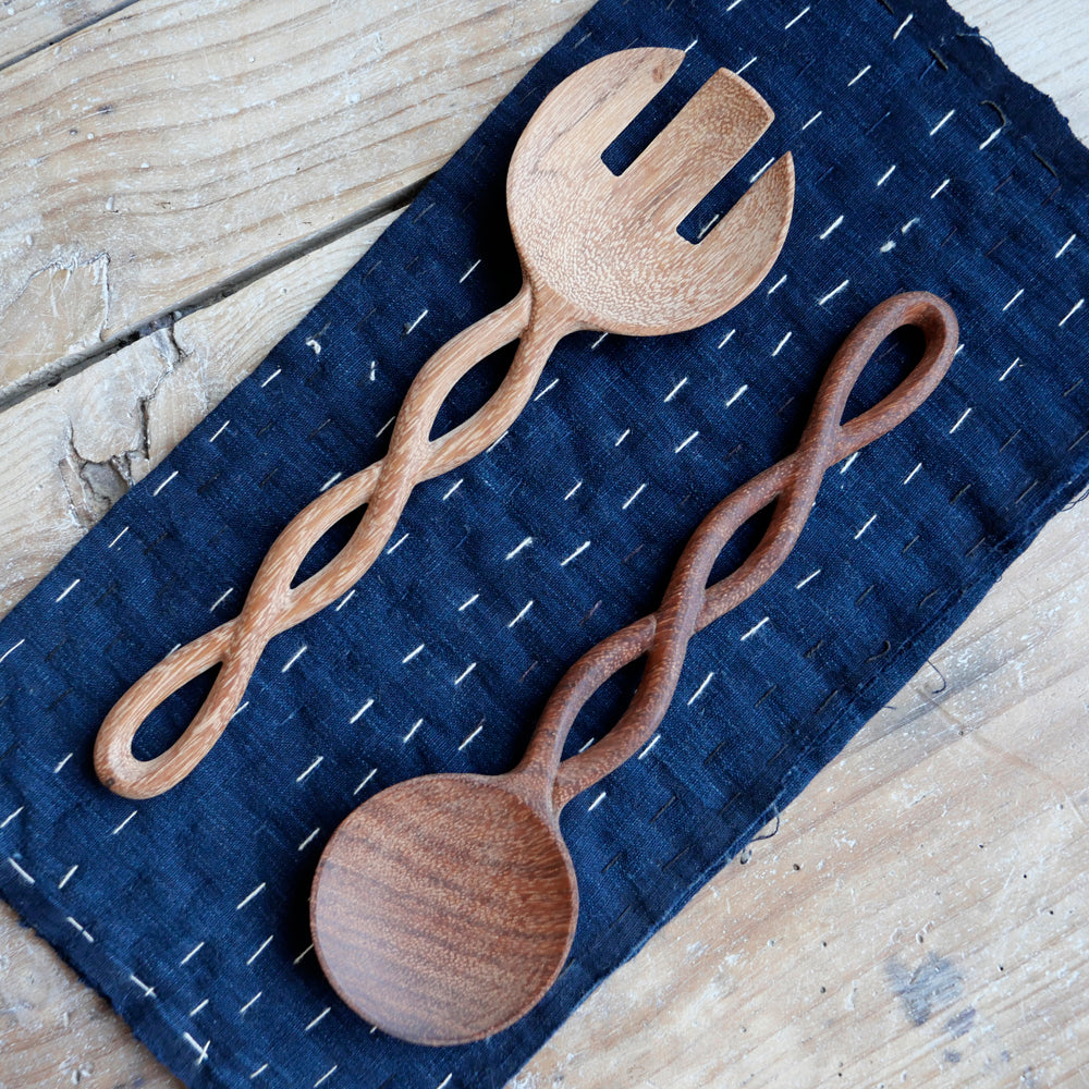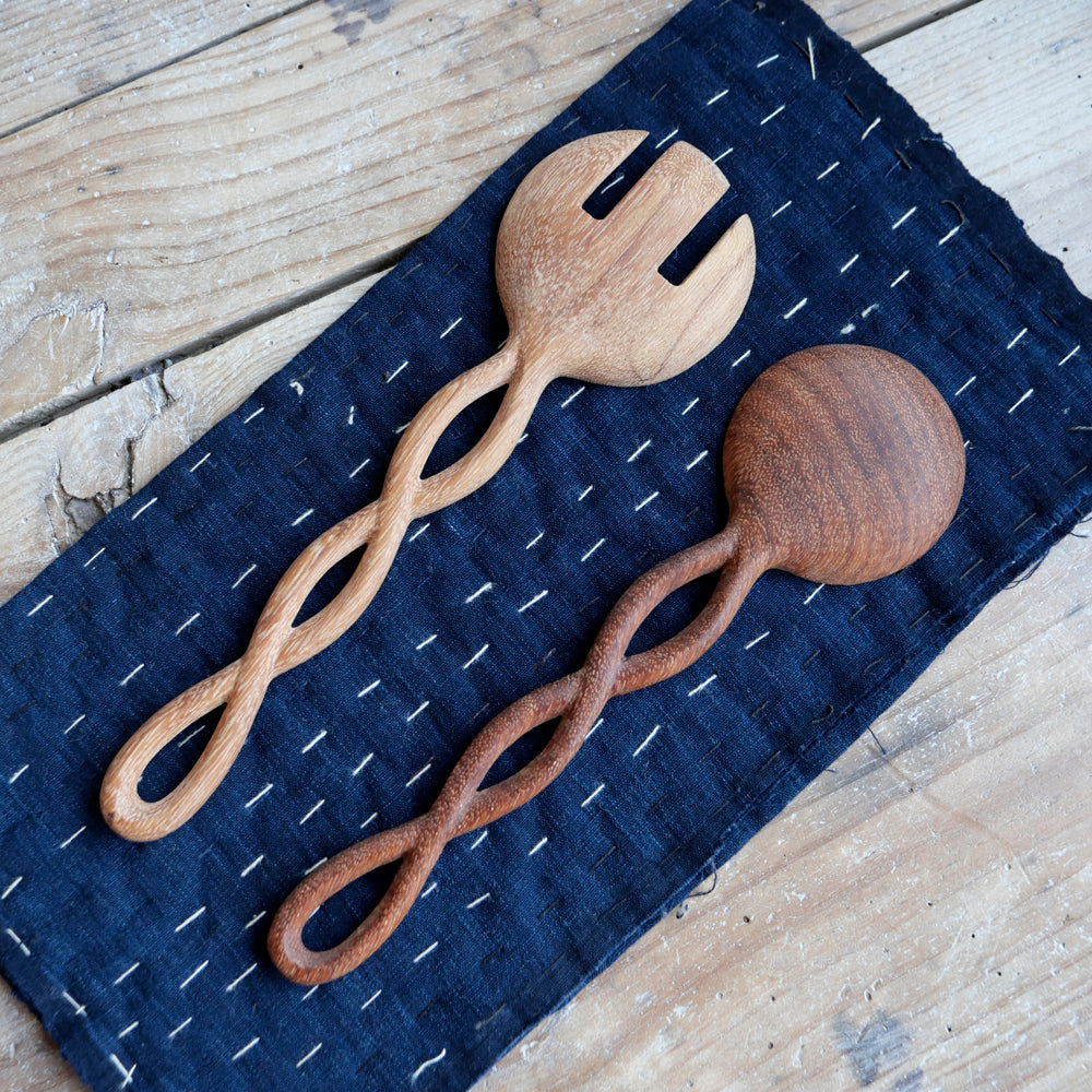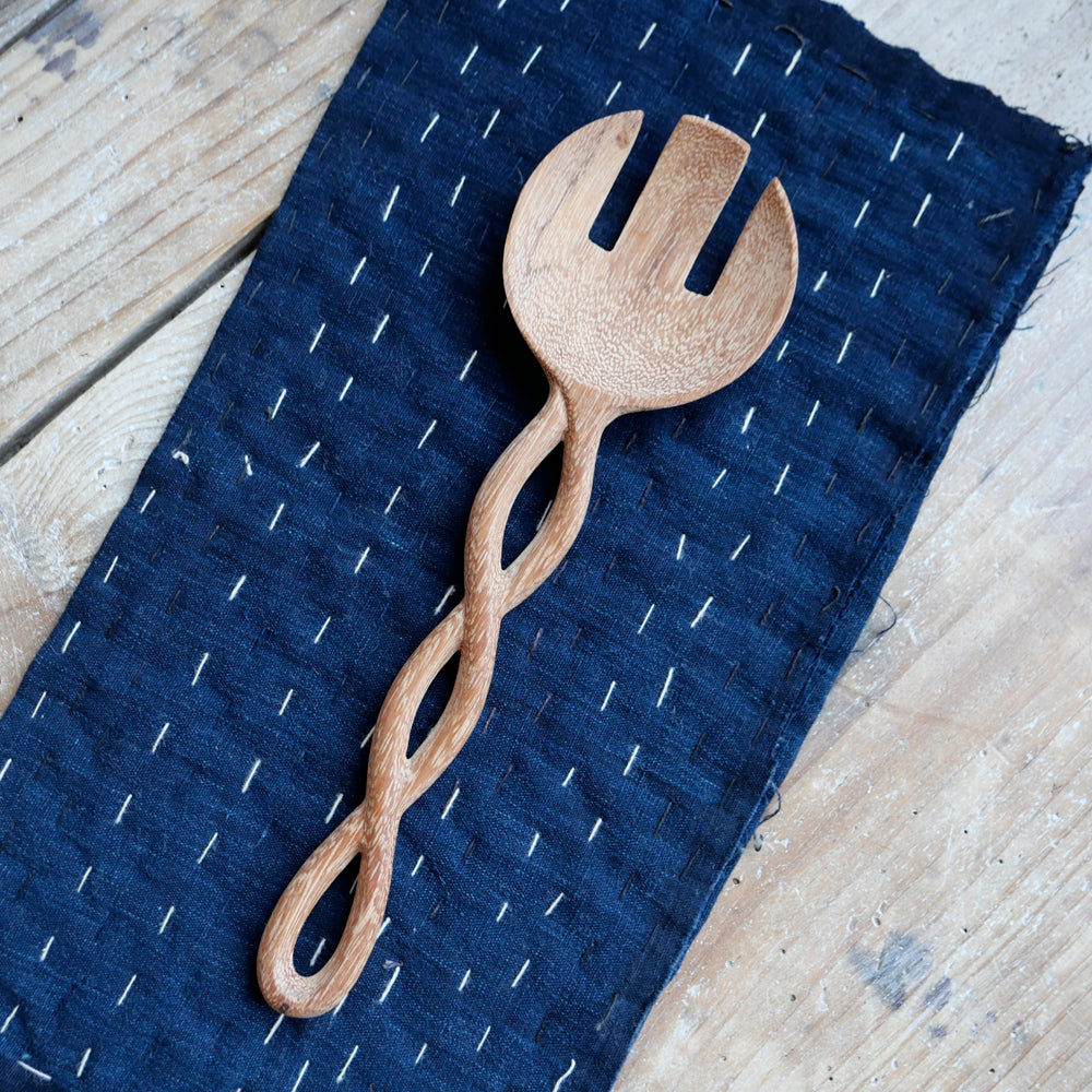 豪快なカーブを描いた可愛らしさ満点のドウシェ材のサラダスプーン。 2 本でサラダを取り分けるものですが、1本からご購入頂けます。ドウシェ材は明るいオシャレな色合いで、 とても硬くて丈夫な木材で、 キッチンに抜群のインテリア効果をもたらしてくれます。自然由来のオイルを塗ってあげると長持ちします。