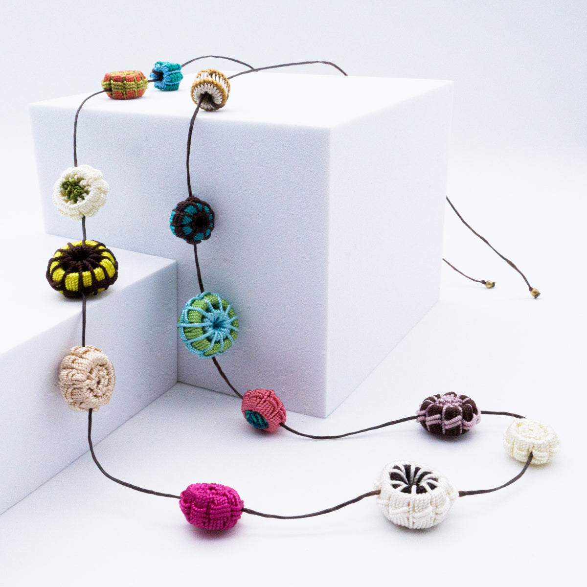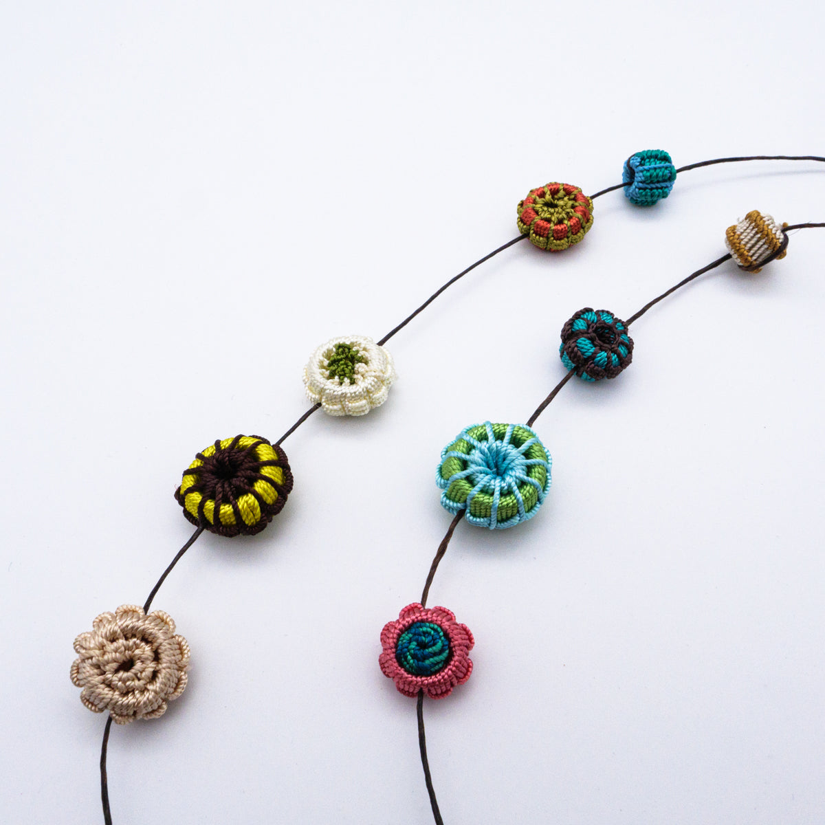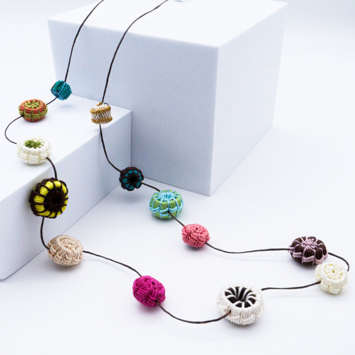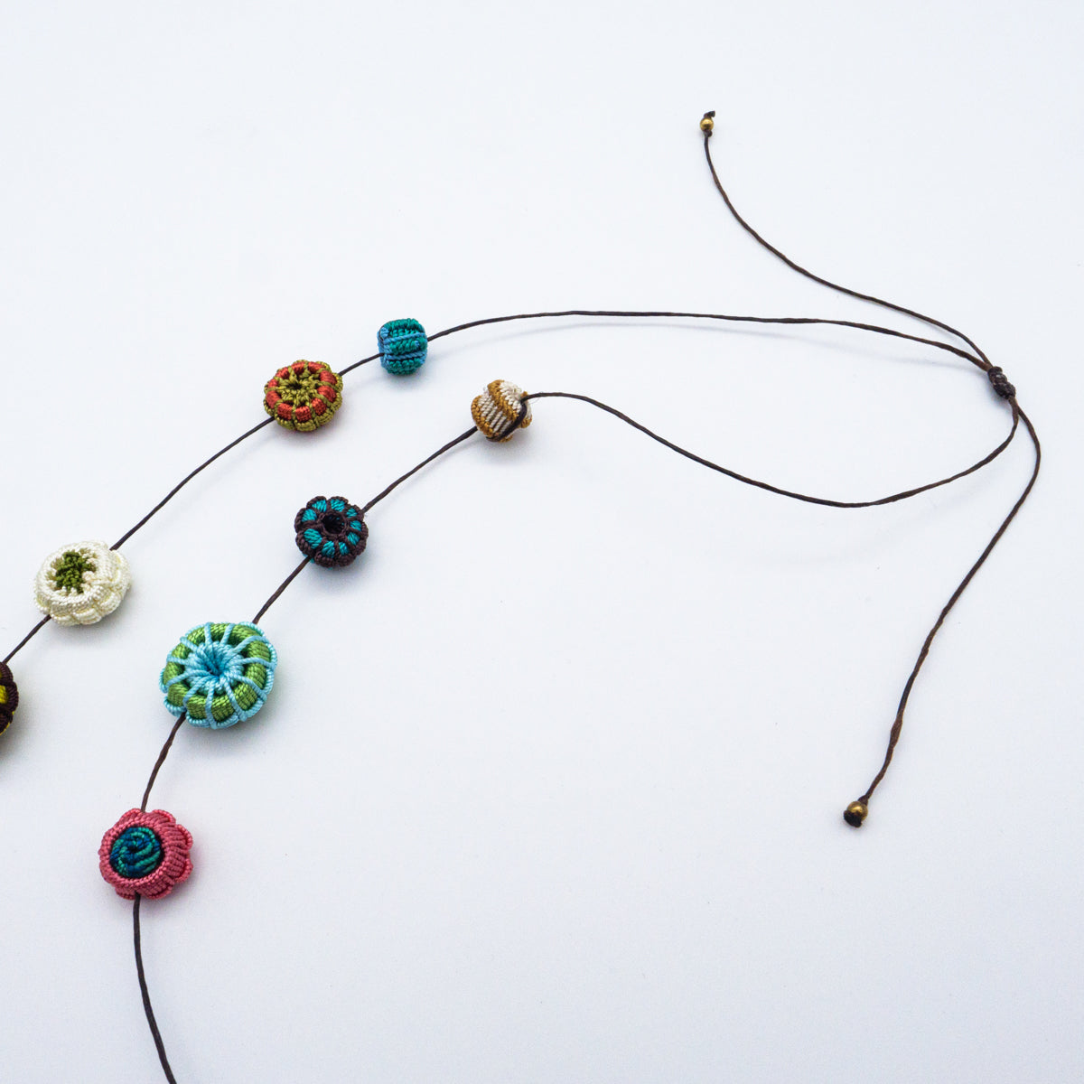 モロッコの女性たちが細い針で手編みして作っている、サボテンの繊維で作られたボタンを、東京のアトリエサジさんによりアクセサリーにしたもの。とても軽量でどんな装いにもあわせやすいのでオススメです。こちらのネックレスは平面のモロッコボタンを使用したシリーズで、紐には蝋引きがされており、長さの調節が可能です。