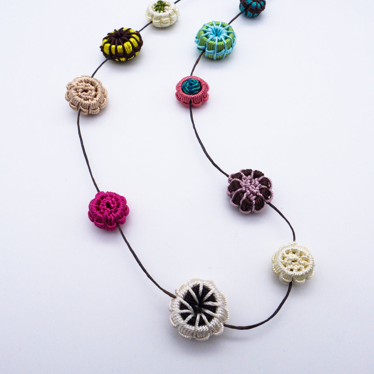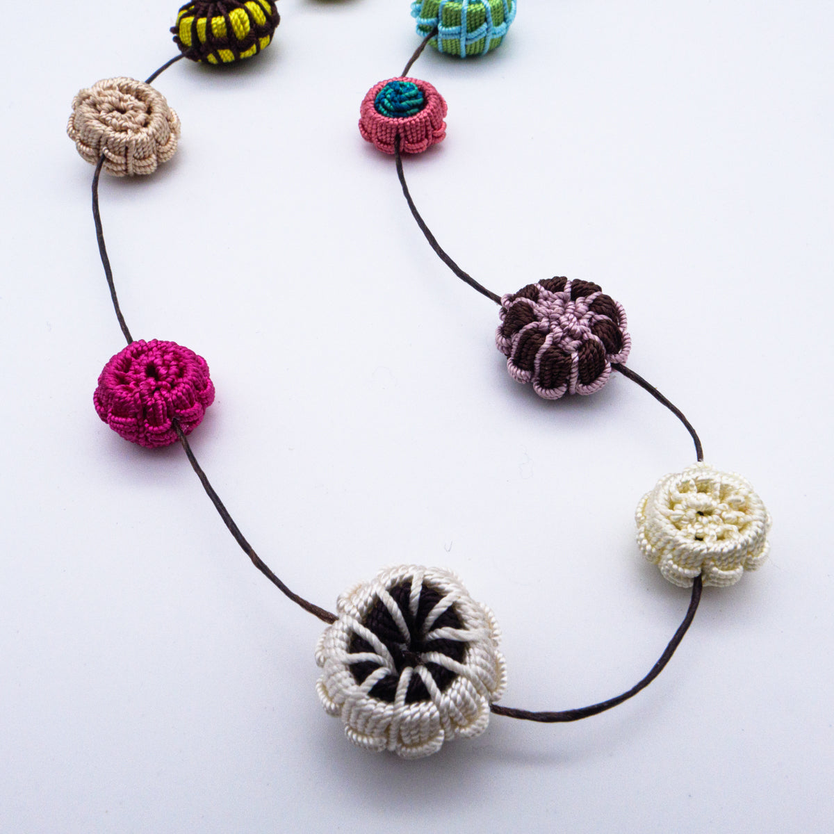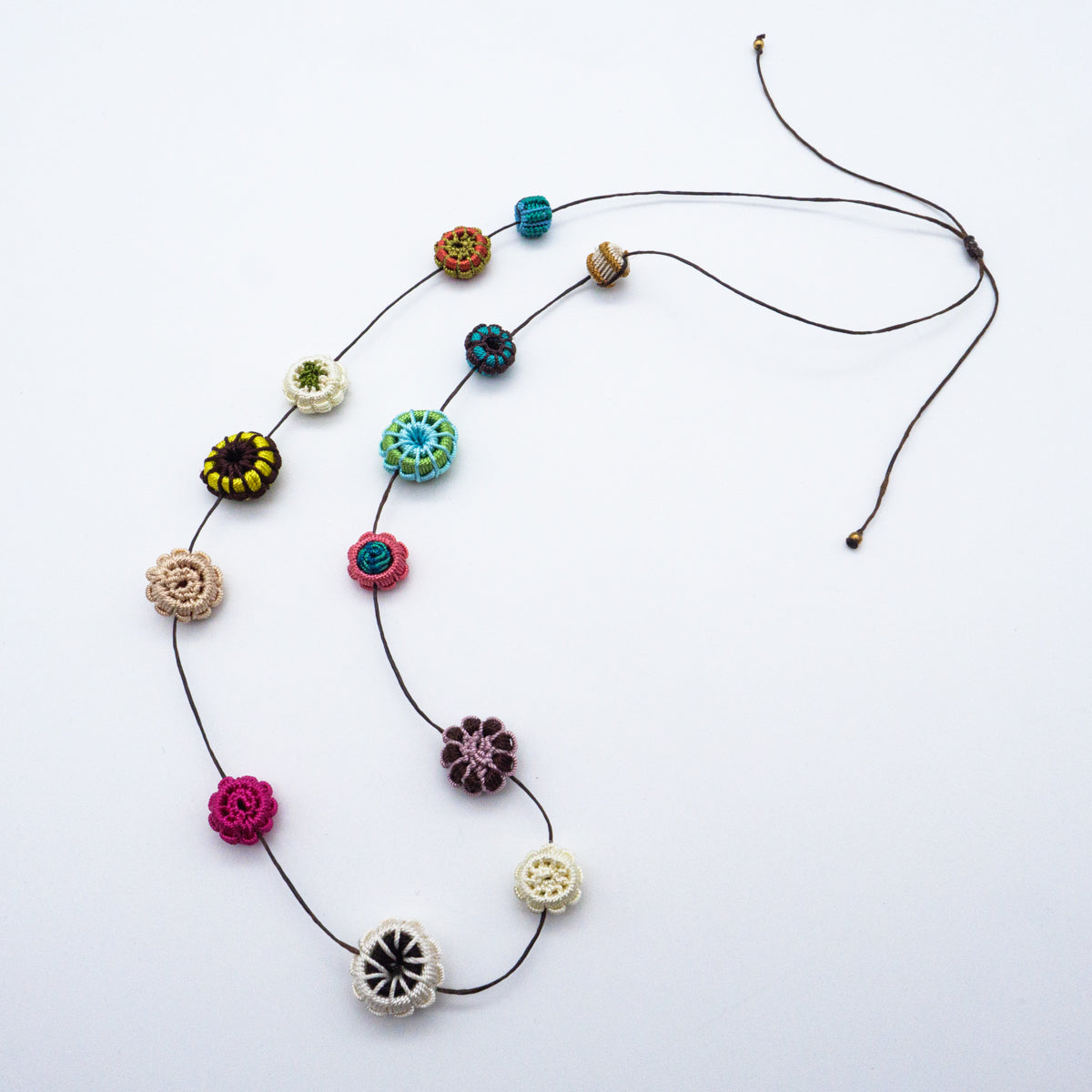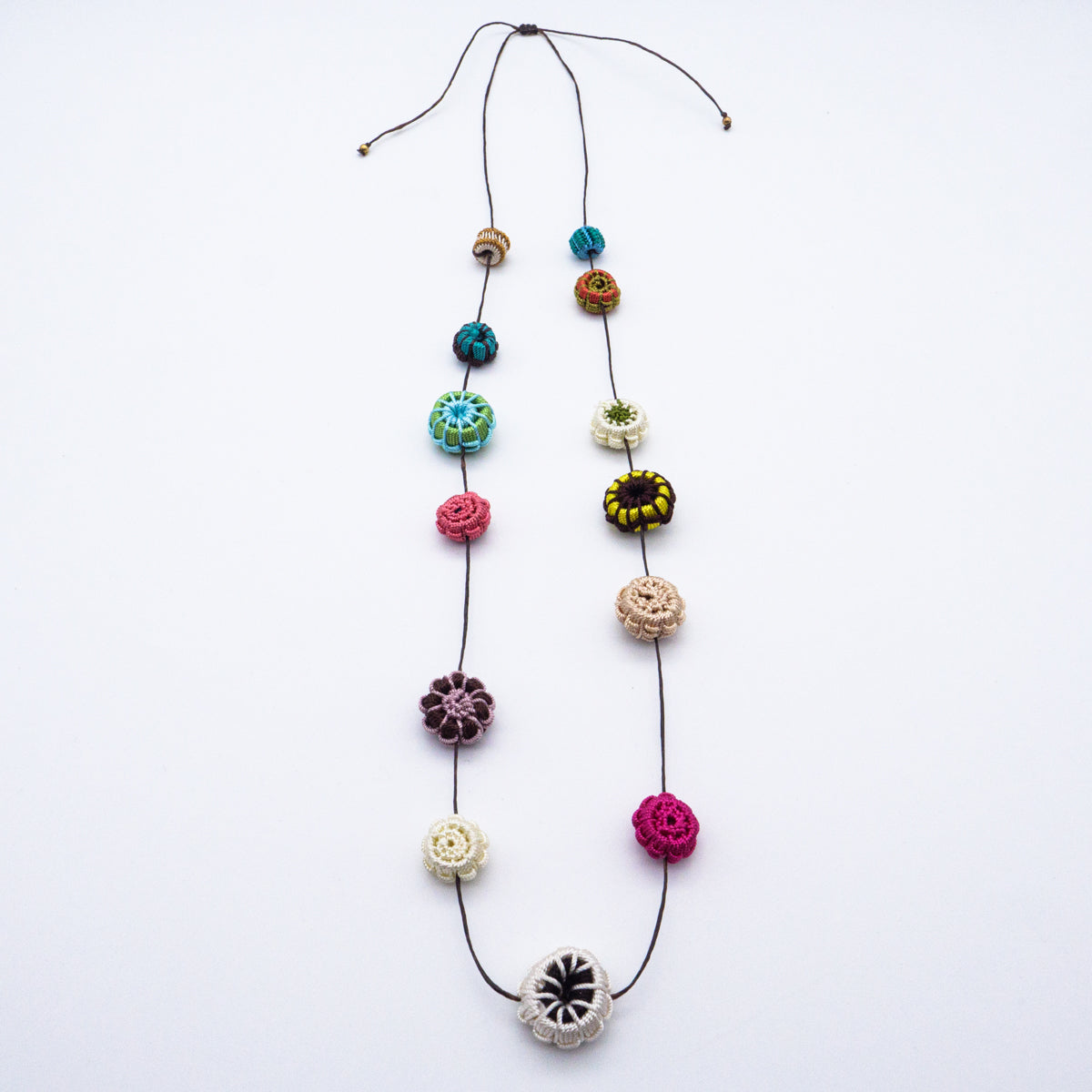 モロッコの女性たちが細い針で手編みして作っている、サボテンの繊維で作られたボタンを、東京のアトリエサジさんによりアクセサリーにしたもの。とても軽量でどんな装いにもあわせやすいのでオススメです。こちらのネックレスは平面のモロッコボタンを使用したシリーズで、紐には蝋引きがされており、長さの調節が可能です。