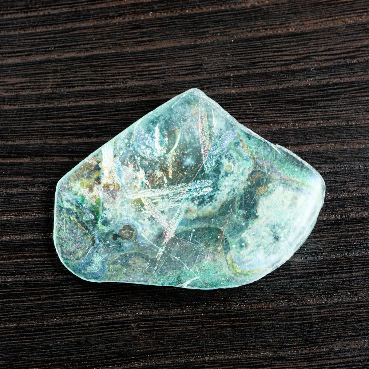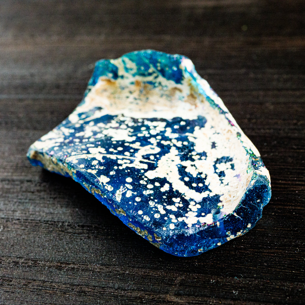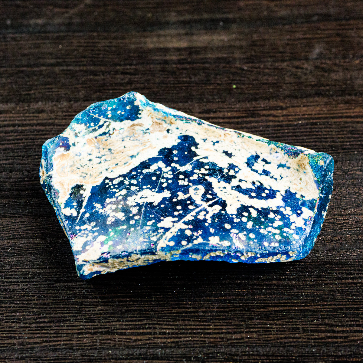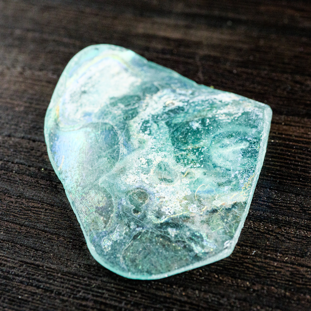 今から約1600年から2000年前のローマ時代からササン朝ペルシャ時代にかけて作られたガラス製品はローマングラスと呼ばれています。時代に渡る厳しい自然の中で、砂はガラスの表面に化学反応を起こさせ、銀化と云われる荘厳な輝きを与えました。こちらはその美しい破片たちになり、中くらいのサイズのものになります。