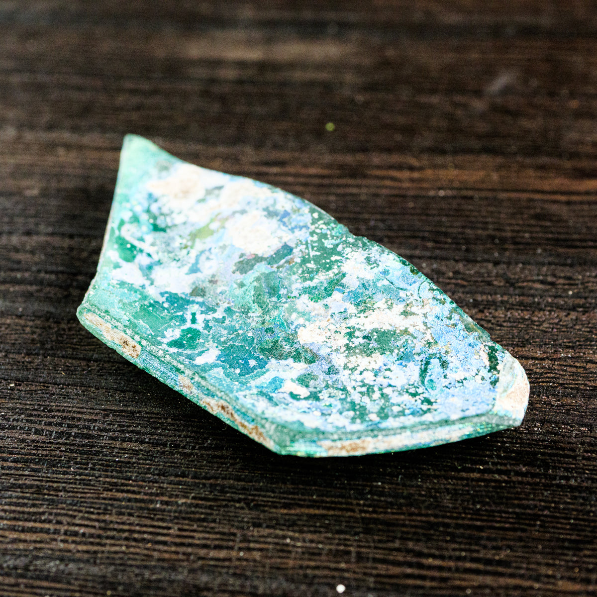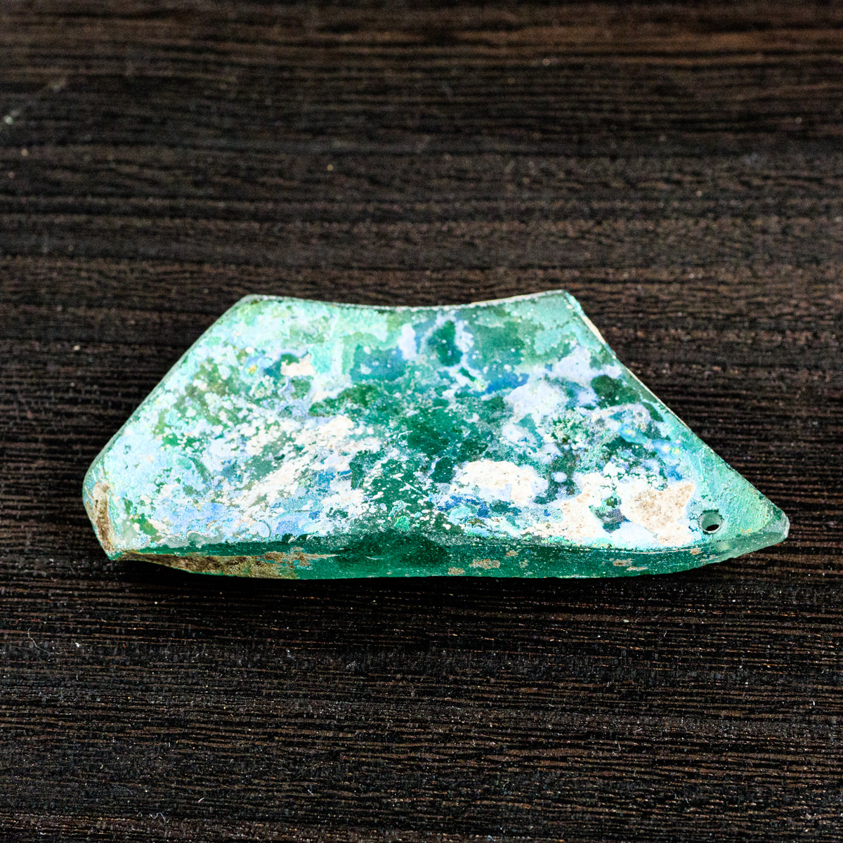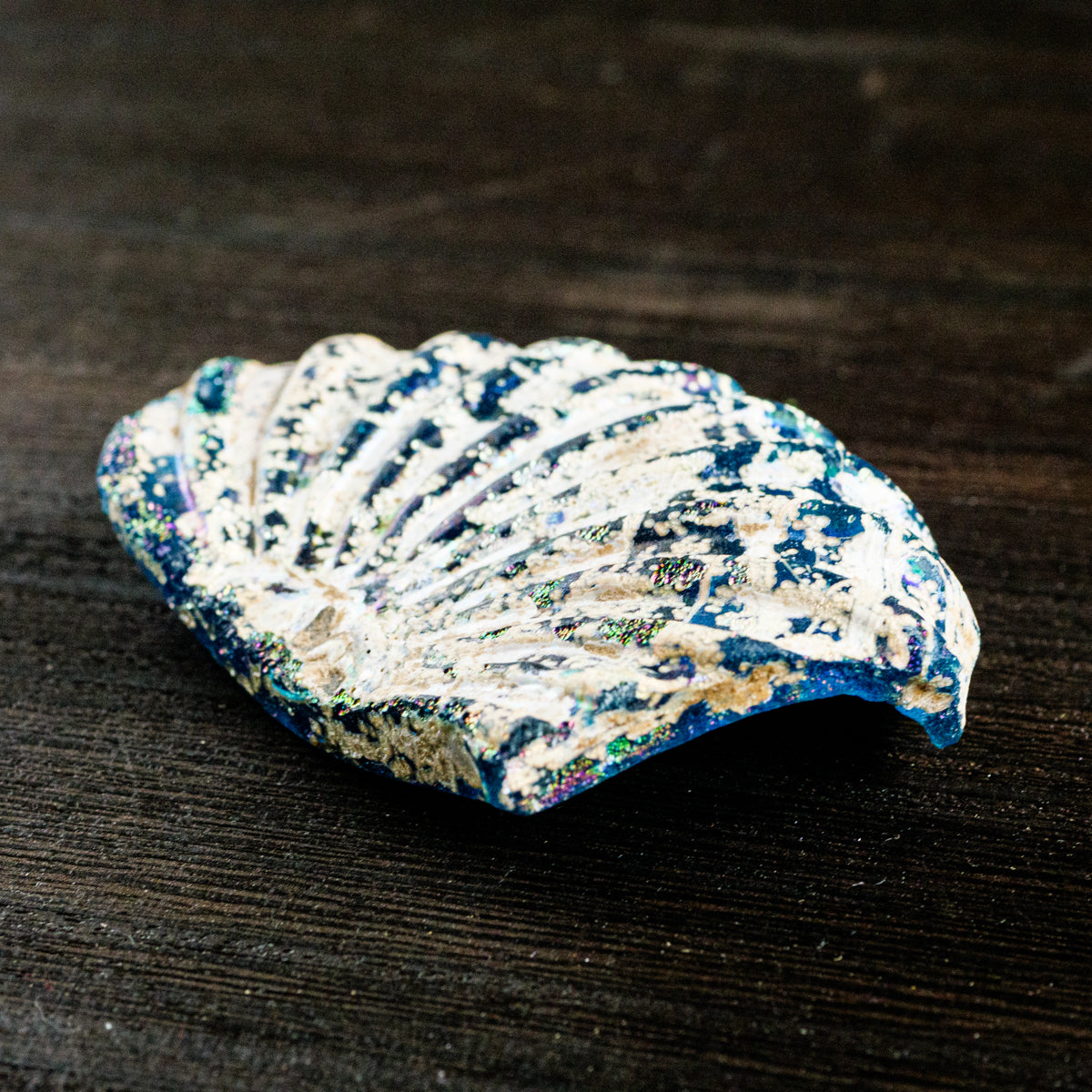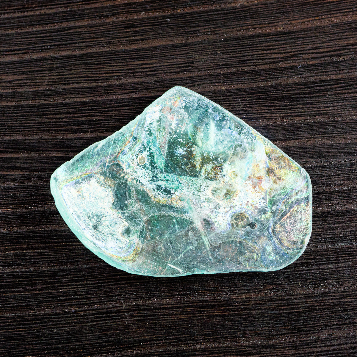 今から約1600年から2000年前のローマ時代からササン朝ペルシャ時代にかけて作られたガラス製品はローマングラスと呼ばれています。時代に渡る厳しい自然の中で、砂はガラスの表面に化学反応を起こさせ、銀化と云われる荘厳な輝きを与えました。こちらはその美しい破片たちになり、中くらいのサイズのものになります。
