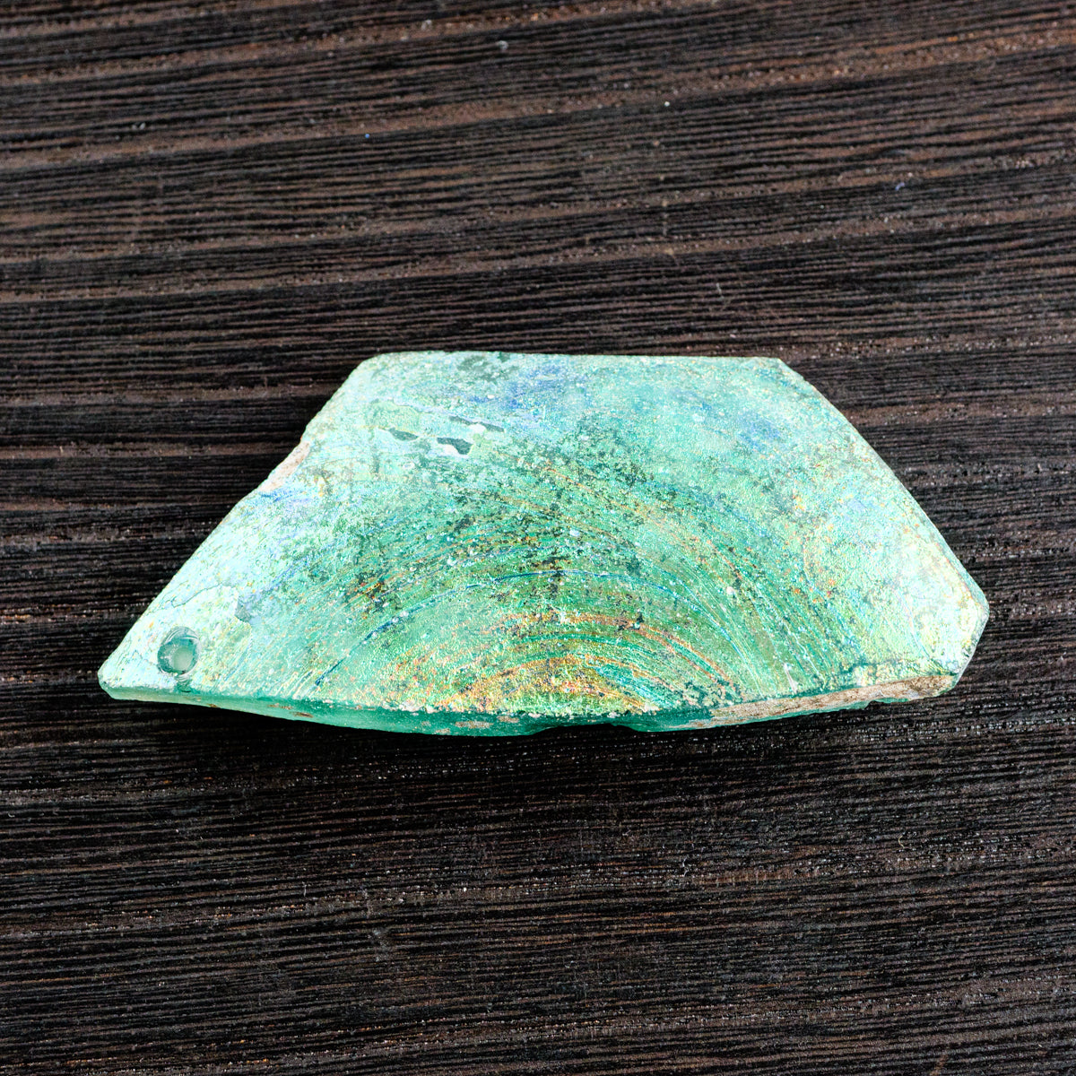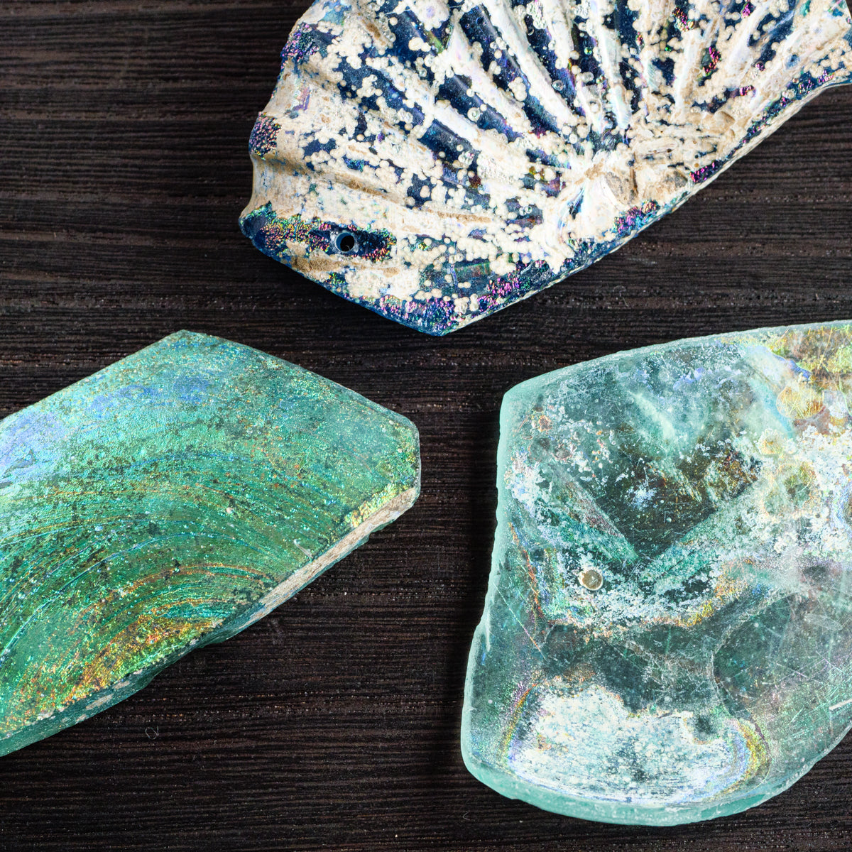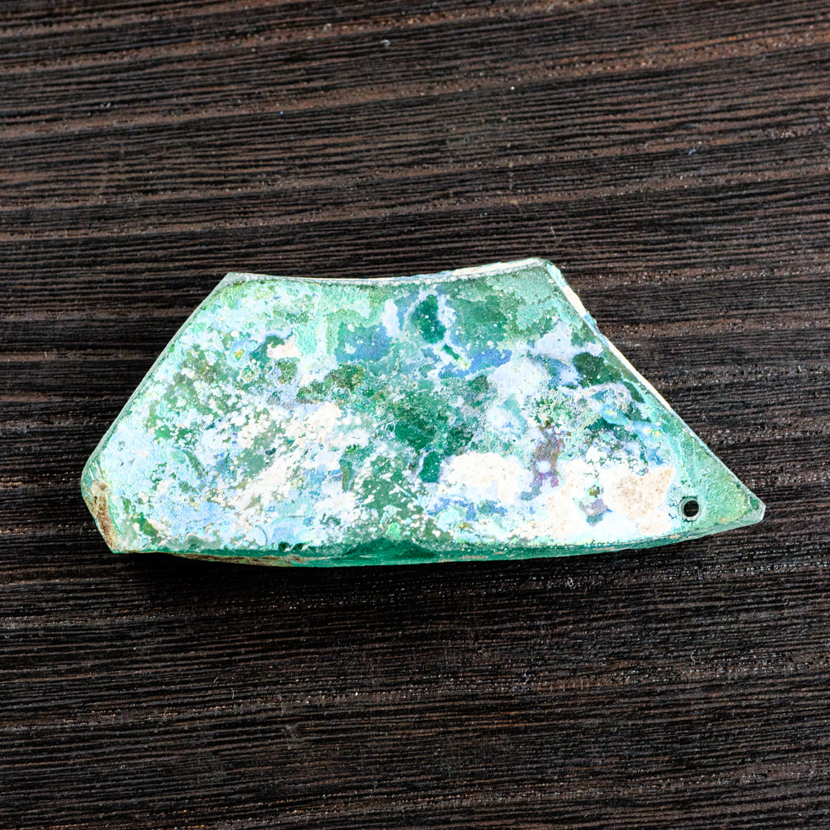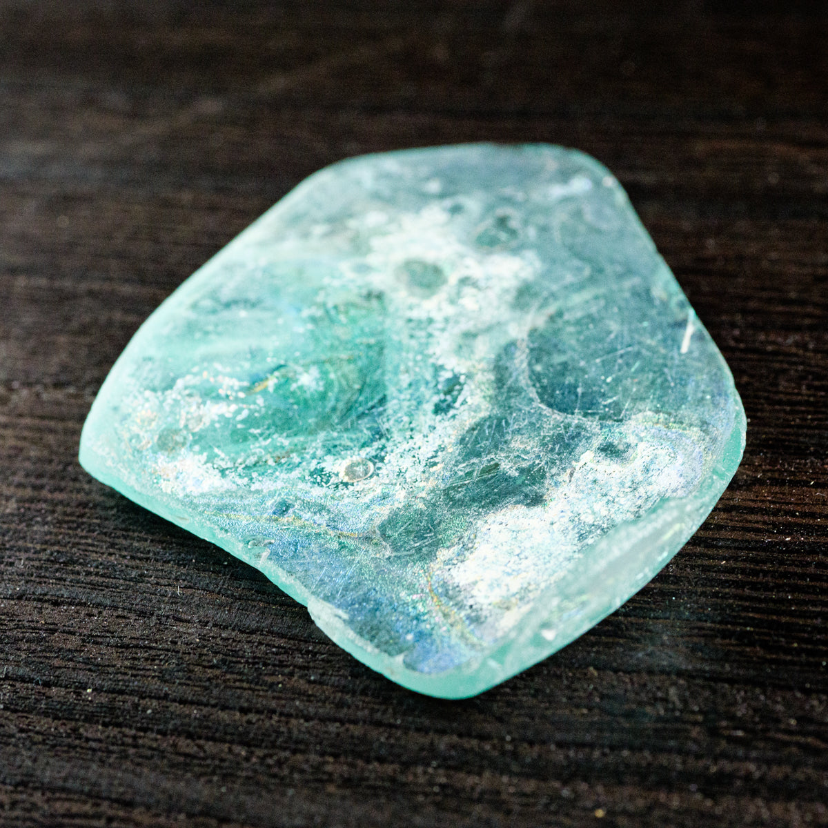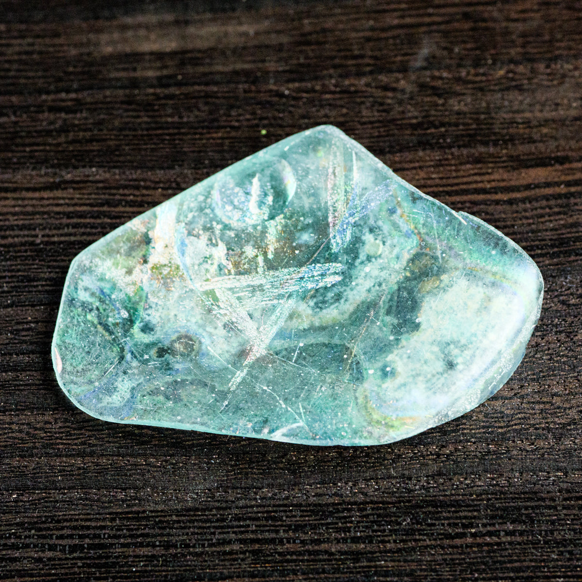 今から約1600年から2000年前のローマ時代からササン朝ペルシャ時代にかけて作られたガラス製品はローマングラスと呼ばれています。時代に渡る厳しい自然の中で、砂はガラスの表面に化学反応を起こさせ、銀化と云われる荘厳な輝きを与えました。こちらはその美しい破片たちになり、中くらいのサイズのものになります。