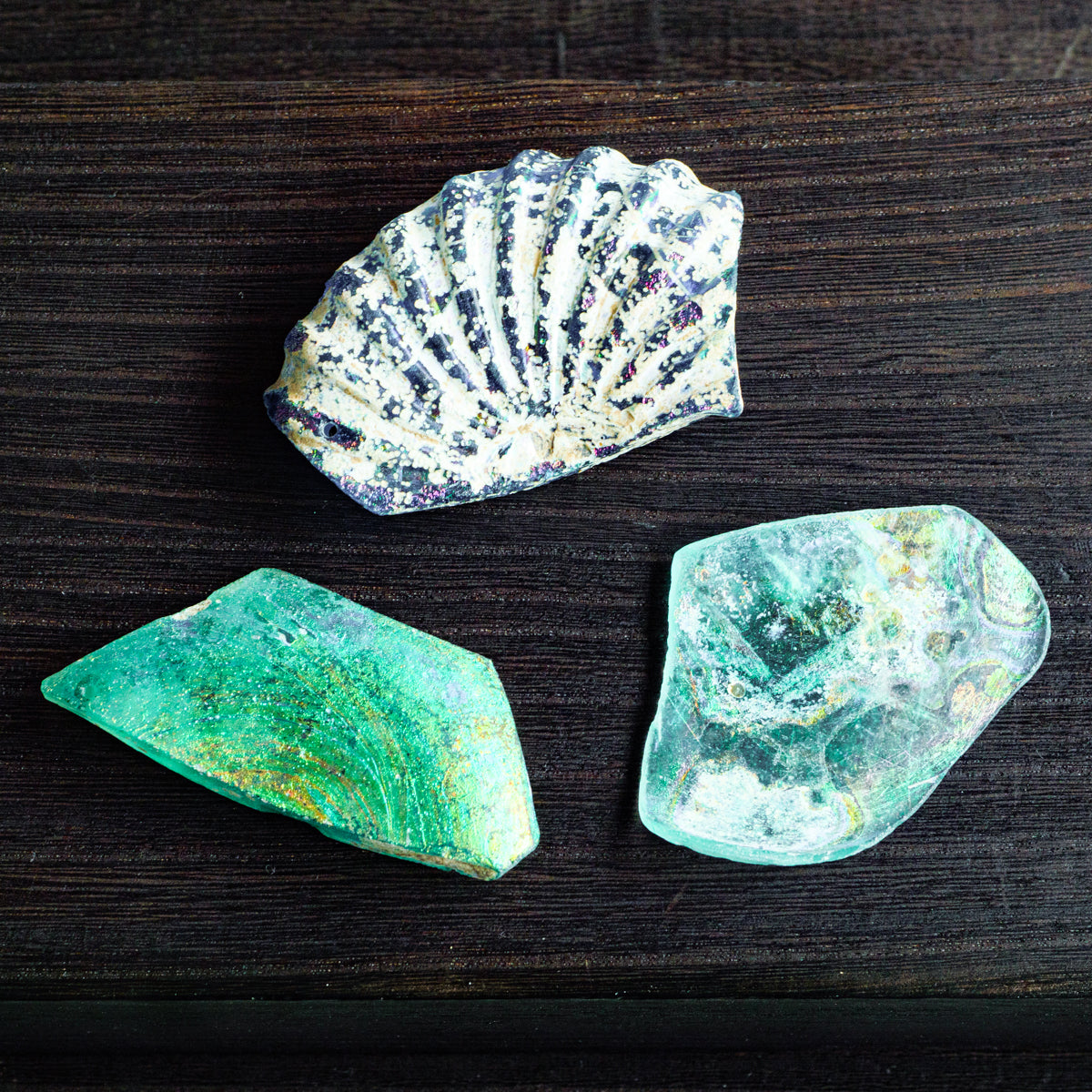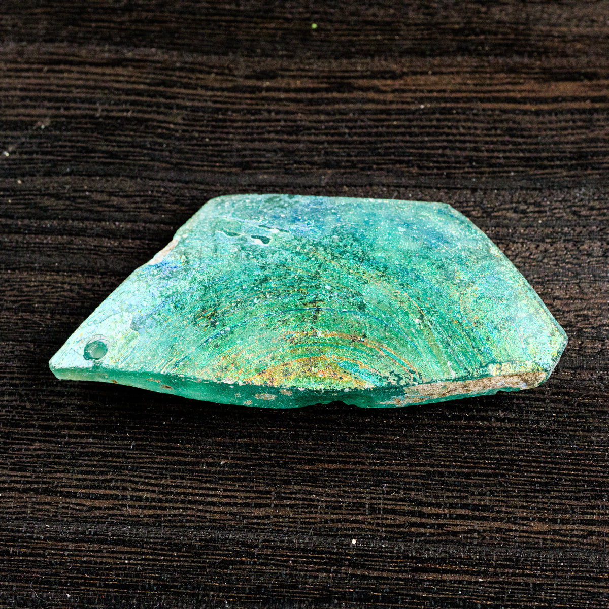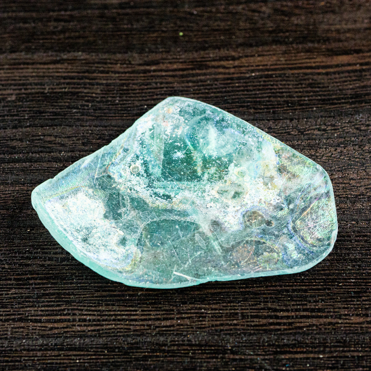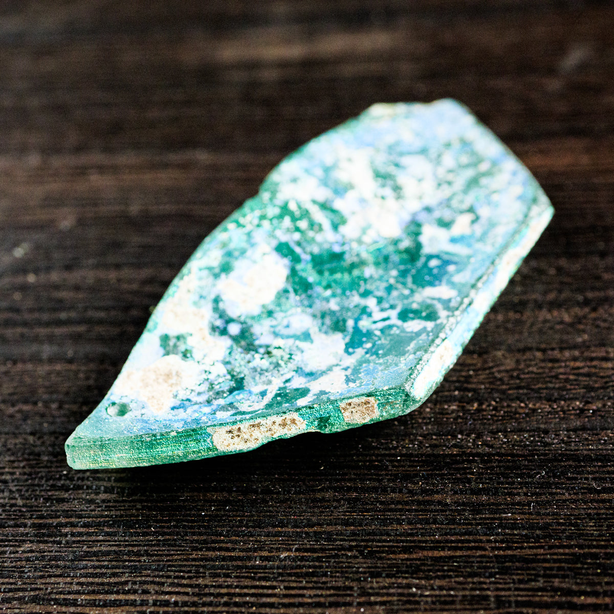 今から約1600年から2000年前のローマ時代からササン朝ペルシャ時代にかけて作られたガラス製品はローマングラスと呼ばれています。時代に渡る厳しい自然の中で、砂はガラスの表面に化学反応を起こさせ、銀化と云われる荘厳な輝きを与えました。こちらはその美しい破片たちになり、中くらいのサイズのものになります。