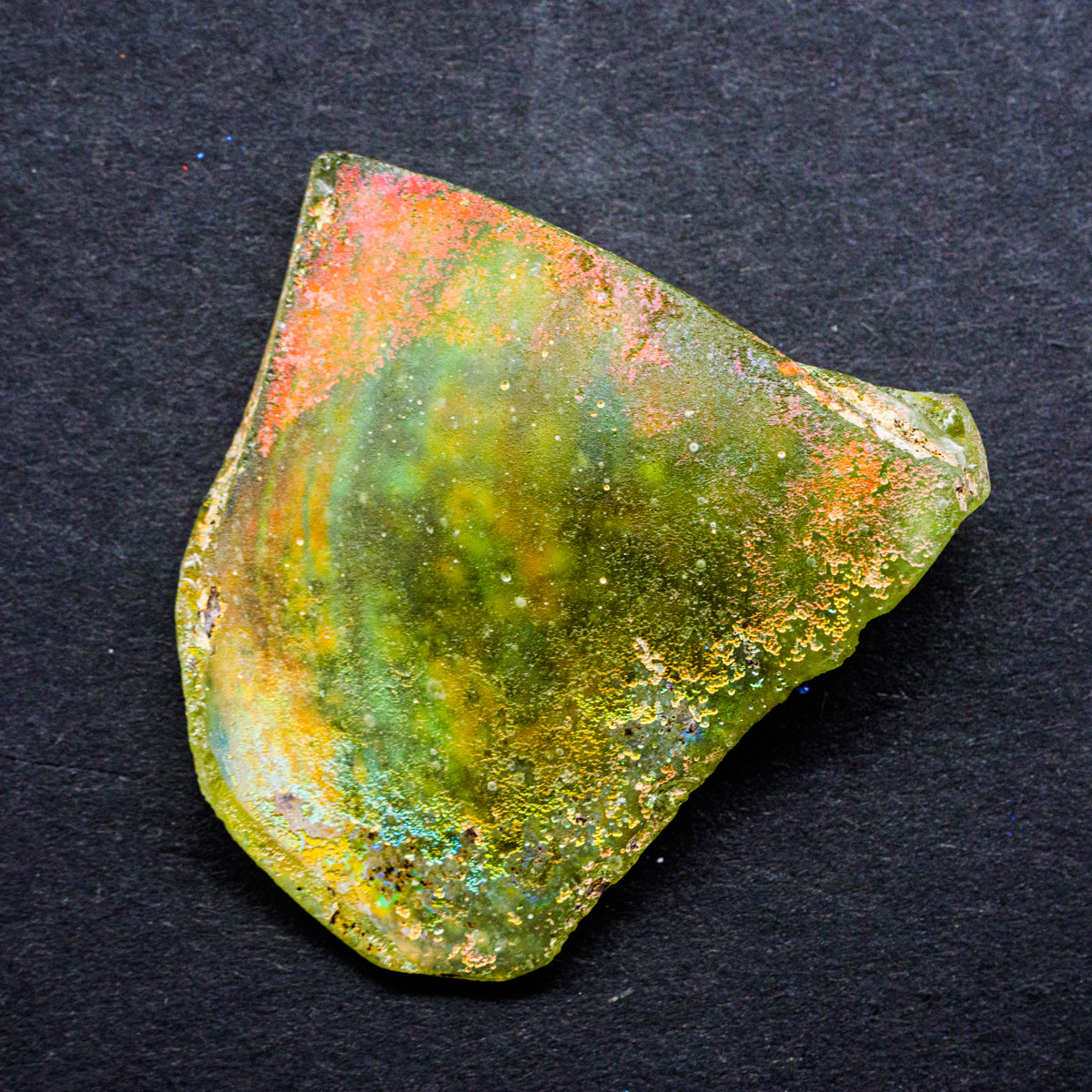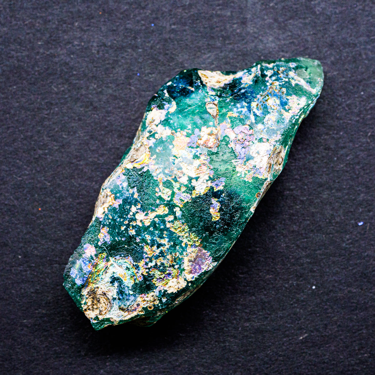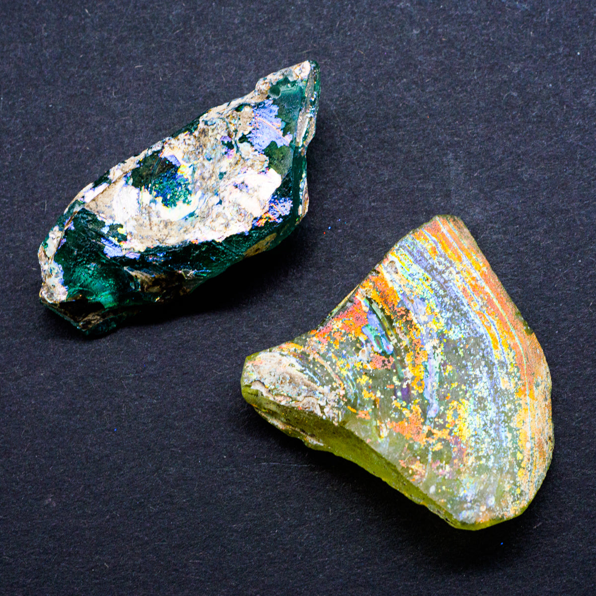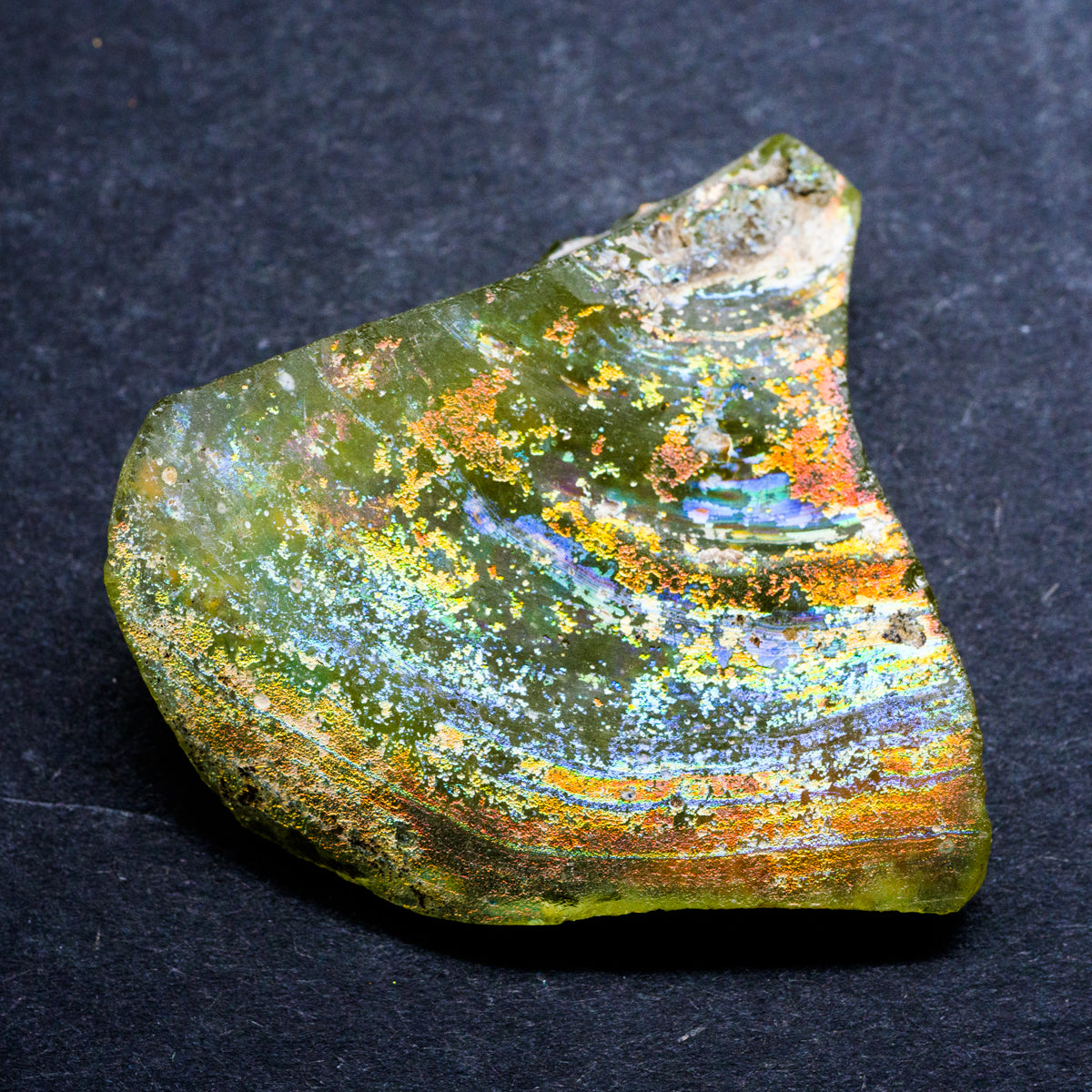 今から約1600年から2000年前のローマ時代からササン朝ペルシャ時代にかけて作られたガラス製品はローマングラスと呼ばれています。時代に渡る厳しい自然の中で、砂はガラスの表面に化学反応を起こさせ、銀化と云われる荘厳な輝きを与えました。こちらはその美しい破片たちになり、小ぶりのものです。