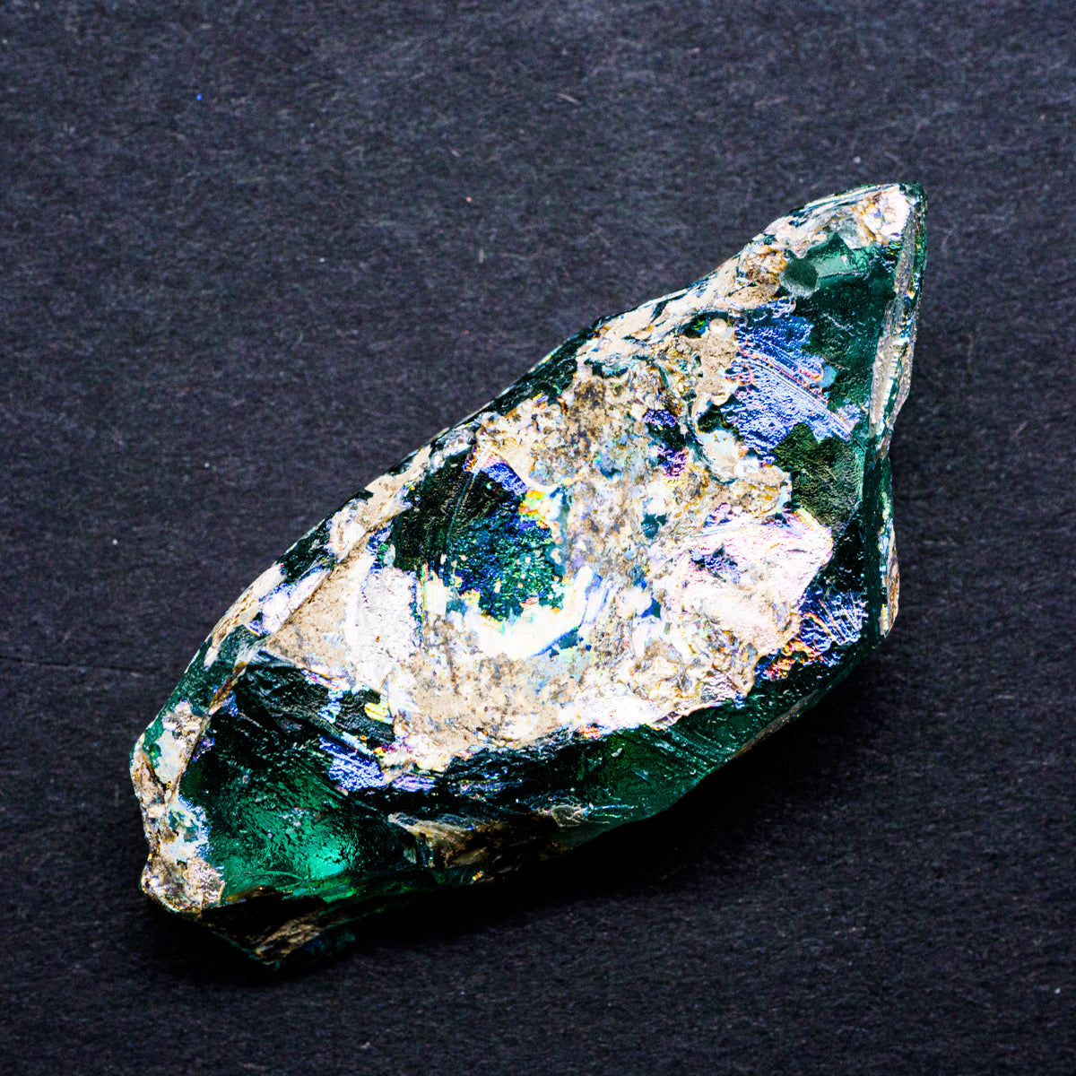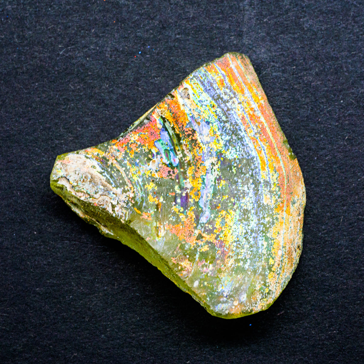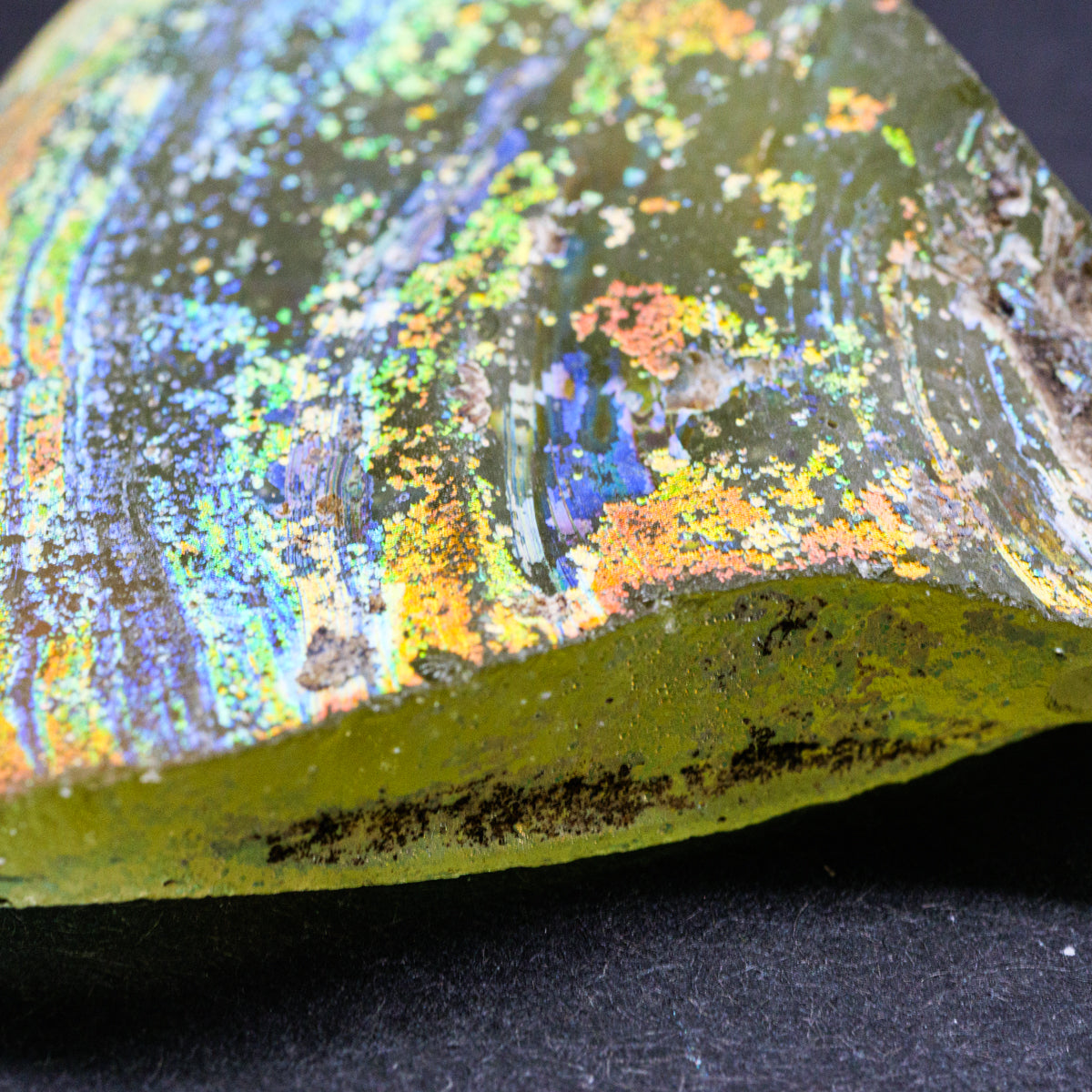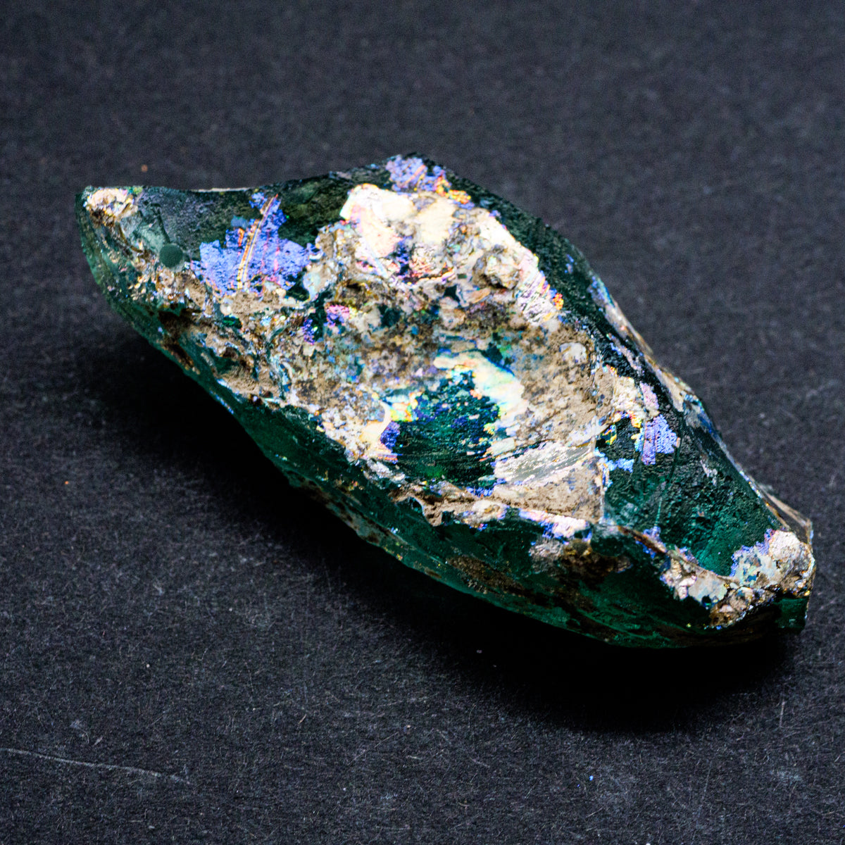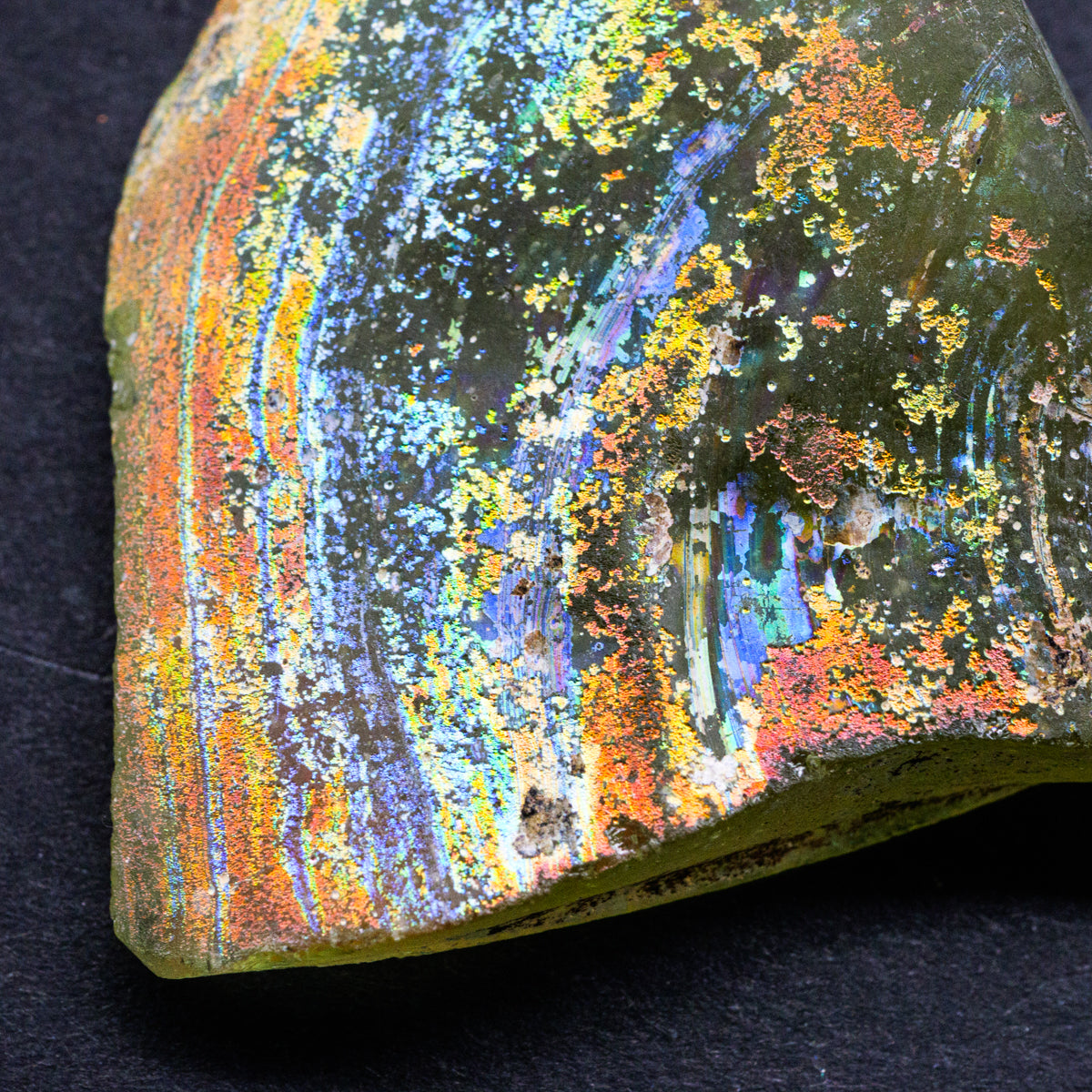 今から約1600年から2000年前のローマ時代からササン朝ペルシャ時代にかけて作られたガラス製品はローマングラスと呼ばれています。時代に渡る厳しい自然の中で、砂はガラスの表面に化学反応を起こさせ、銀化と云われる荘厳な輝きを与えました。こちらはその美しい破片たちになり、小ぶりのものです。