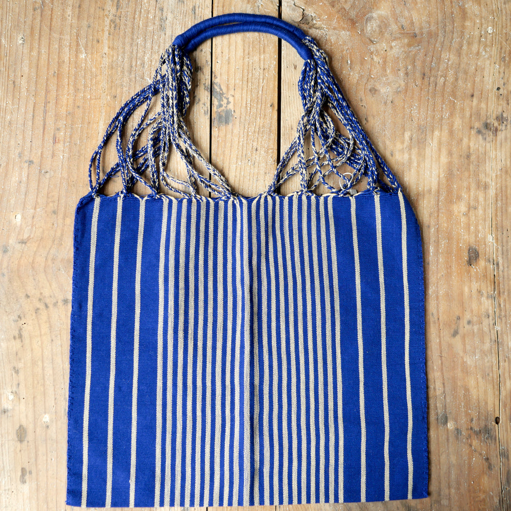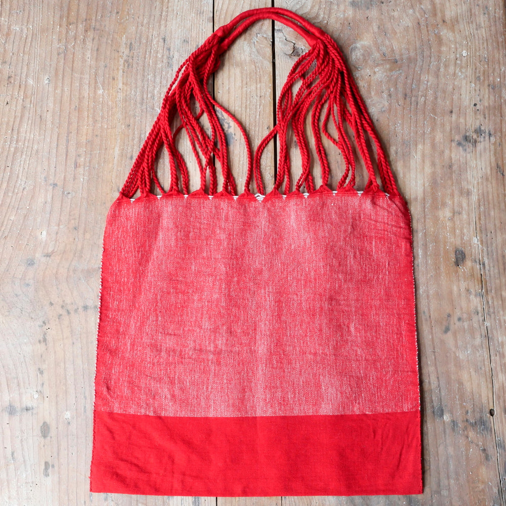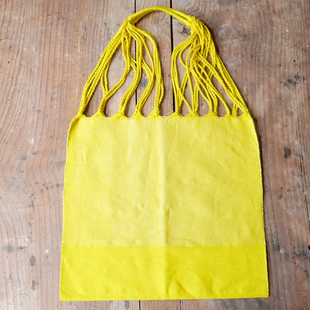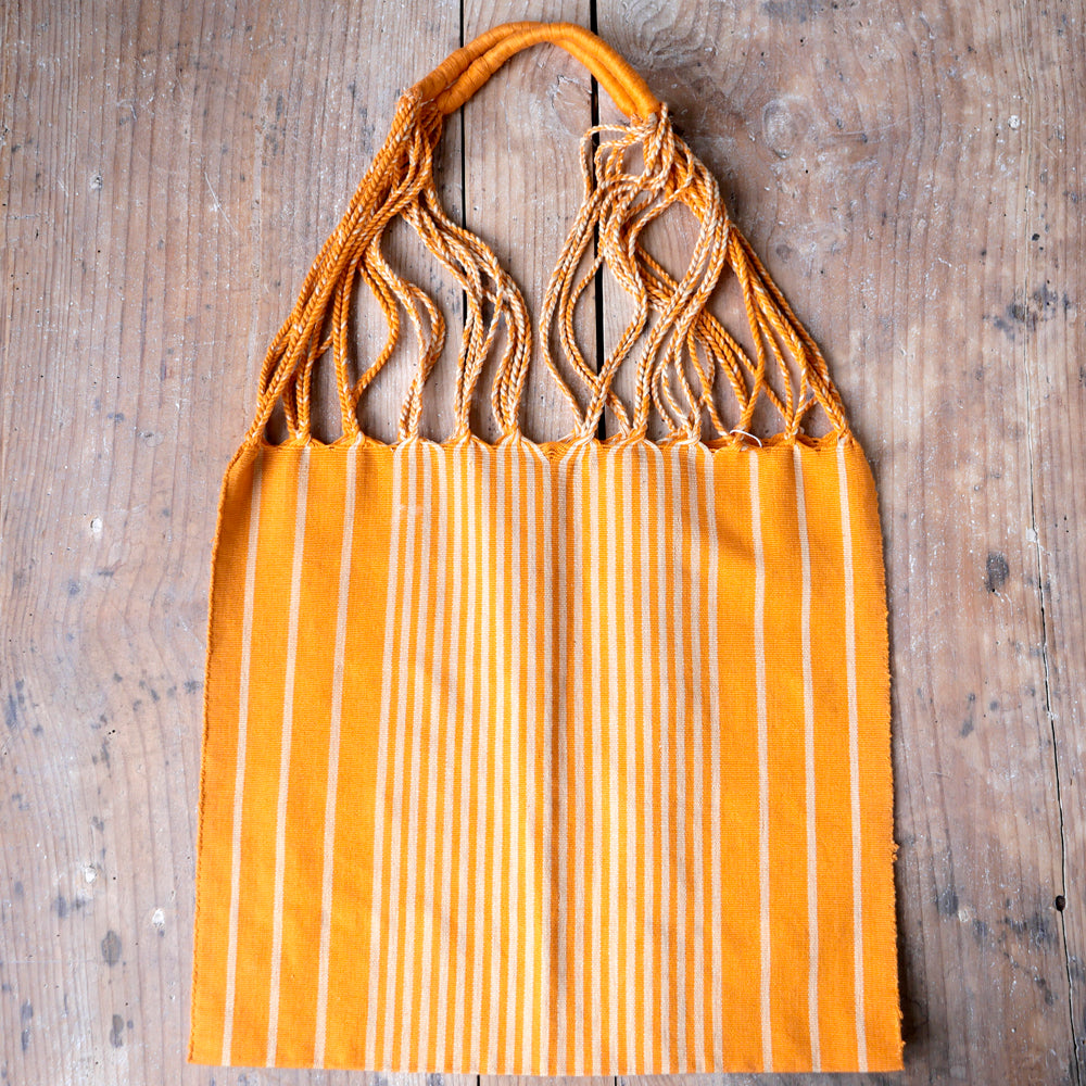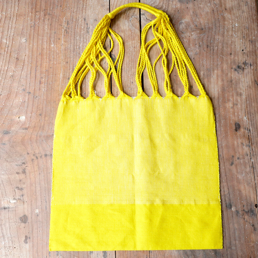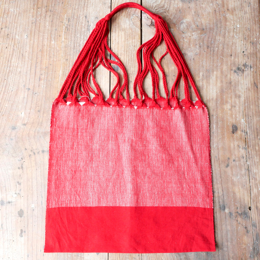大人気のメキシコはチアパス州の手織り生地を使用したハンモックバッグ。上から広げると、まるでハンモックのような形をしております。布端のフリンジを持ち手にした独創的なデザインがなんとも可愛らしいです。マチはございませんが、見た目以上にたっぷり入り、物を入れた時の形もふんわりしていて綺麗です。こちらはMサイズになります。