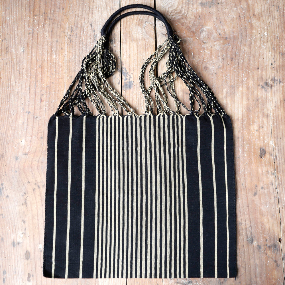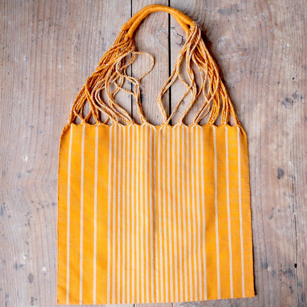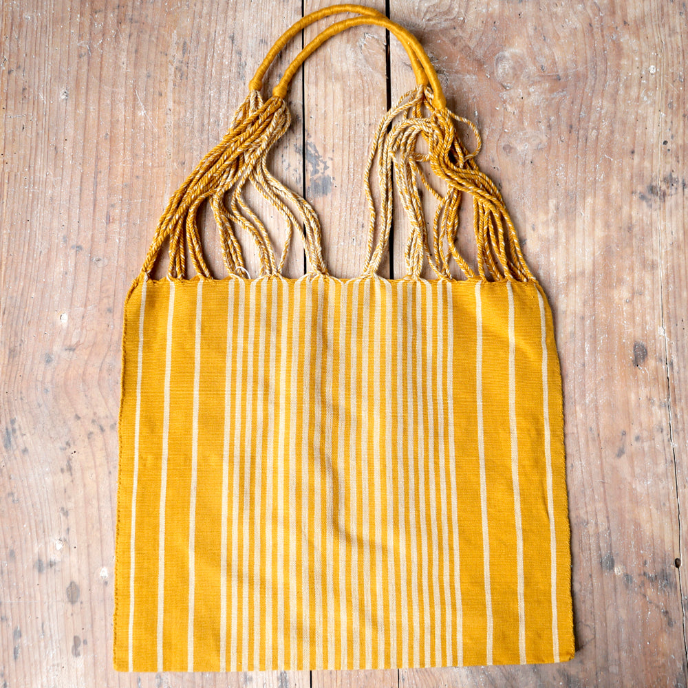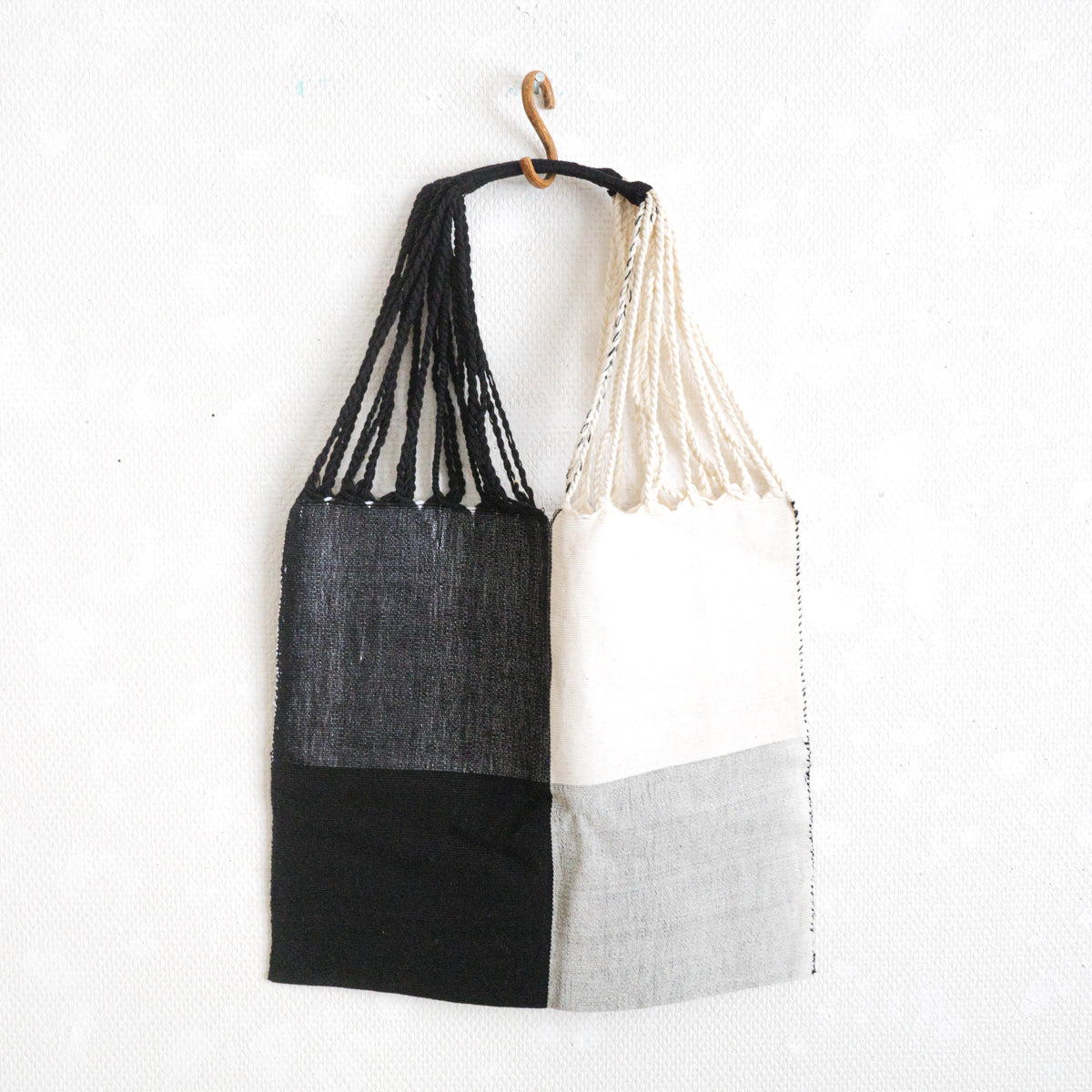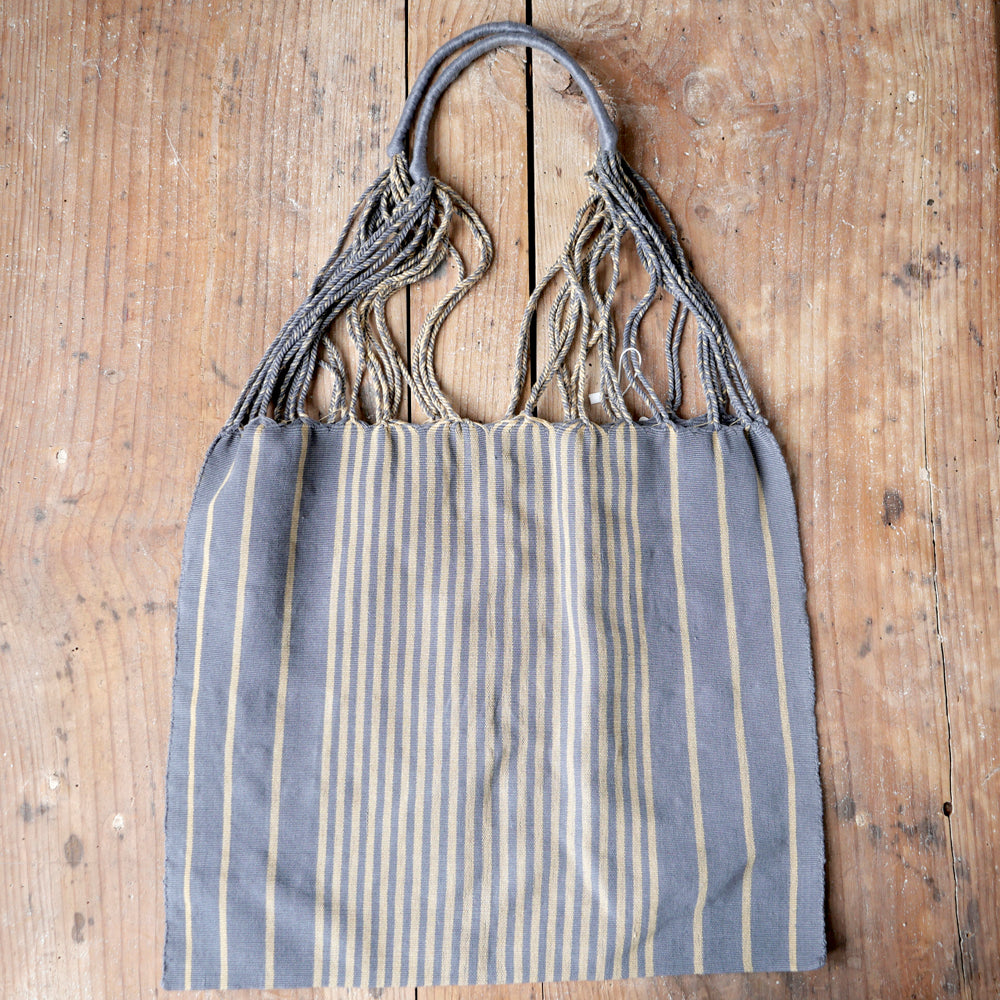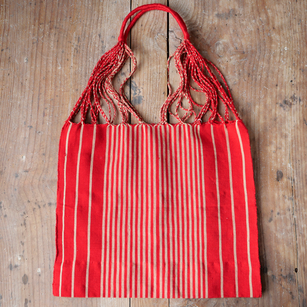 大人気のメキシコはチアパス州の手織り生地を使用したハンモックバッグ。上から広げると、まるでハンモックのような形をしております。布端のフリンジを持ち手にした独創的なデザインがなんとも可愛らしいです。マチはございませんが、見た目以上にたっぷり入り、物を入れた時の形もふんわりしていて綺麗です。こちらはMサイズになります。
