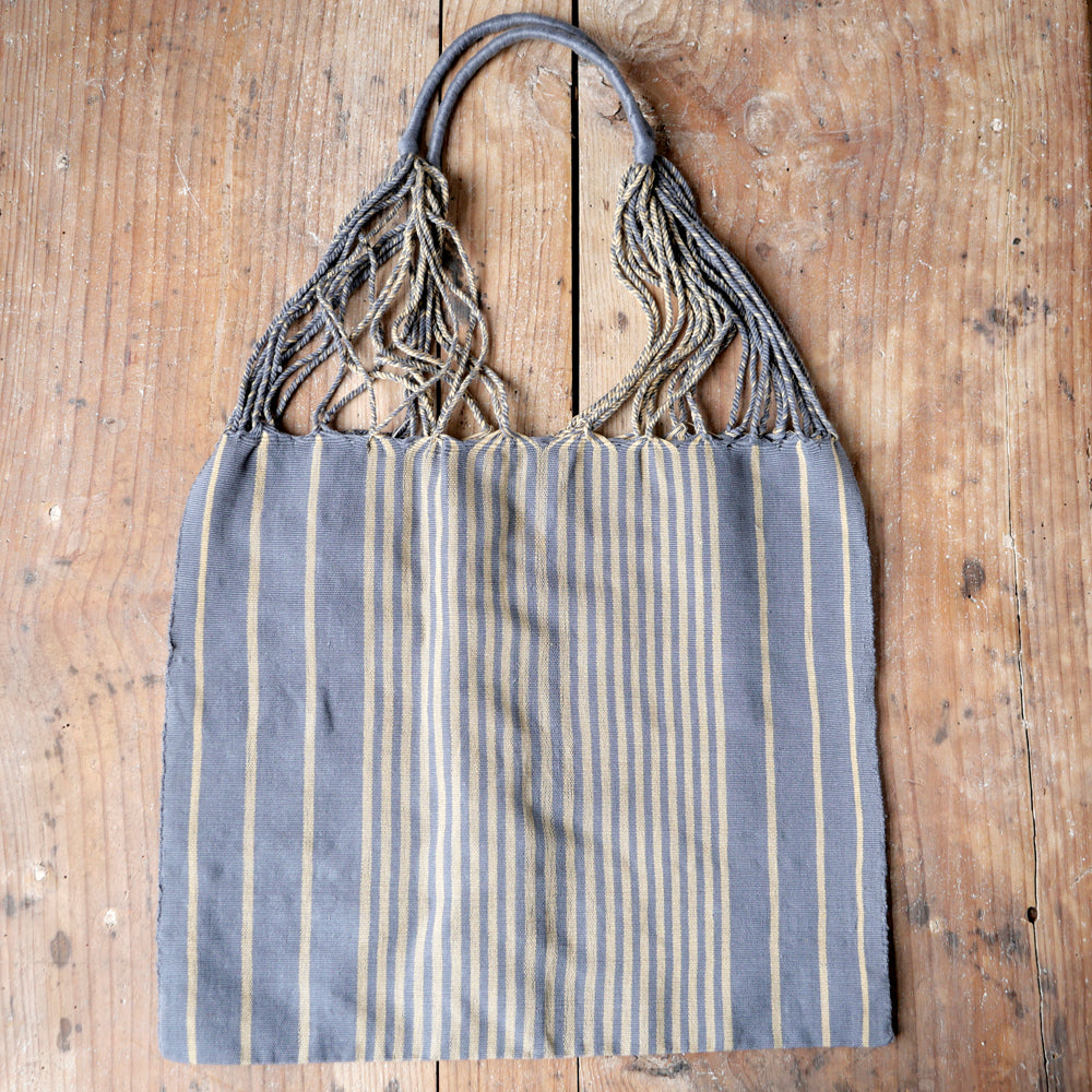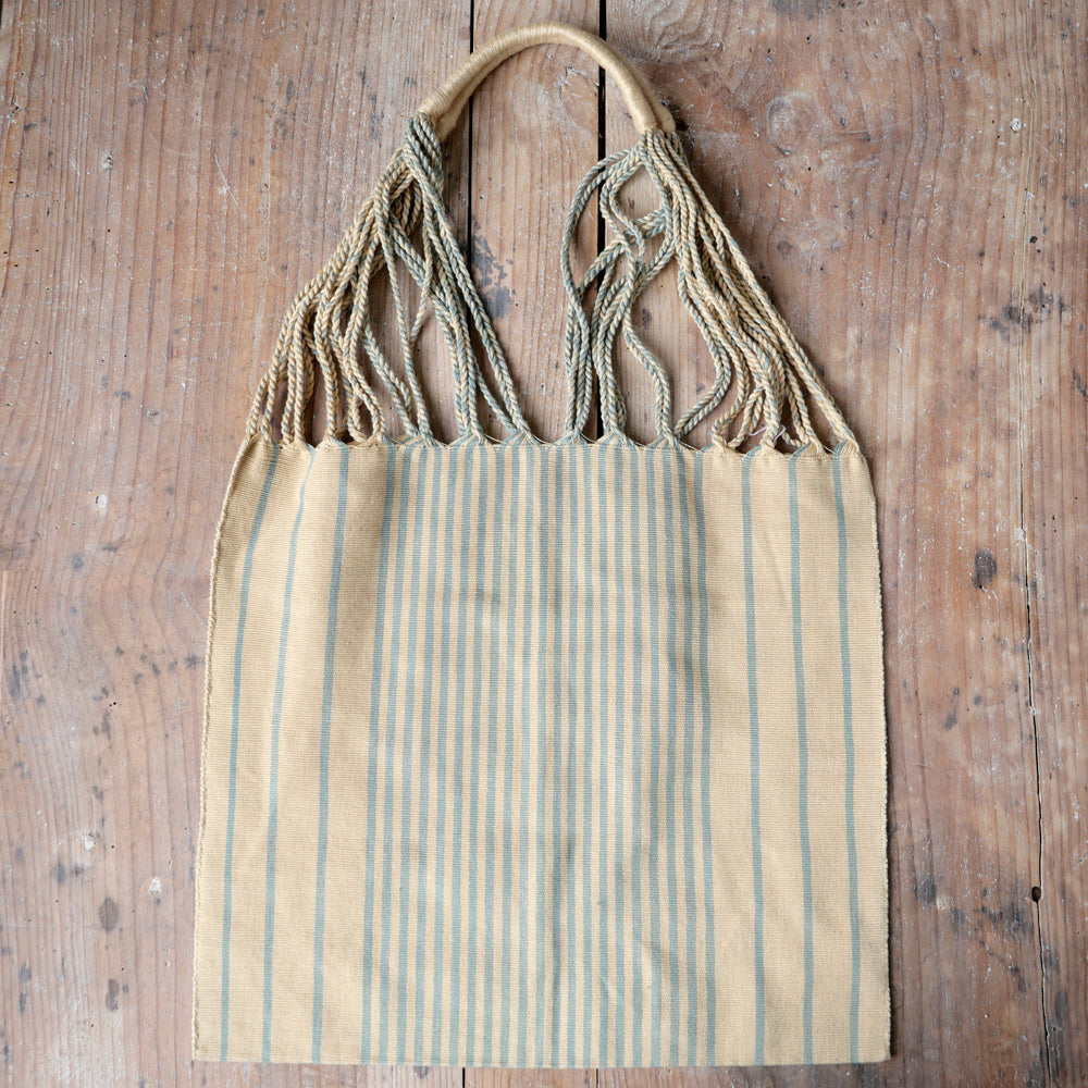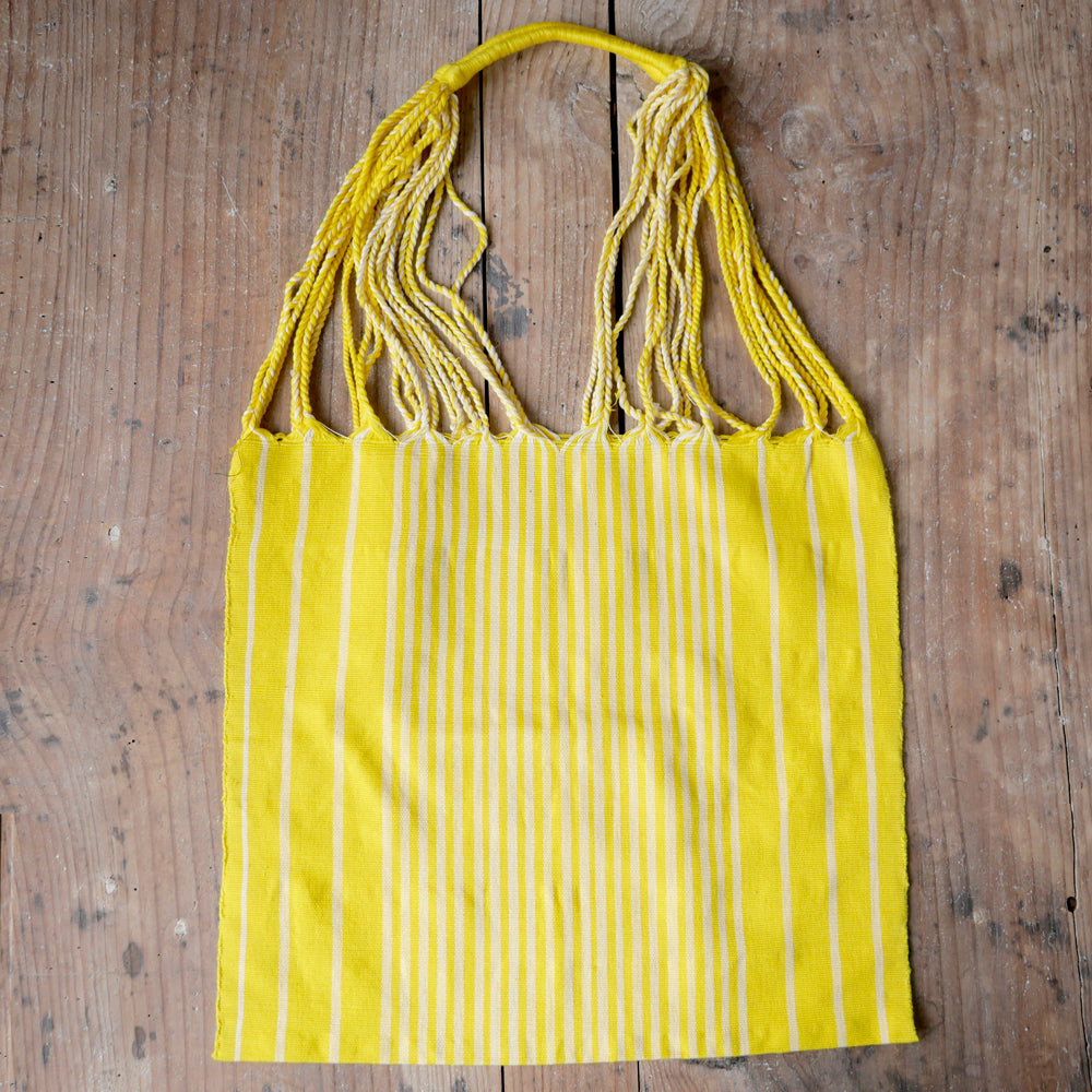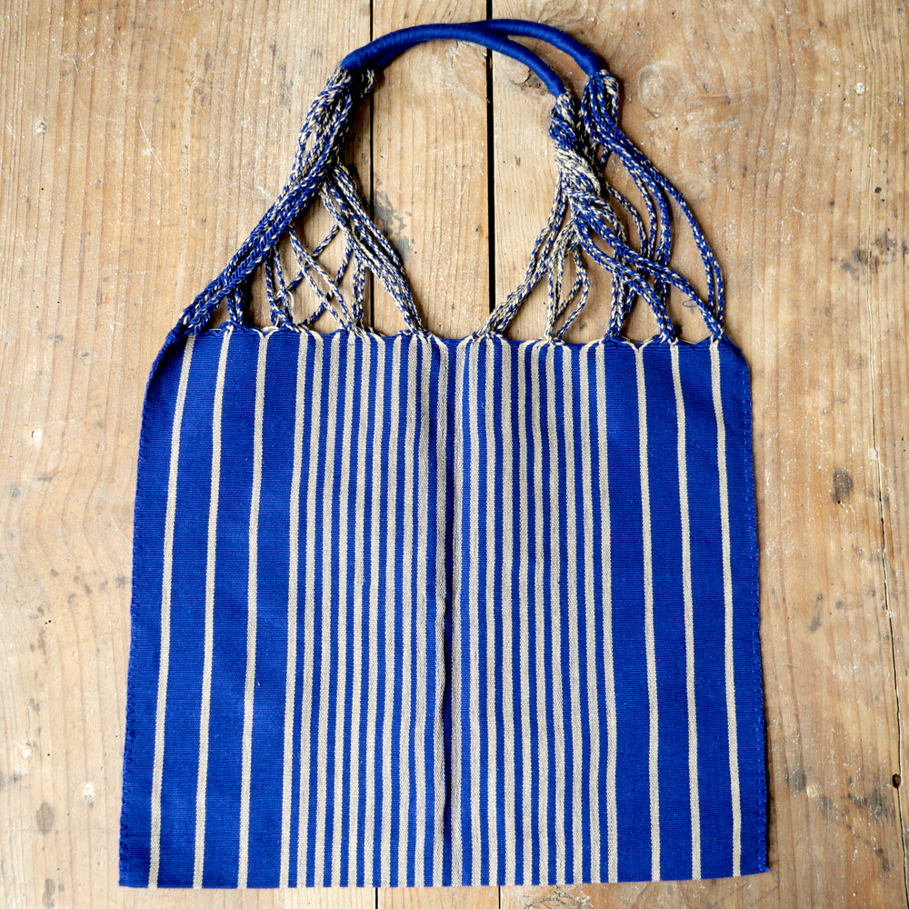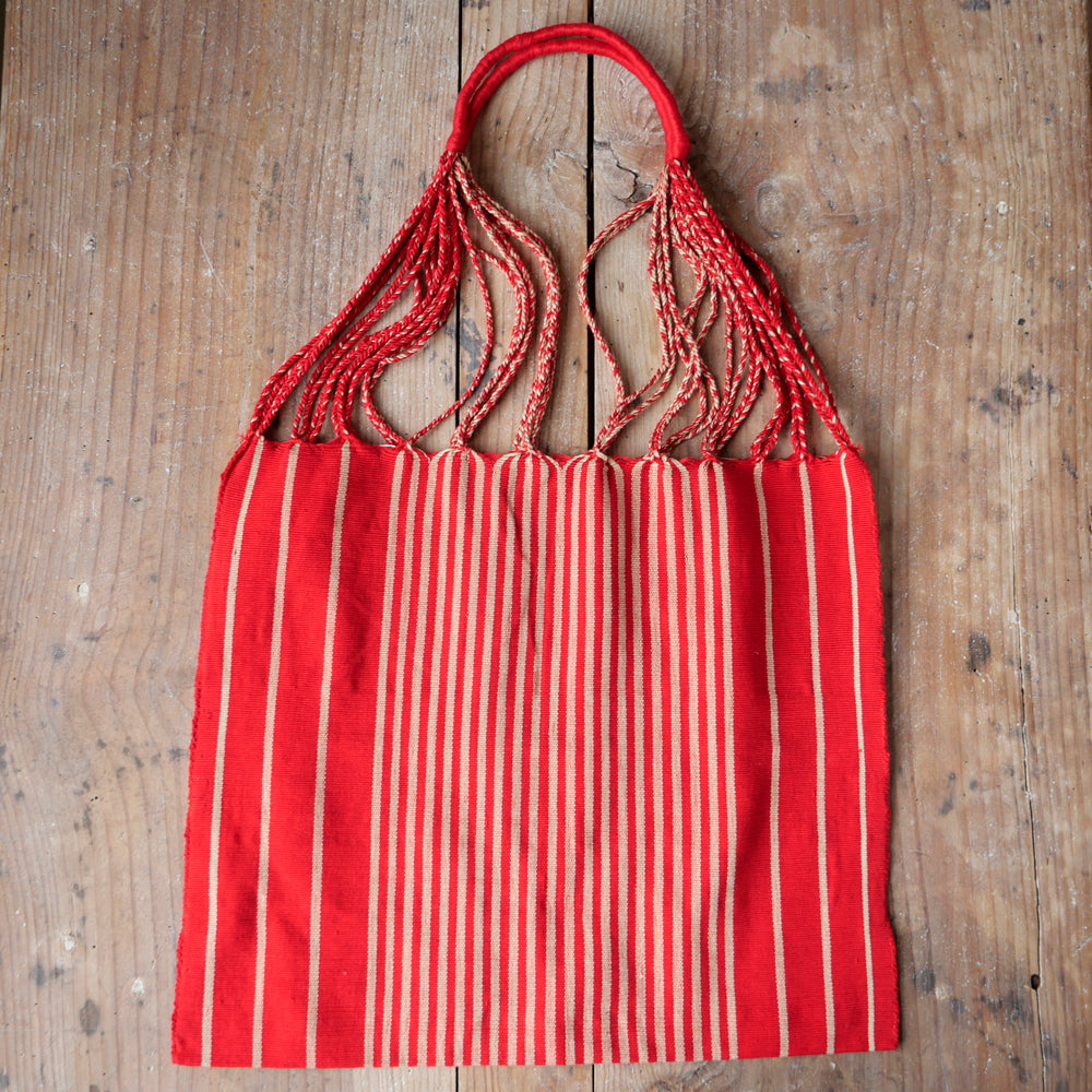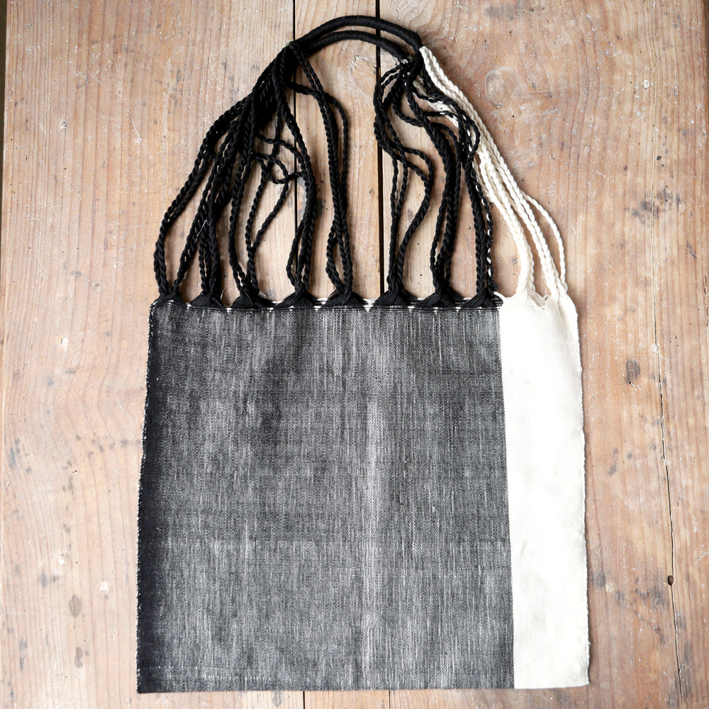大人気のメキシコはチアパス州の手織り生地を使用したハンモックバッグ。上から広げると、まるでハンモックのような形をしております。布端のフリンジを持ち手にした独創的なデザインがなんとも可愛らしいです。マチはございませんが、見た目以上にたっぷり入り、物を入れた時の形もふんわりしていて綺麗です。こちらはMサイズになります。