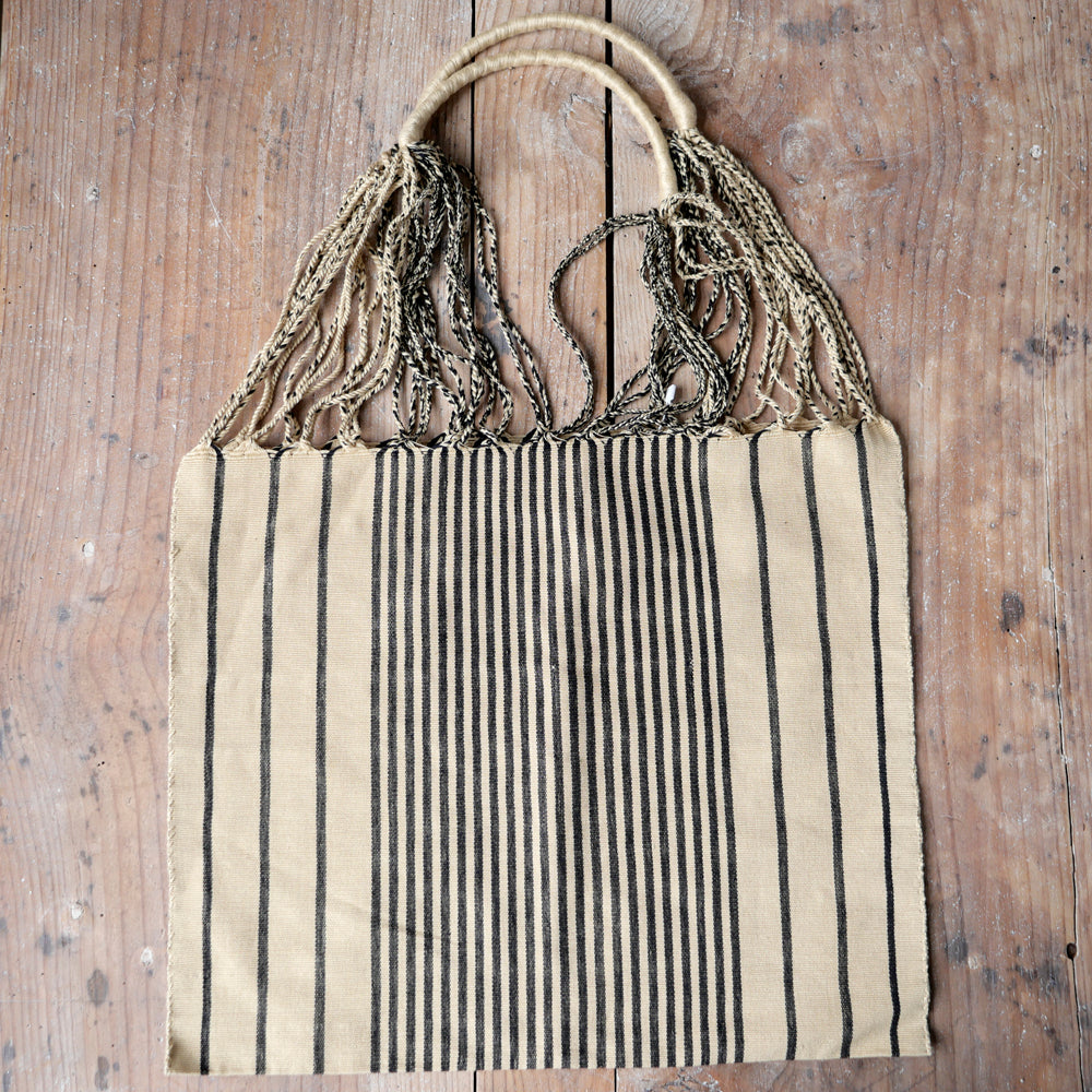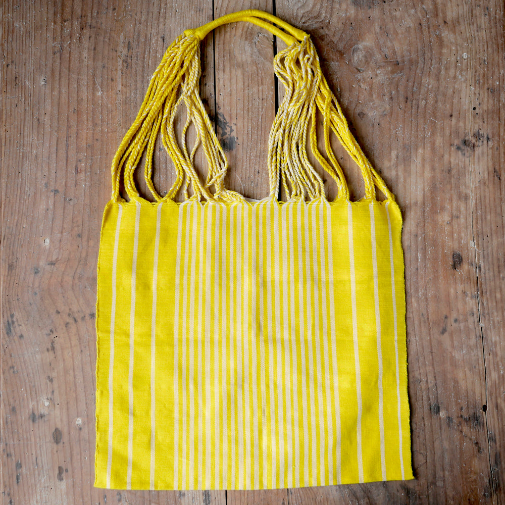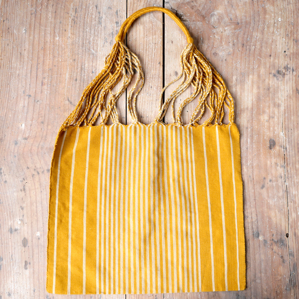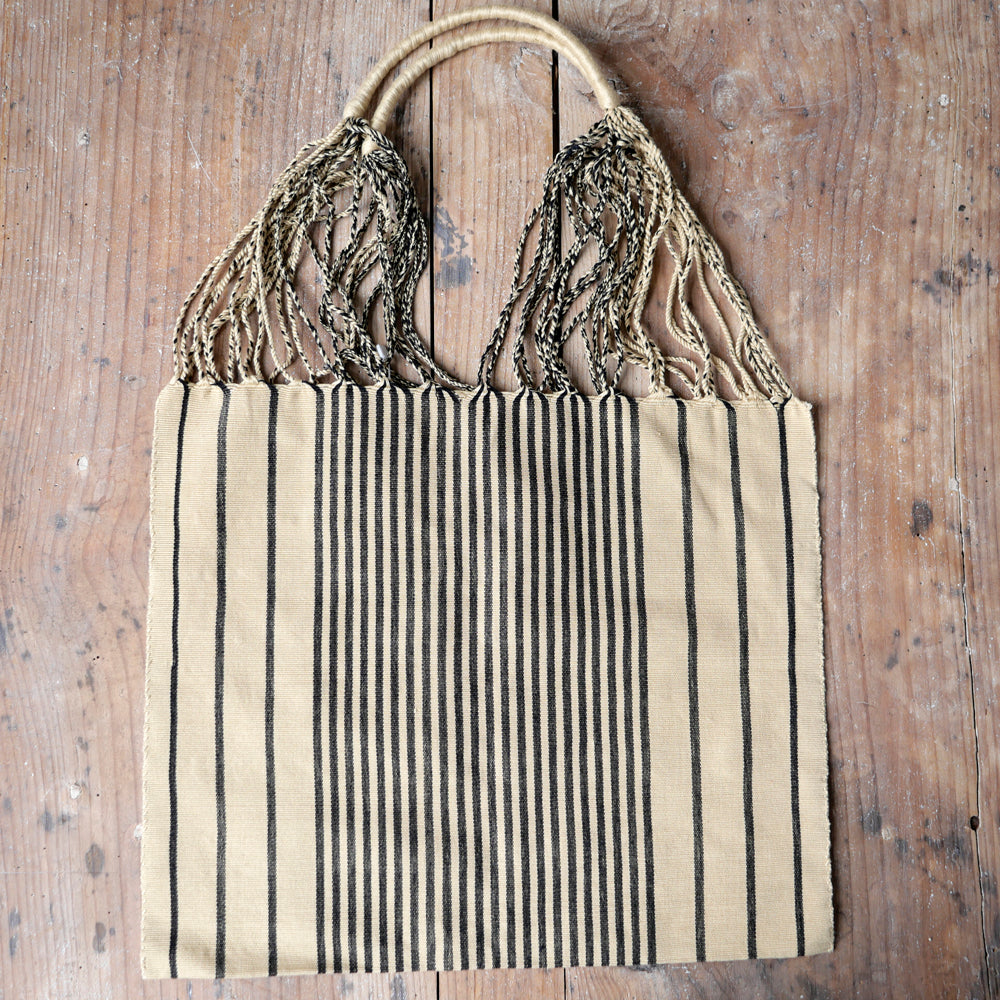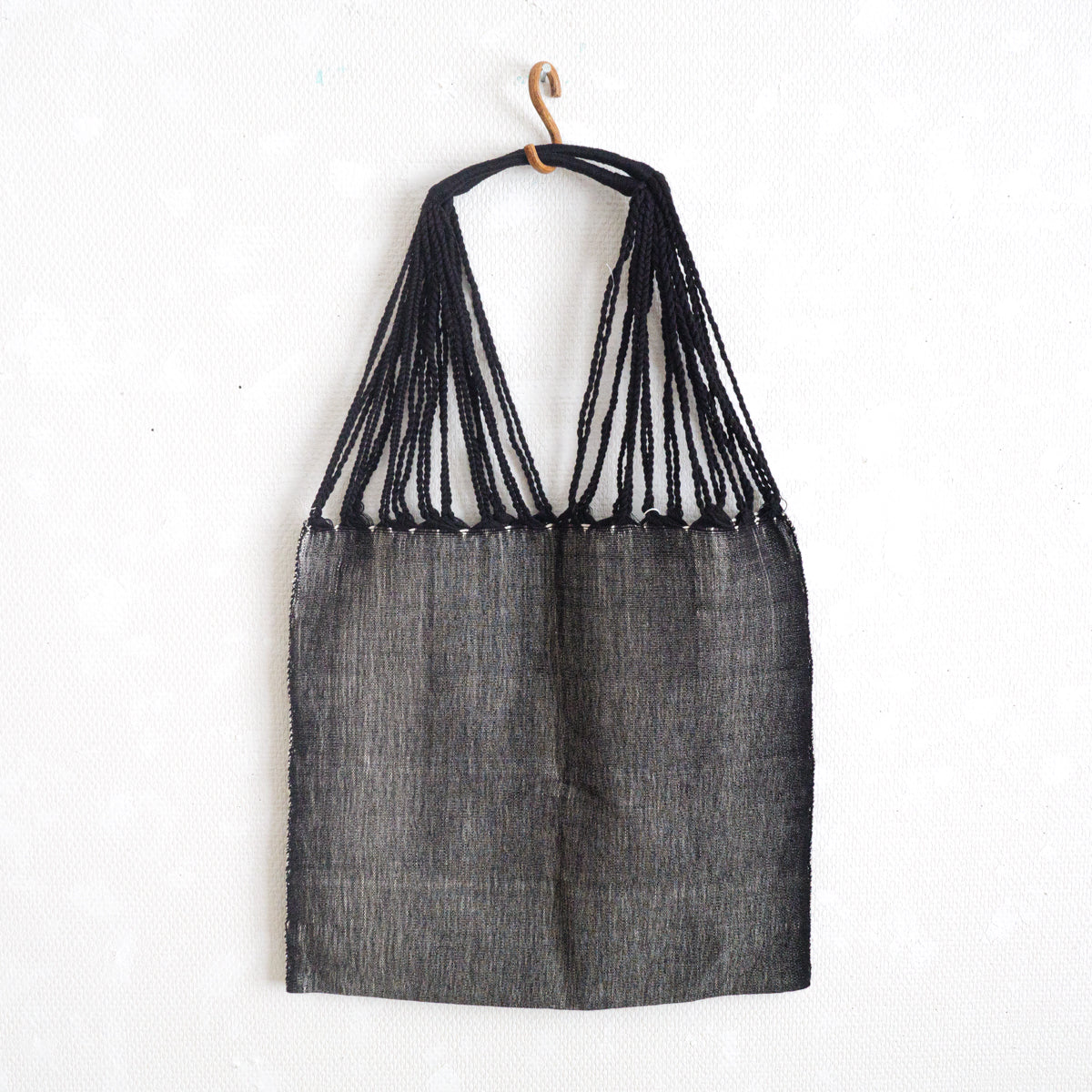 大人気のメキシコはチアパス州の手織り生地を使用したハンモックバッグ。上から広げると、まるでハンモックのような形をしております。布端のフリンジを持ち手にした独創的なデザインがなんとも可愛らしいです。マチはございませんが、見た目以上にたっぷり入り、物を入れた時の形もふんわりしていて綺麗です。こちらはMサイズになります。