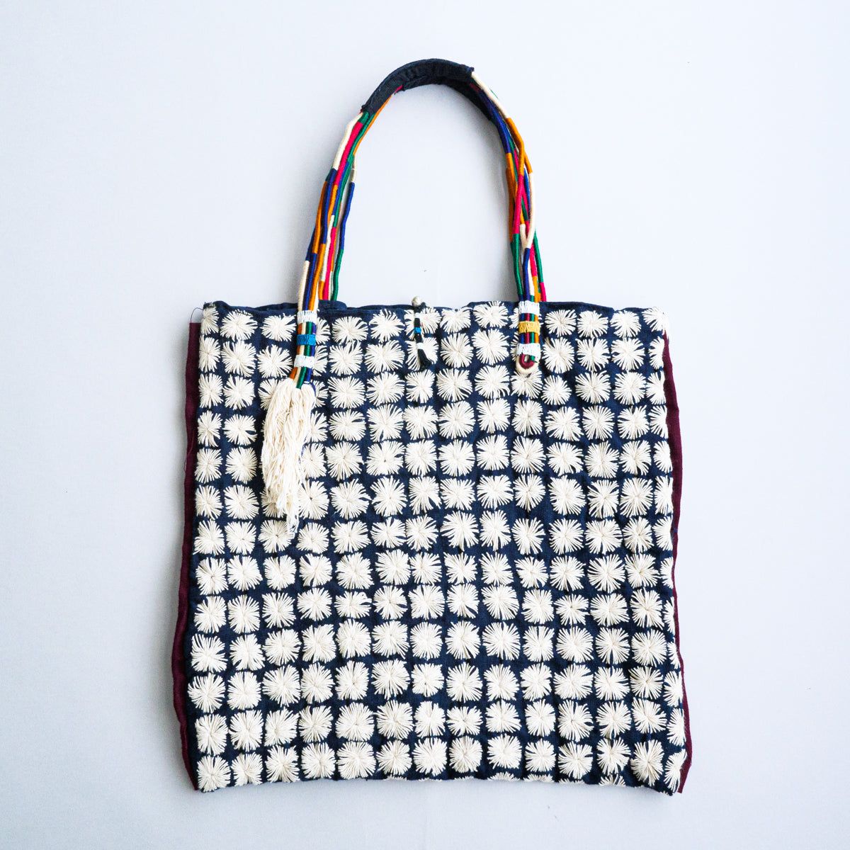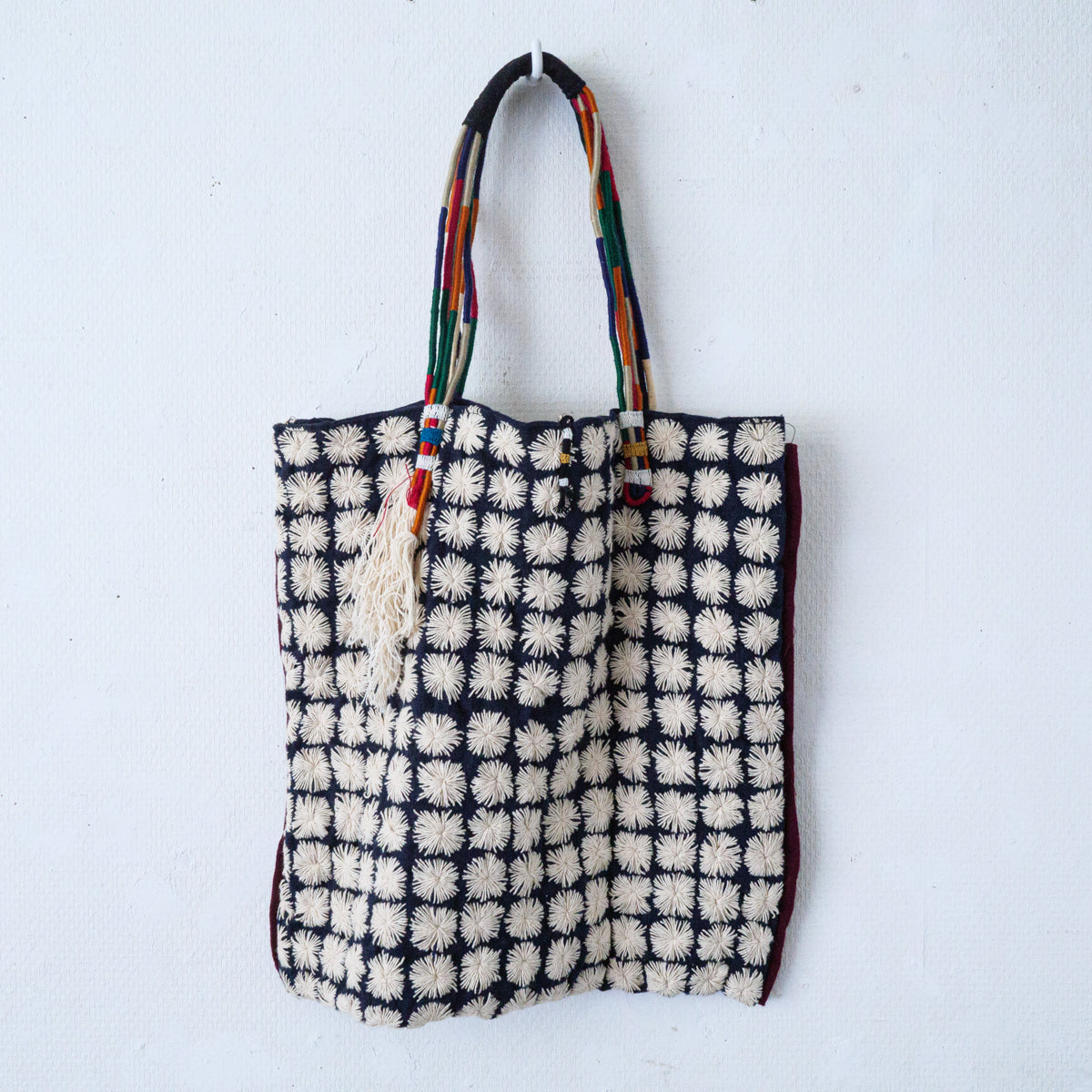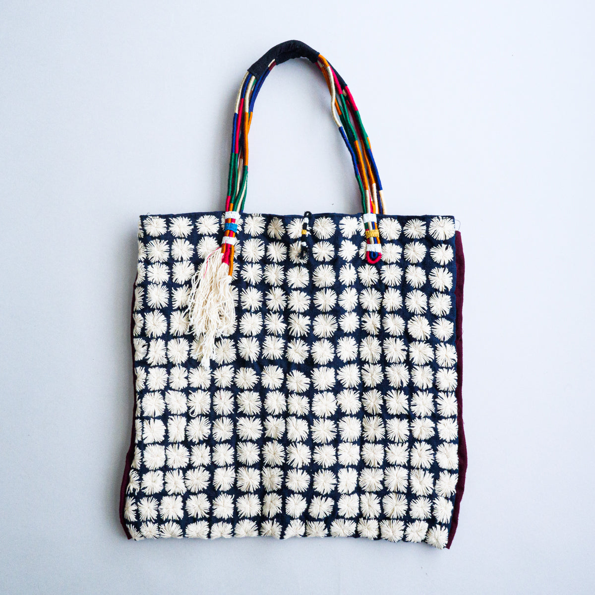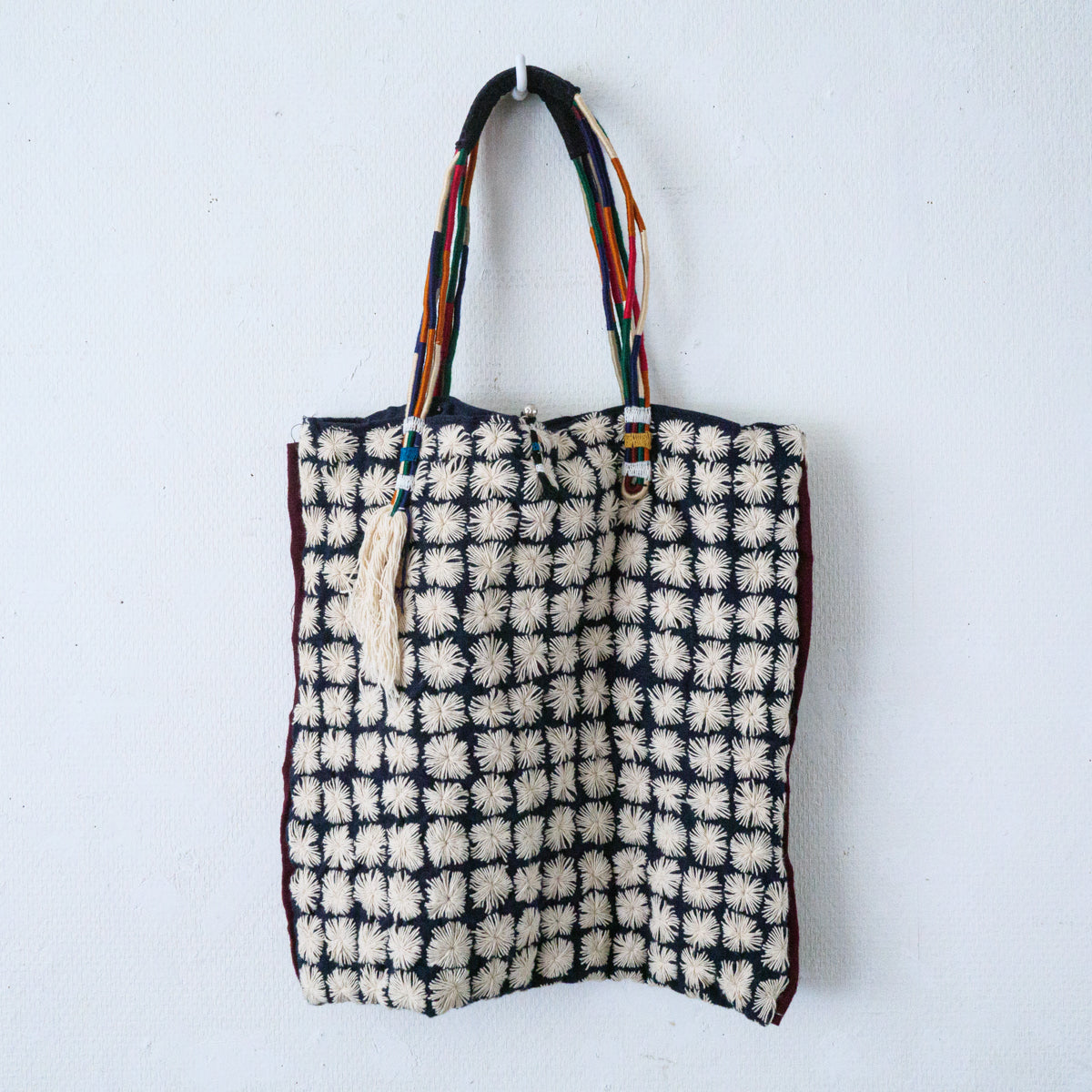 タイ北部のヤオ族による刺し子が無数に施されたトートバッグ。こちらはかなりスペシャルな作りで、ハンドル部分はご覧のようにカラフルな紐を上部で束ねた仕様となっています。側面には朱色の生地がデザインアクセントとして挟み込まれており、さらにタッセルが両側につき、開かないように鈴状の留め具まで付いた細部にまでこだわった作りです。内側にはポケットが付いておりません。