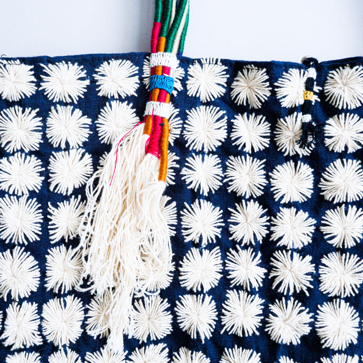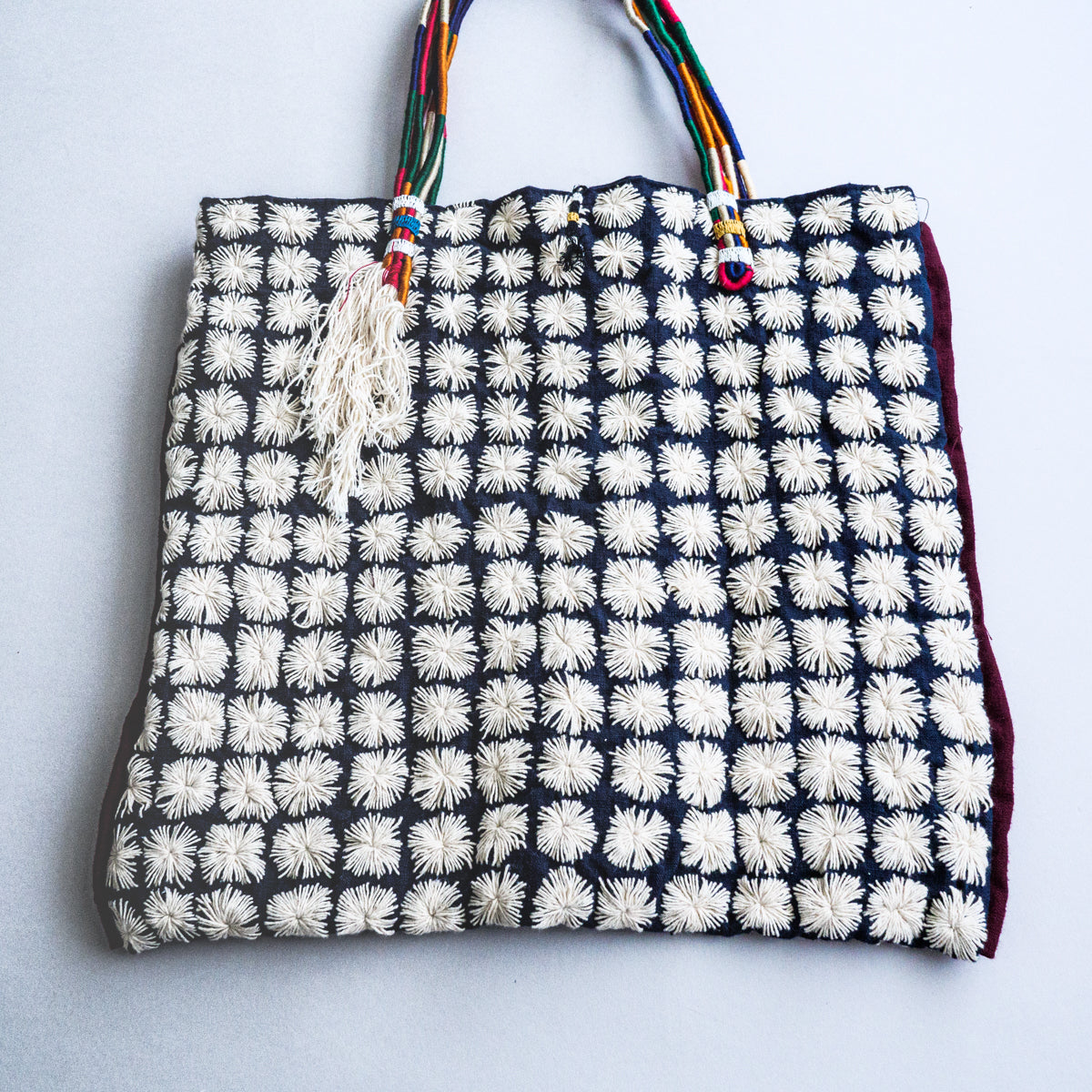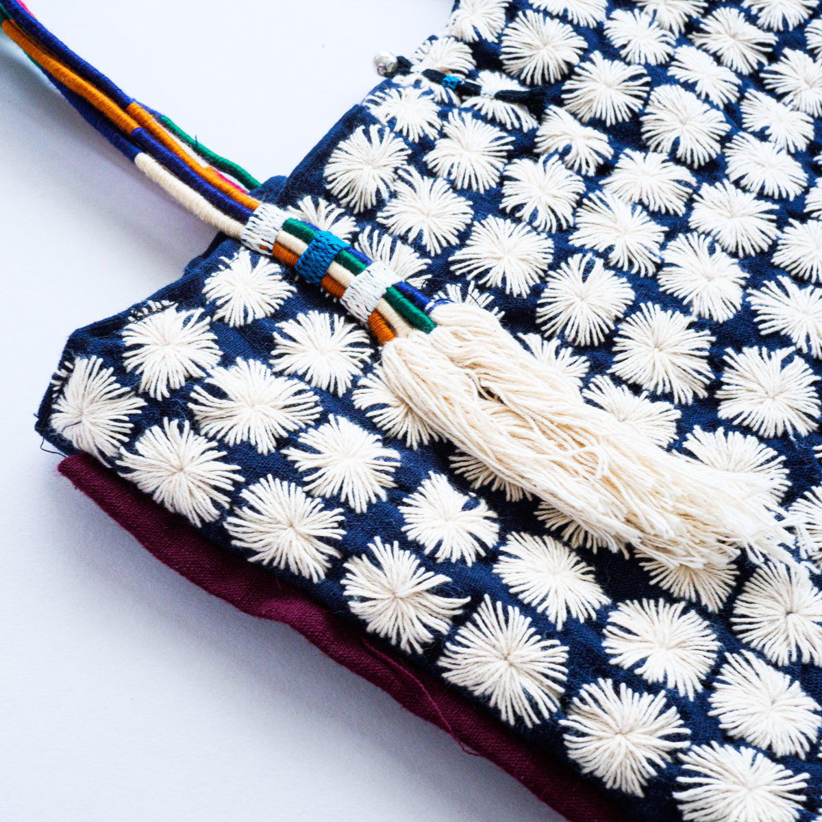 タイ北部のヤオ族による刺し子が無数に施されたトートバッグ。こちらはかなりスペシャルな作りで、ハンドル部分はご覧のようにカラフルな紐を上部で束ねた仕様となっています。側面には朱色の生地がデザインアクセントとして挟み込まれており、さらにタッセルが両側につき、開かないように鈴状の留め具まで付いた細部にまでこだわった作りです。内側にはポケットが付いておりません。