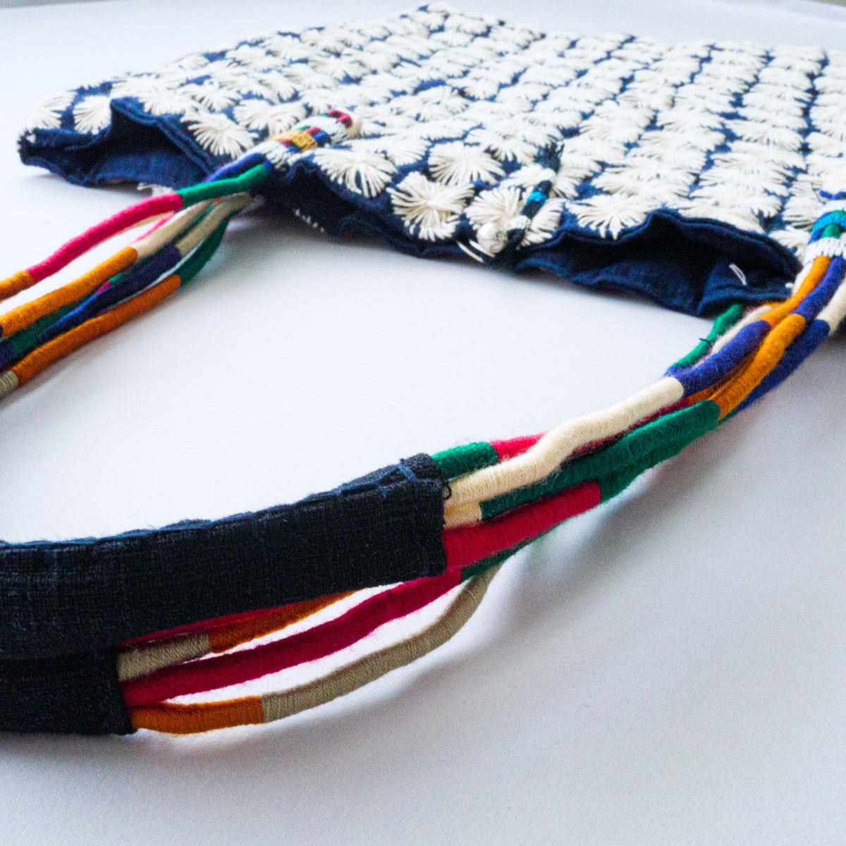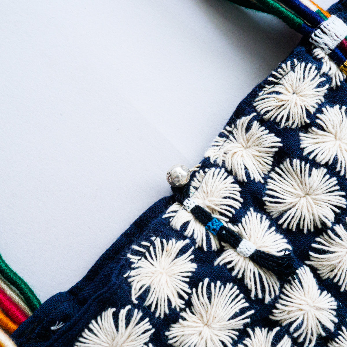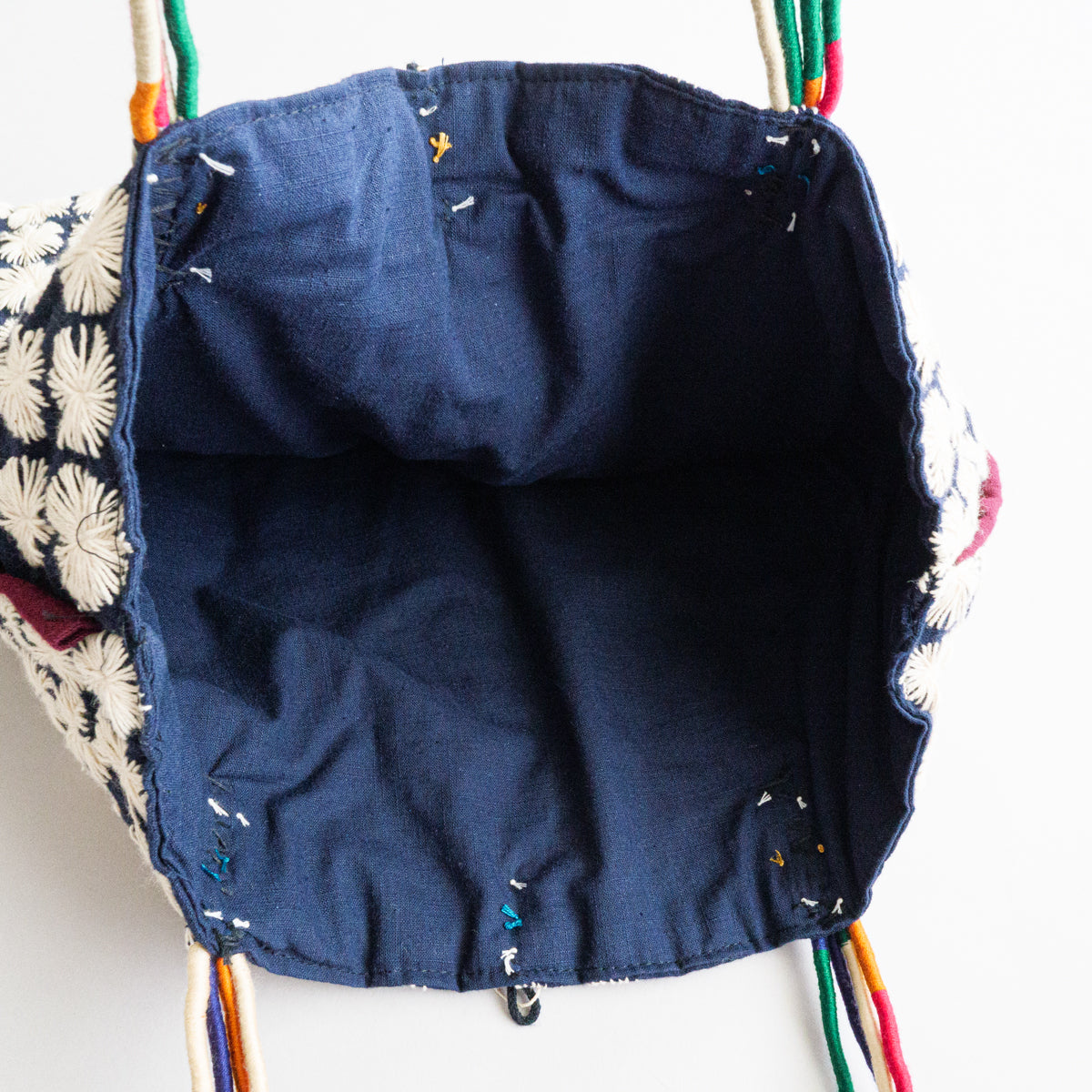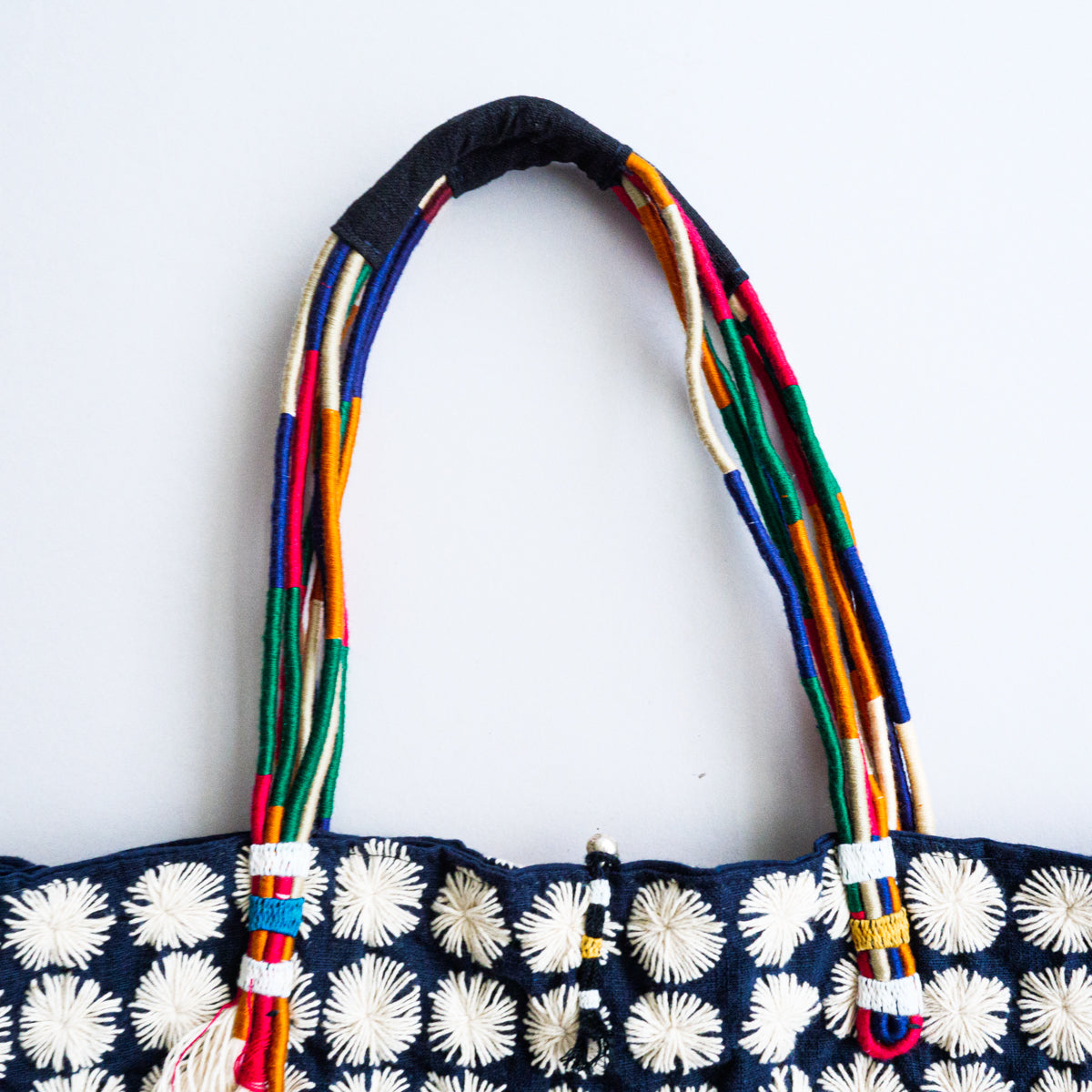 タイ北部のヤオ族による刺し子が無数に施されたトートバッグ。こちらはかなりスペシャルな作りで、ハンドル部分はご覧のようにカラフルな紐を上部で束ねた仕様となっています。側面には朱色の生地がデザインアクセントとして挟み込まれており、さらにタッセルが両側につき、開かないように鈴状の留め具まで付いた細部にまでこだわった作りです。内側にはポケットが付いておりません。