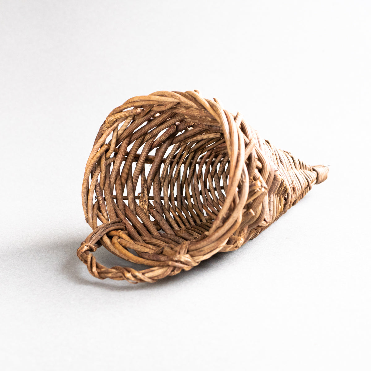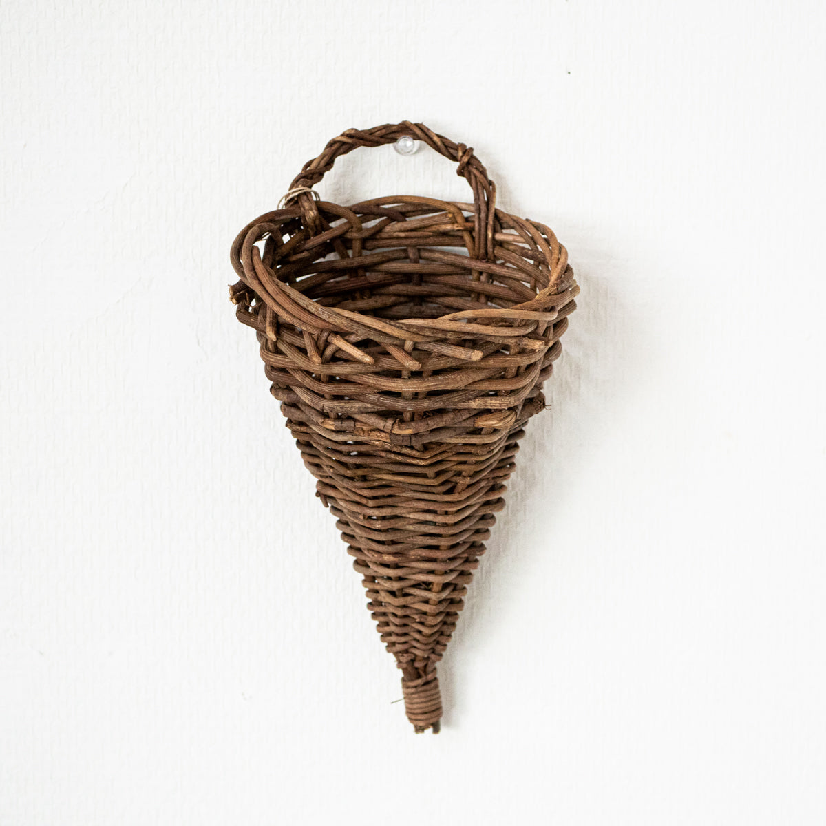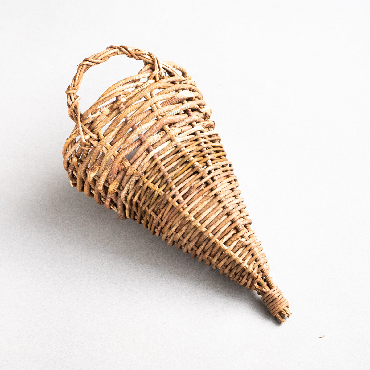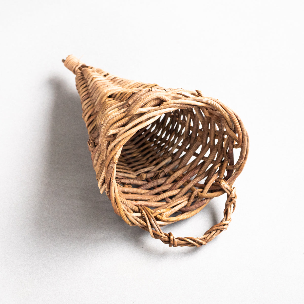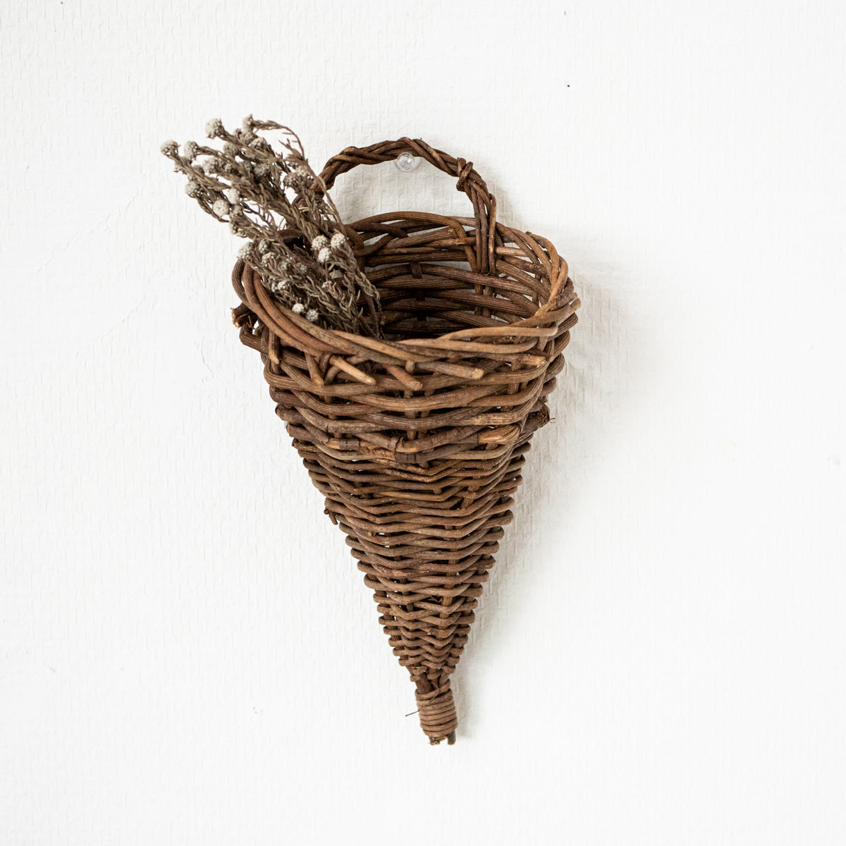 山藤を器用に手編みして作られた逆三角錐状の一輪挿し。持ち手があるので、紐を通せば壁や天井からも吊るせます。ナチュラル感溢れる素敵なインテリアになります。