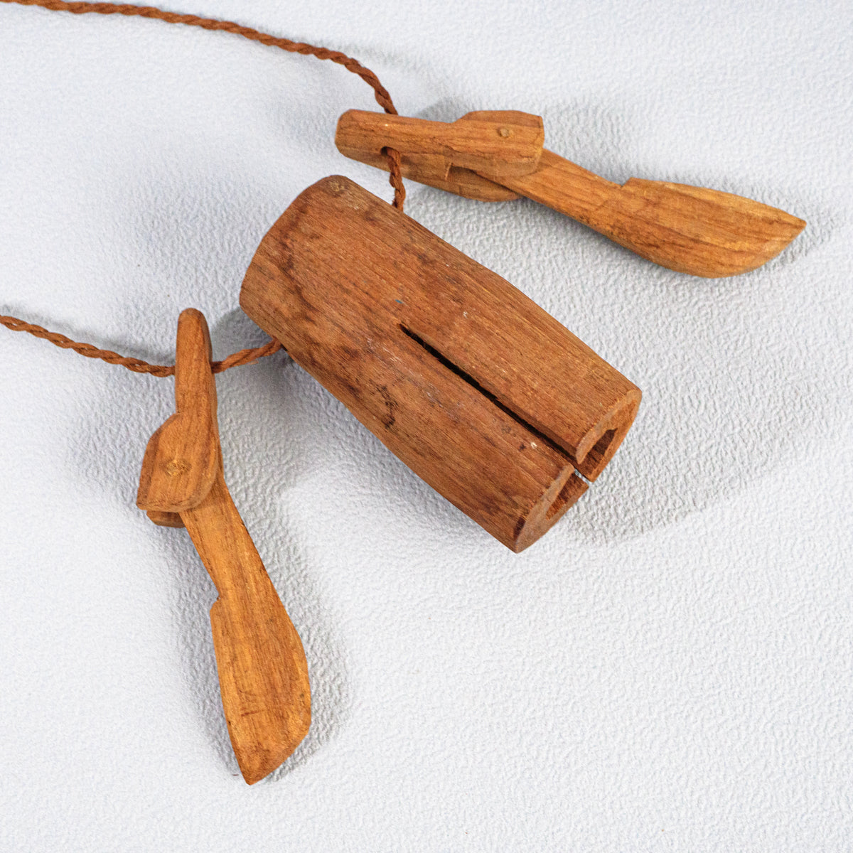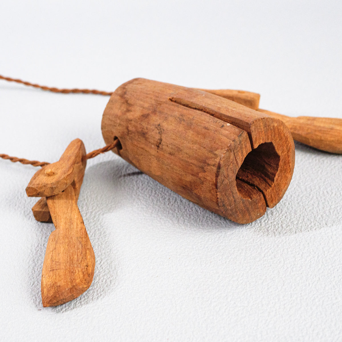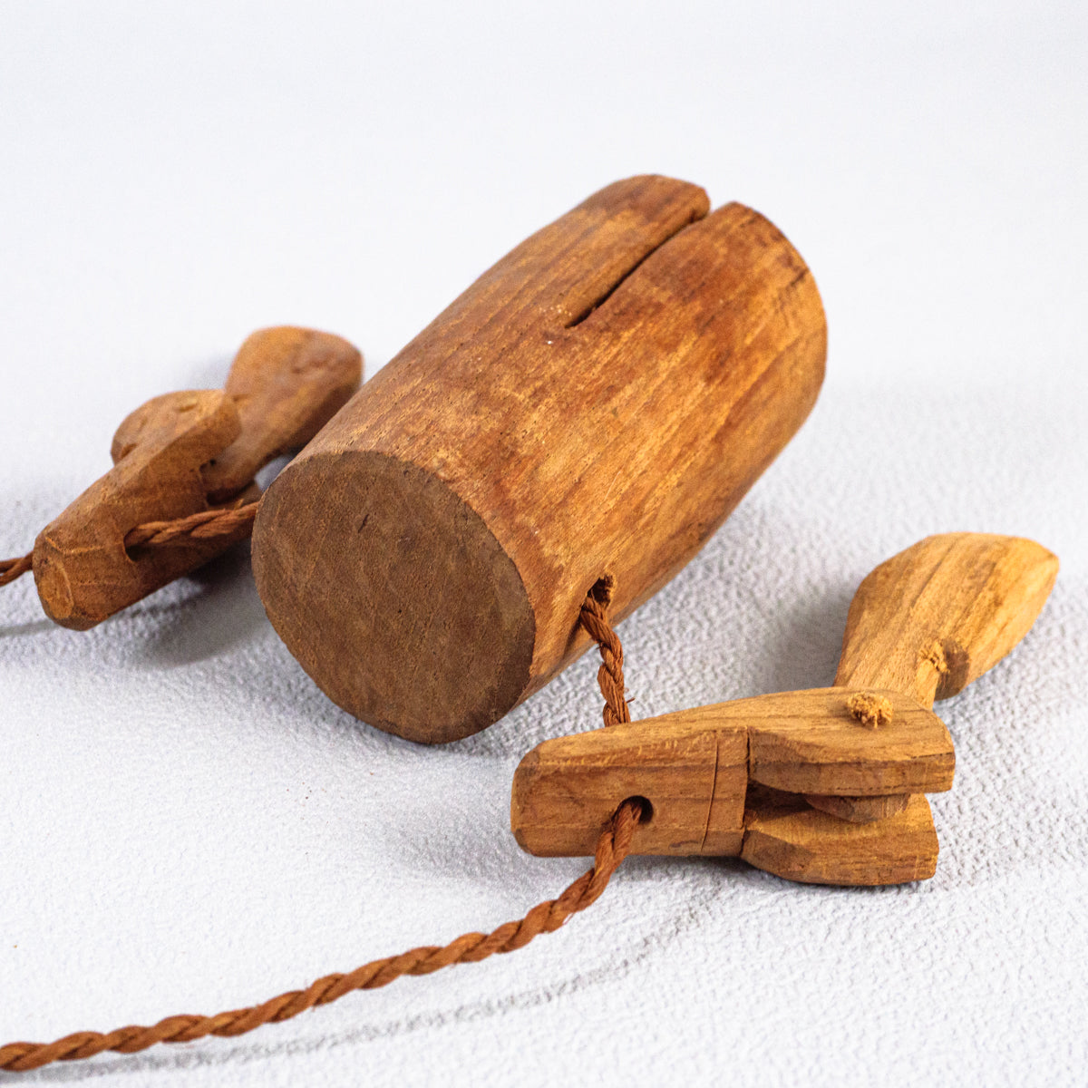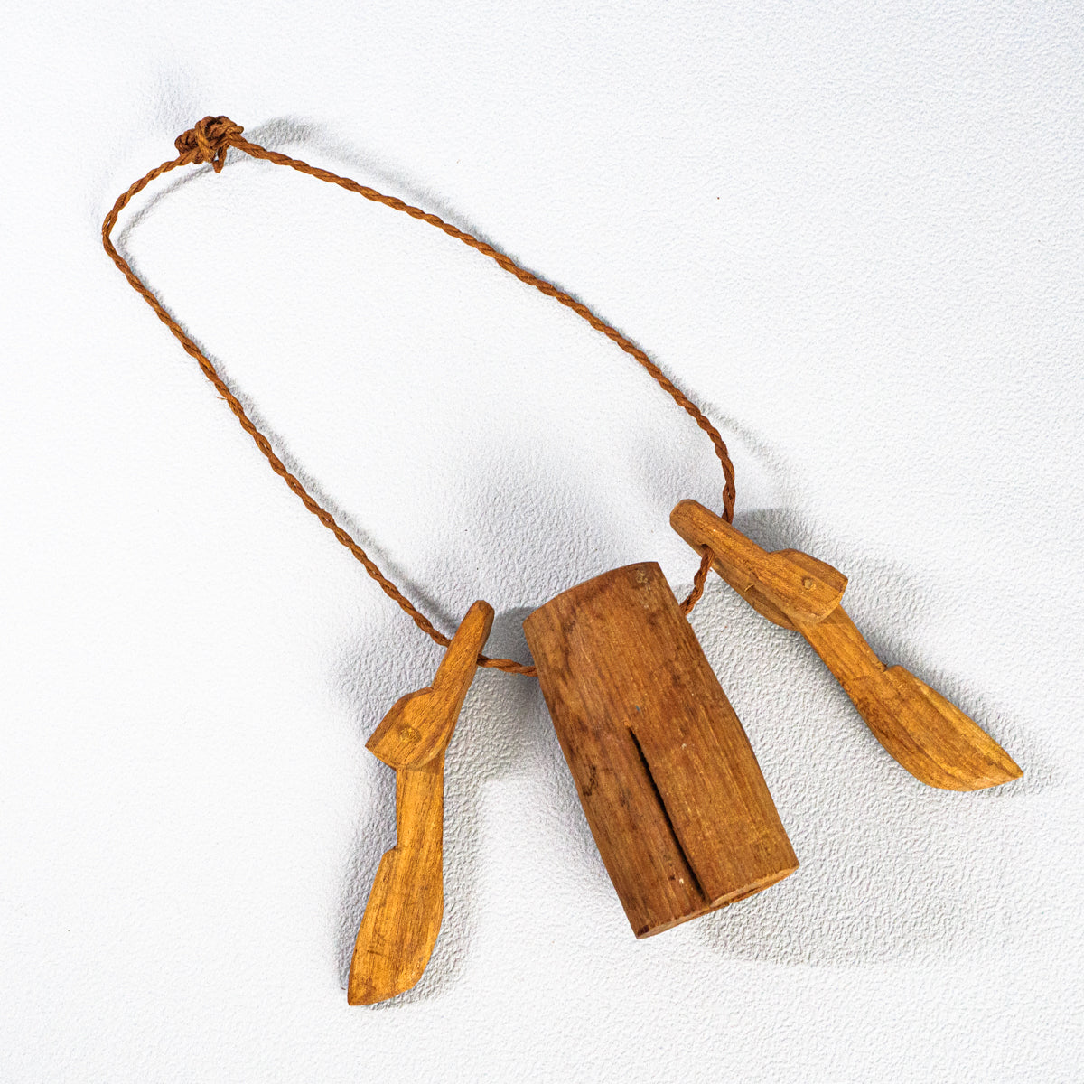 コロンコロンと心地よい音が鳴る、木製のベル。左右の木が中央の空洞の竹を鳴らすシンプルな仕組みです。こちらは牛が放牧されている時に付けられる鈴のような役割の生活道具。紐が通してあるので、簡単に壁にかけてインテリアにもなります。