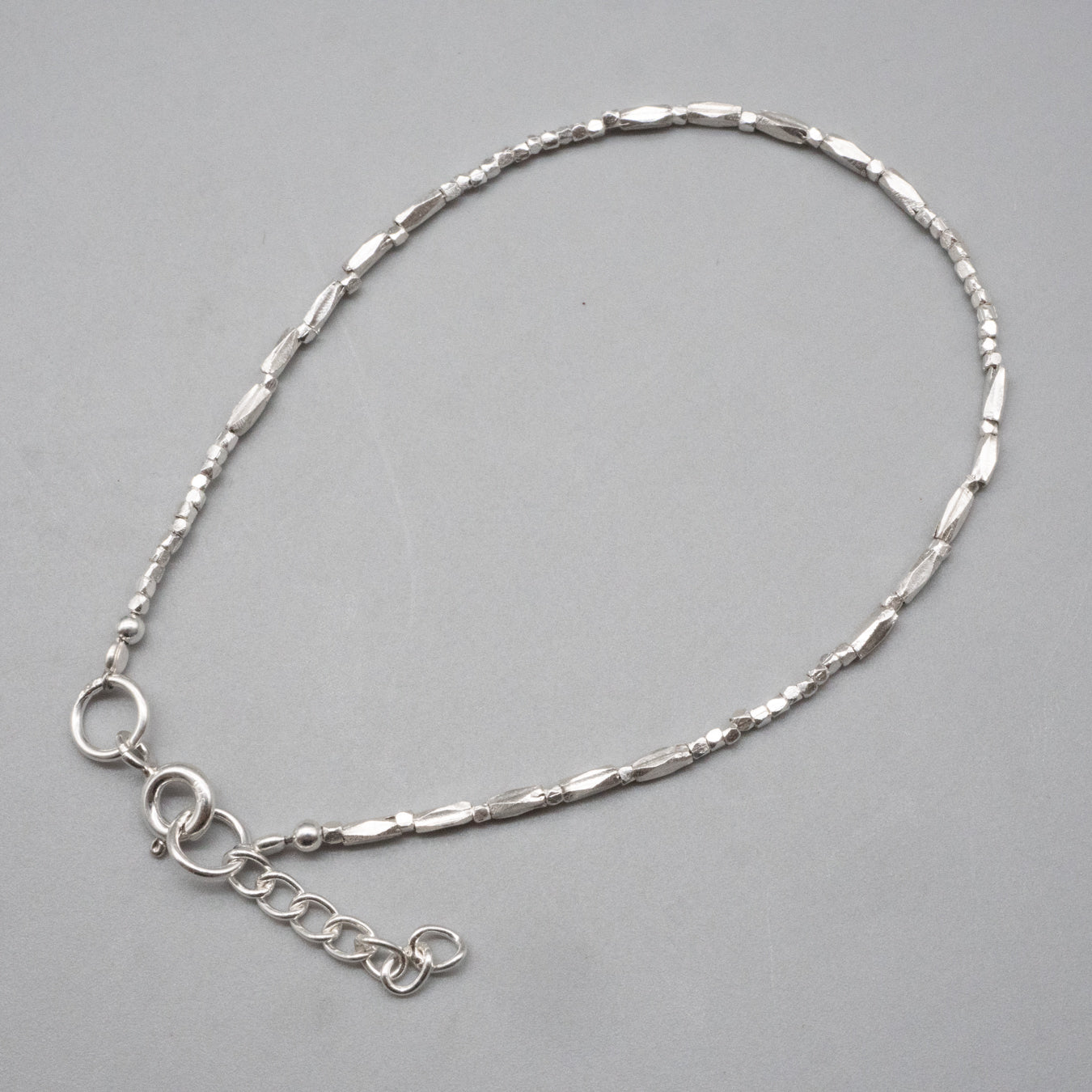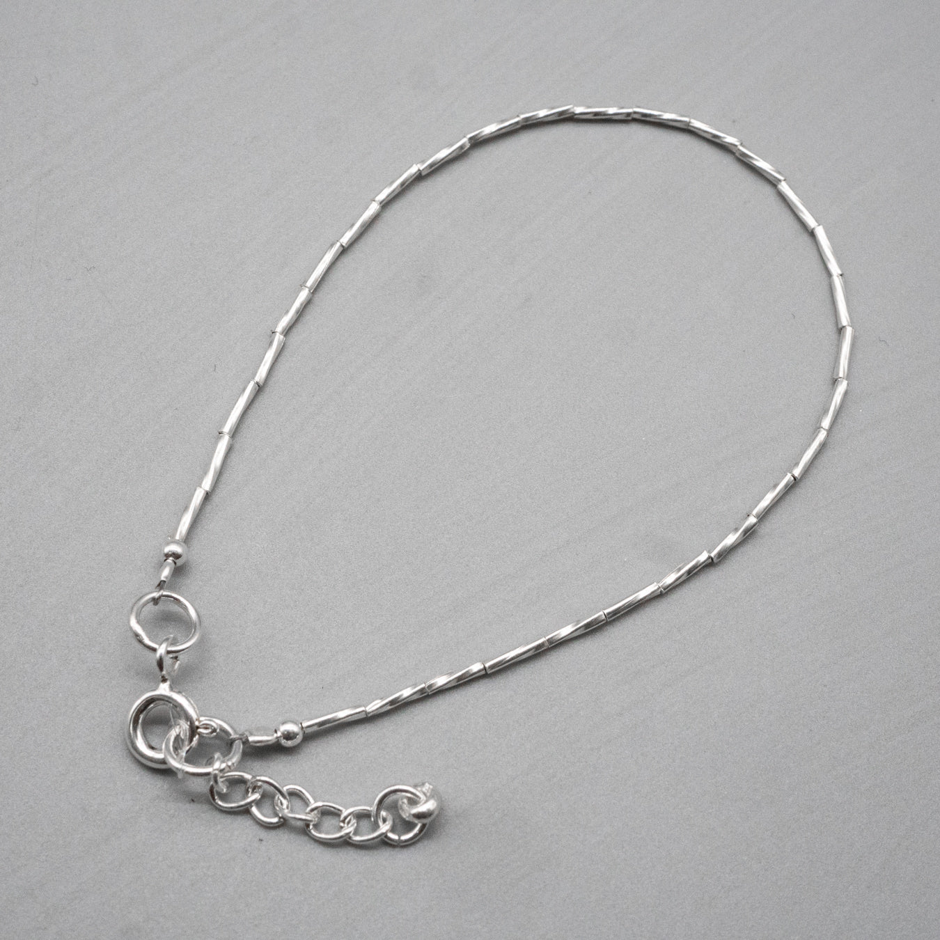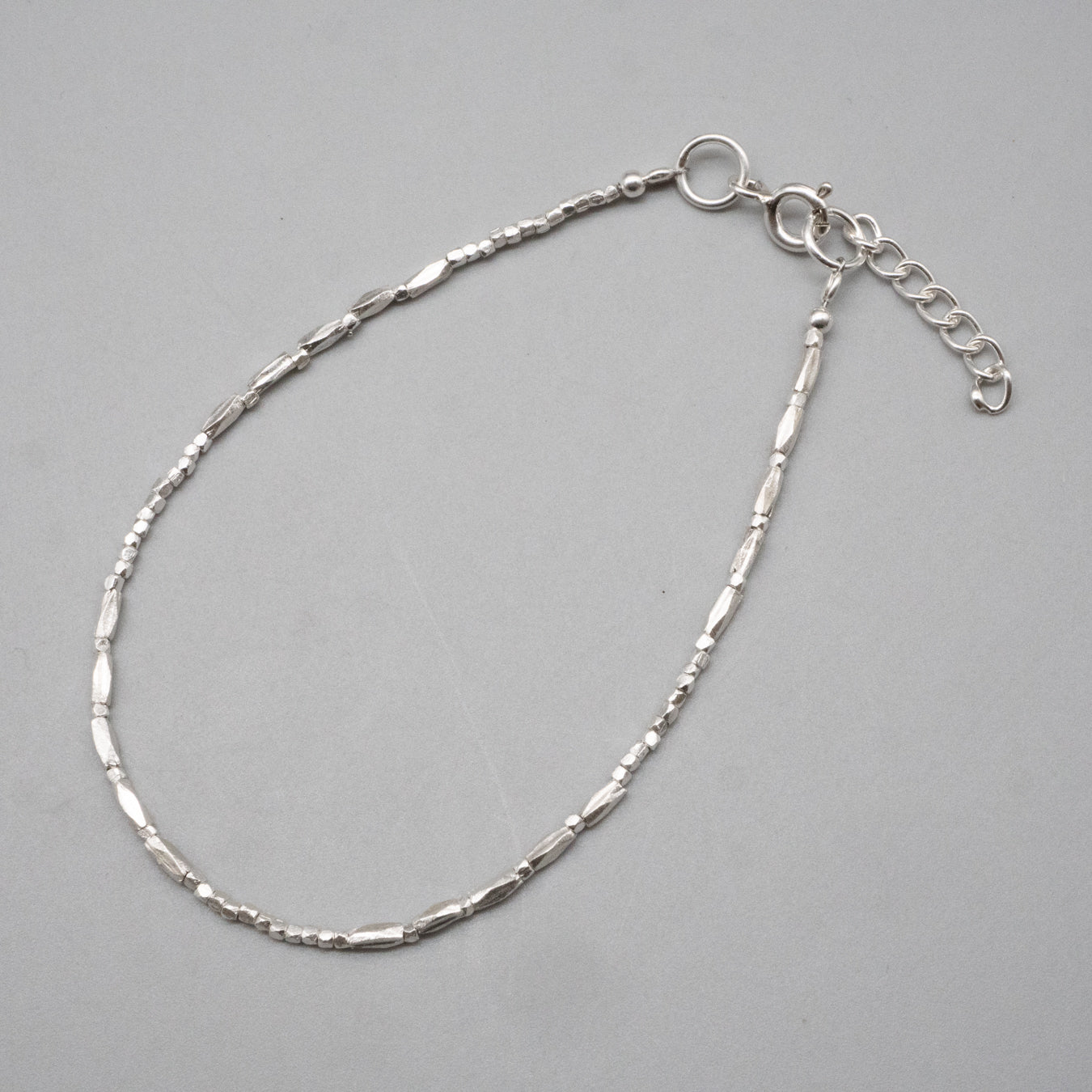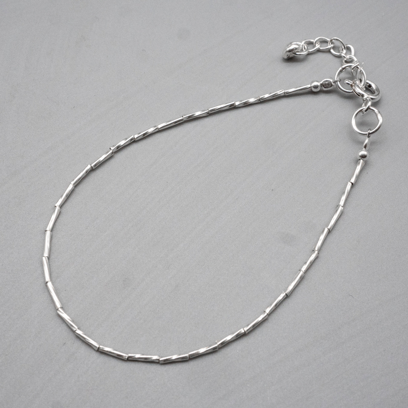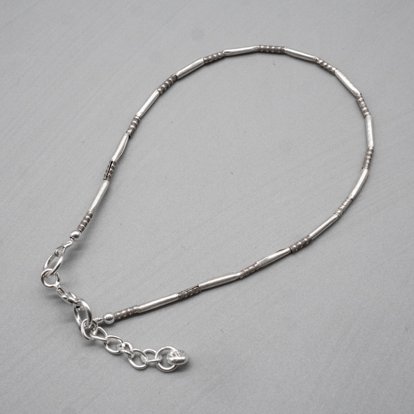 タイ北部からミャンマーにかけて分布する少数民族、カレン族が製作したシルバーアクセサリー。95%以上の高純度のシルバーで、軽くて柔らかいのが特徴です。さりげなく特徴的なデザインでとても付けやすいです。こちらはブレスレットになります。留め具の所からチェーンが出ており、長さの微調整が可能です。