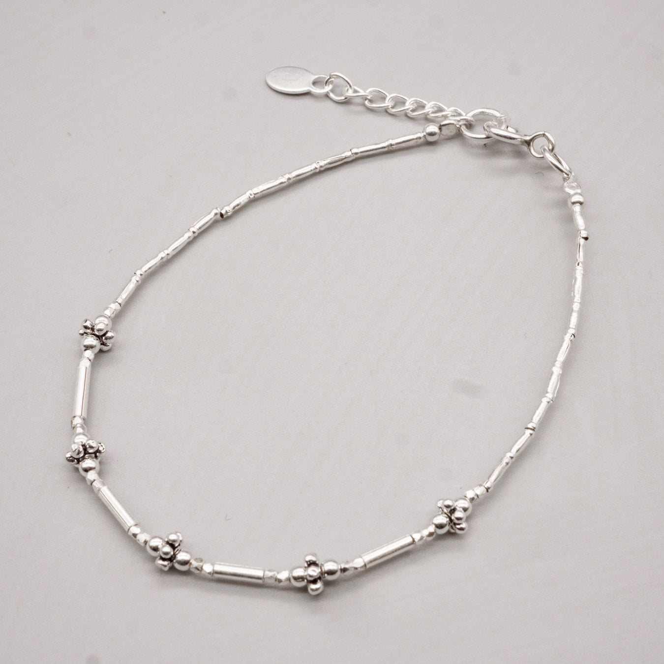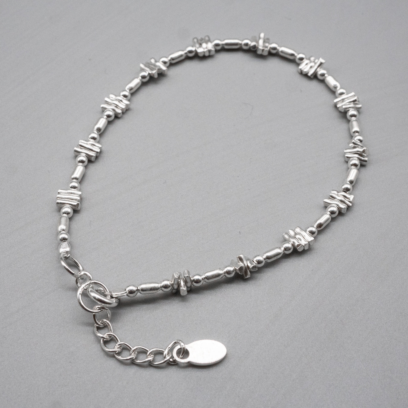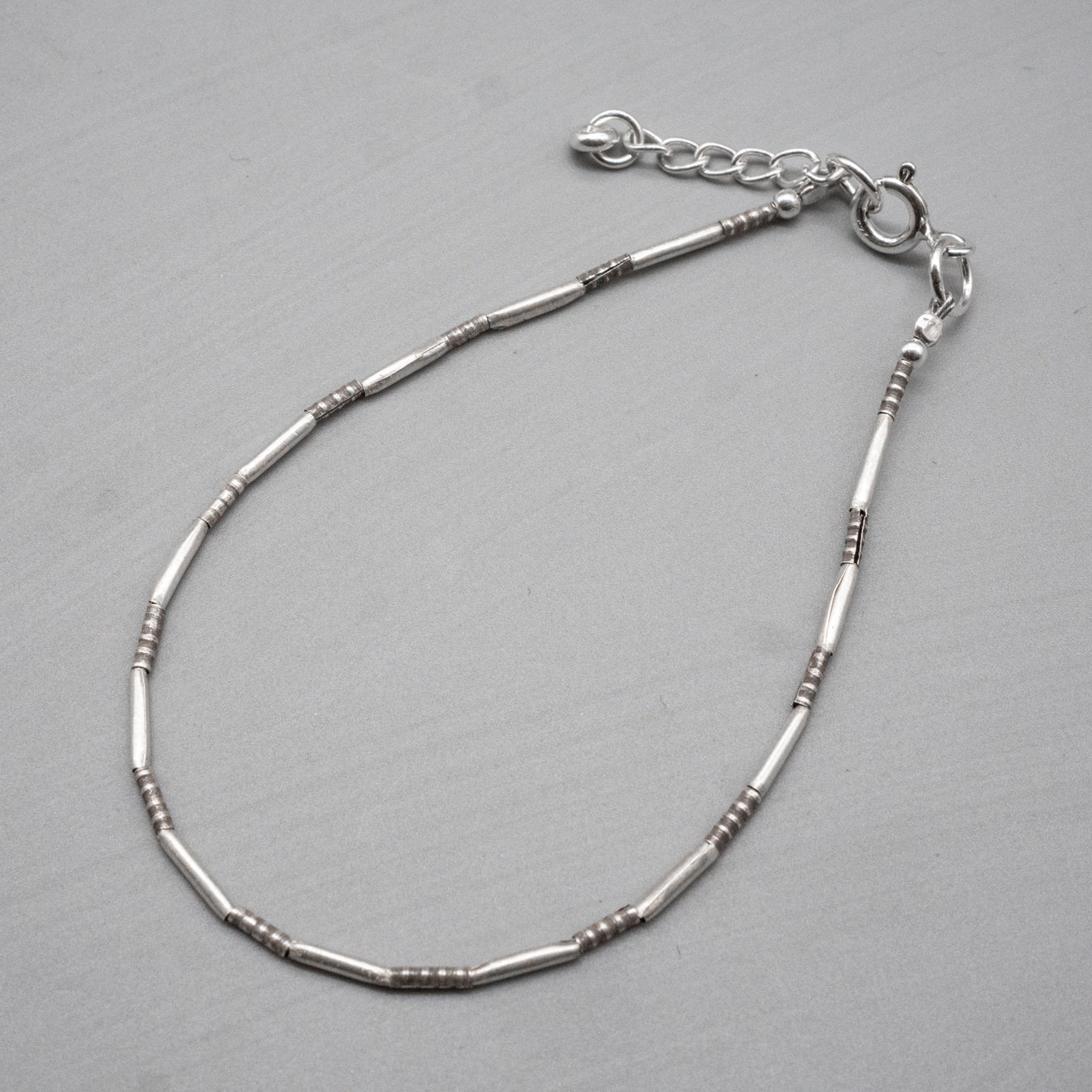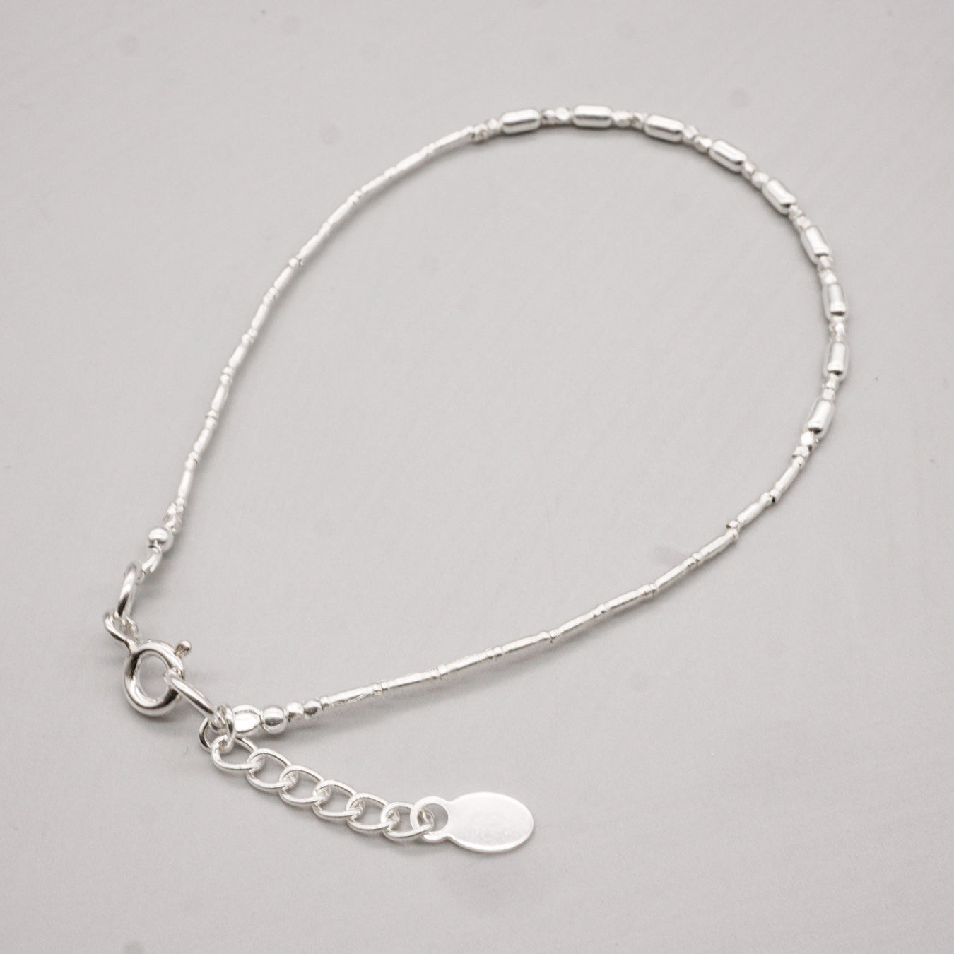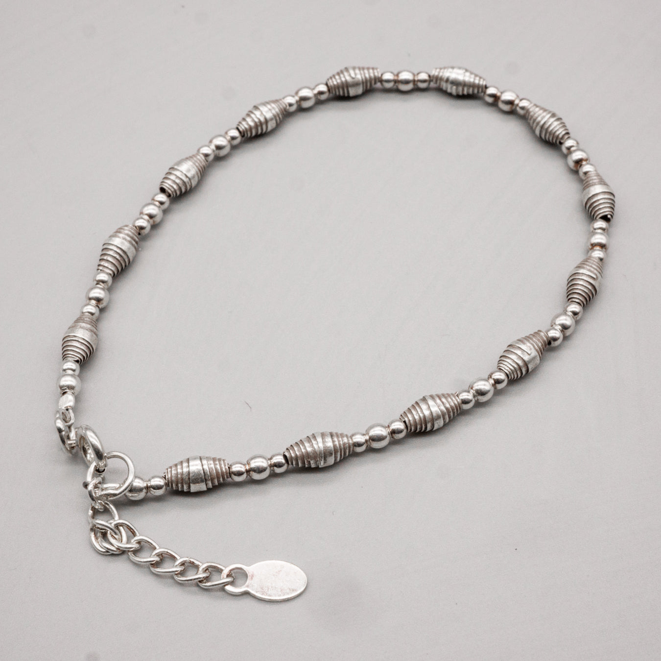 タイ北部からミャンマーにかけて分布する少数民族、カレン族が製作したシルバーアクセサリー。95%以上の高純度のシルバーで、軽くて柔らかいのが特徴です。さりげなく特徴的なデザインでとても付けやすいです。こちらはブレスレットになります。留め具の所からチェーンが出ており、長さの微調整が可能です。