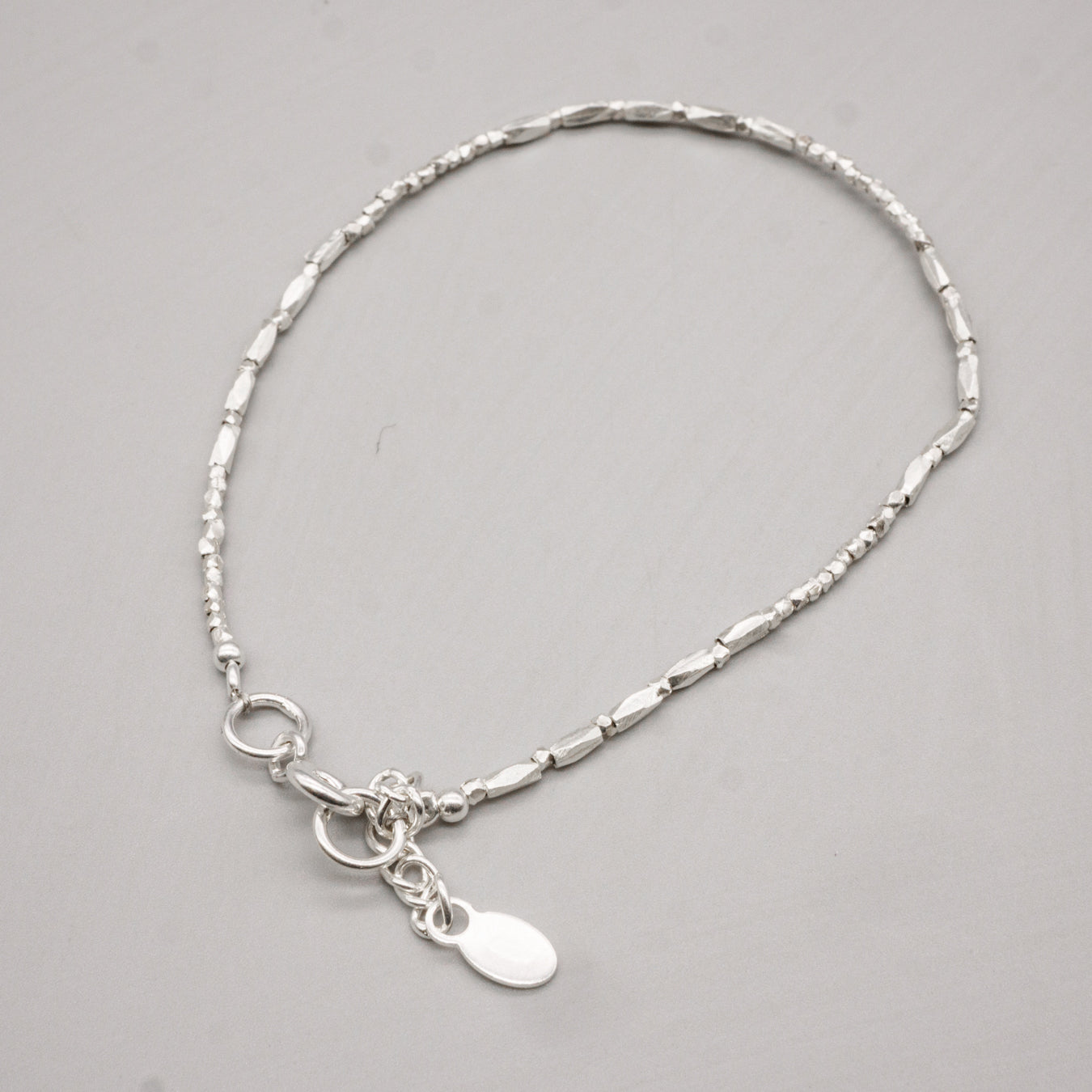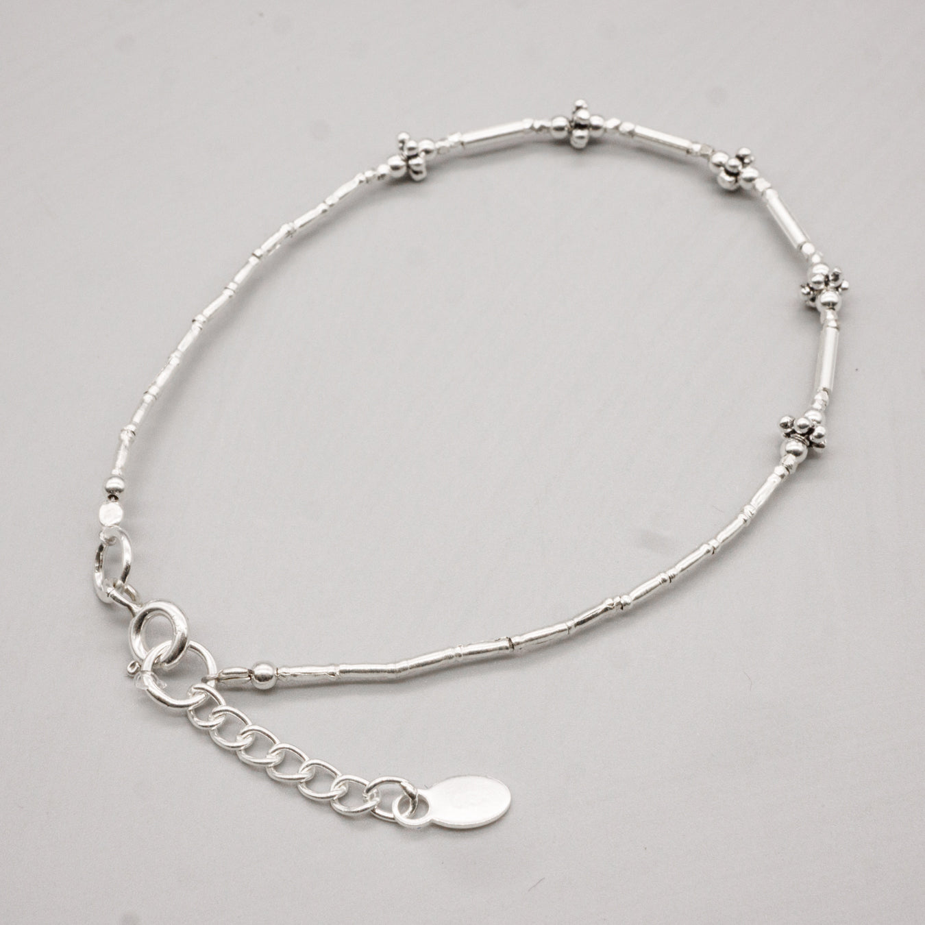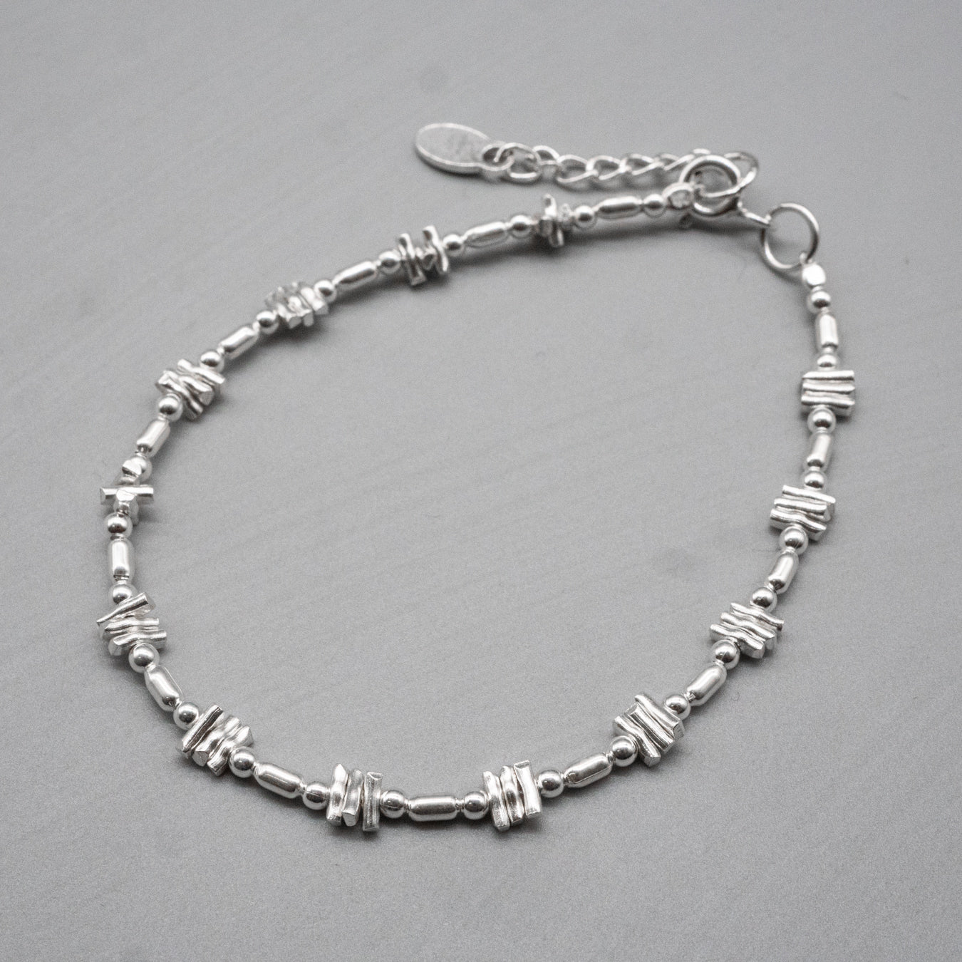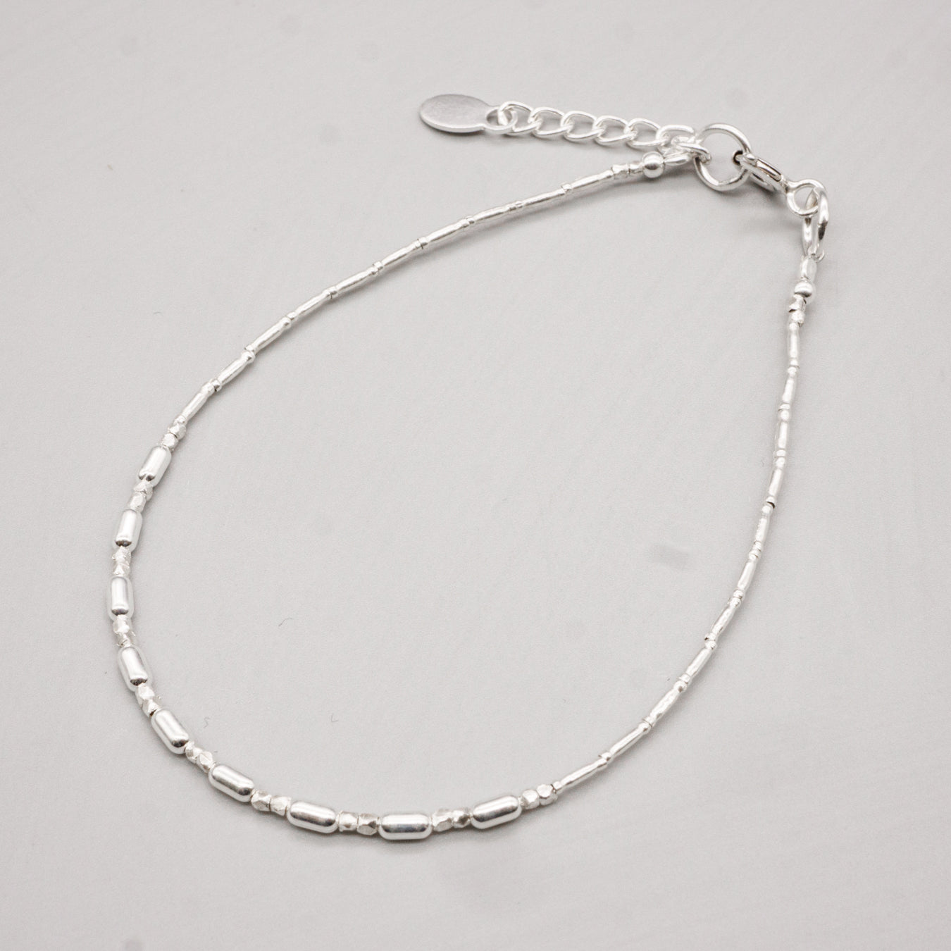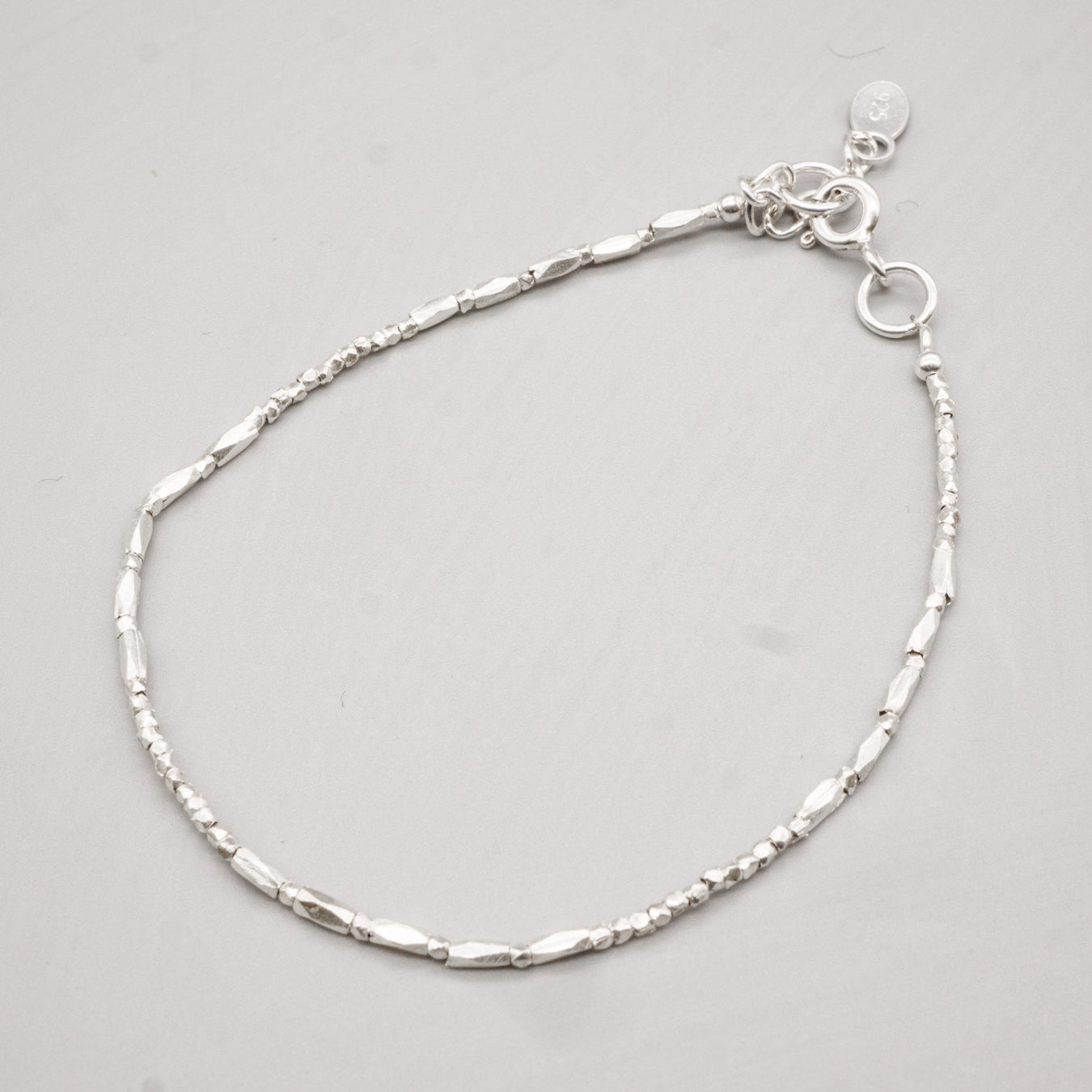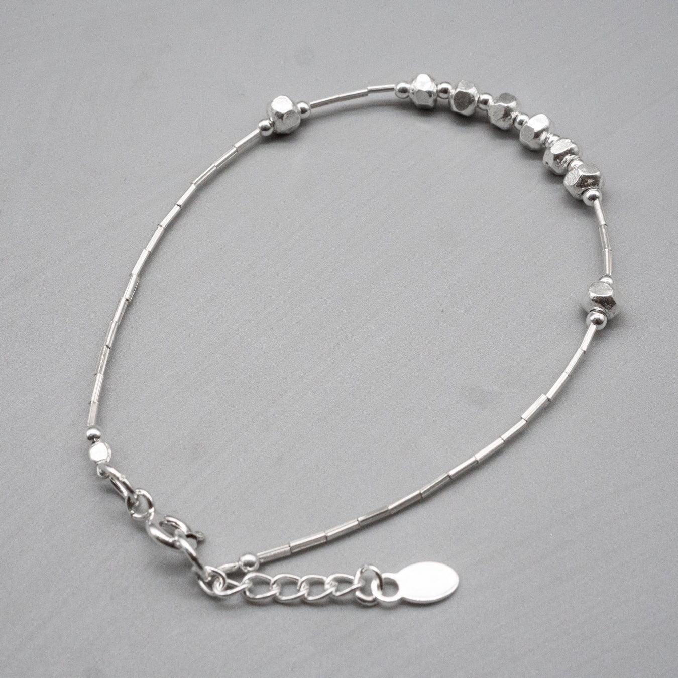 タイ北部からミャンマーにかけて分布する少数民族、カレン族が製作したシルバーアクセサリー。95%以上の高純度のシルバーで、軽くて柔らかいのが特徴です。さりげなく特徴的なデザインでとても付けやすいです。こちらはブレスレットになります。留め具の所からチェーンが出ており、長さの微調整が可能です。