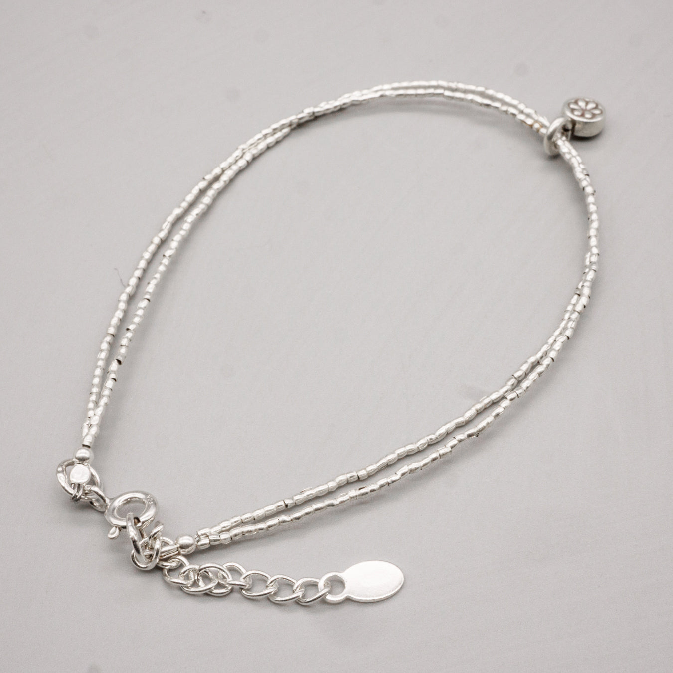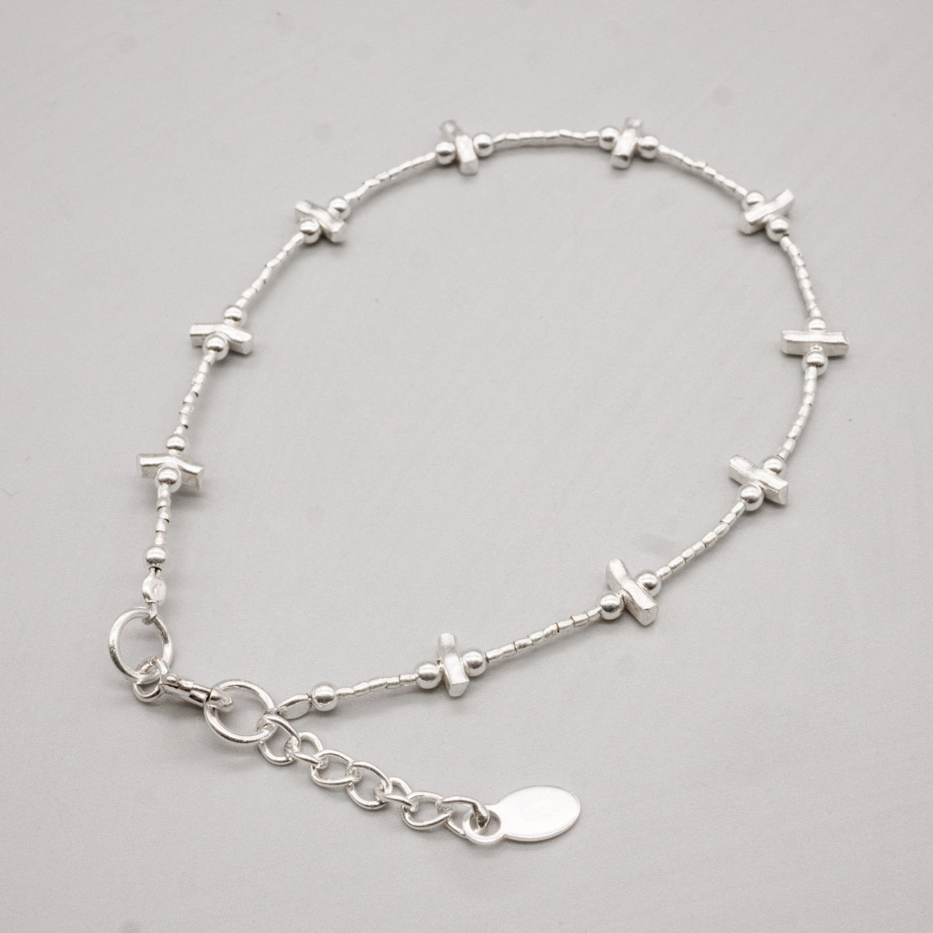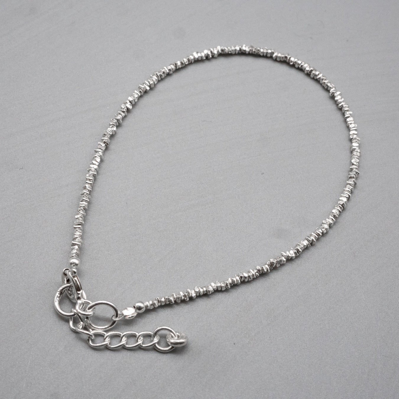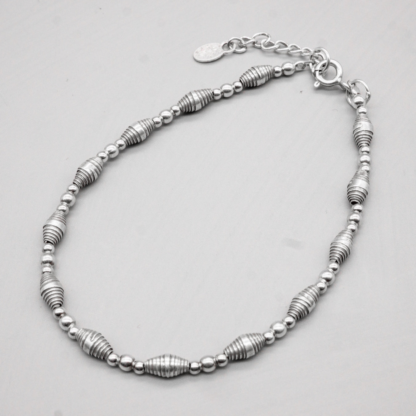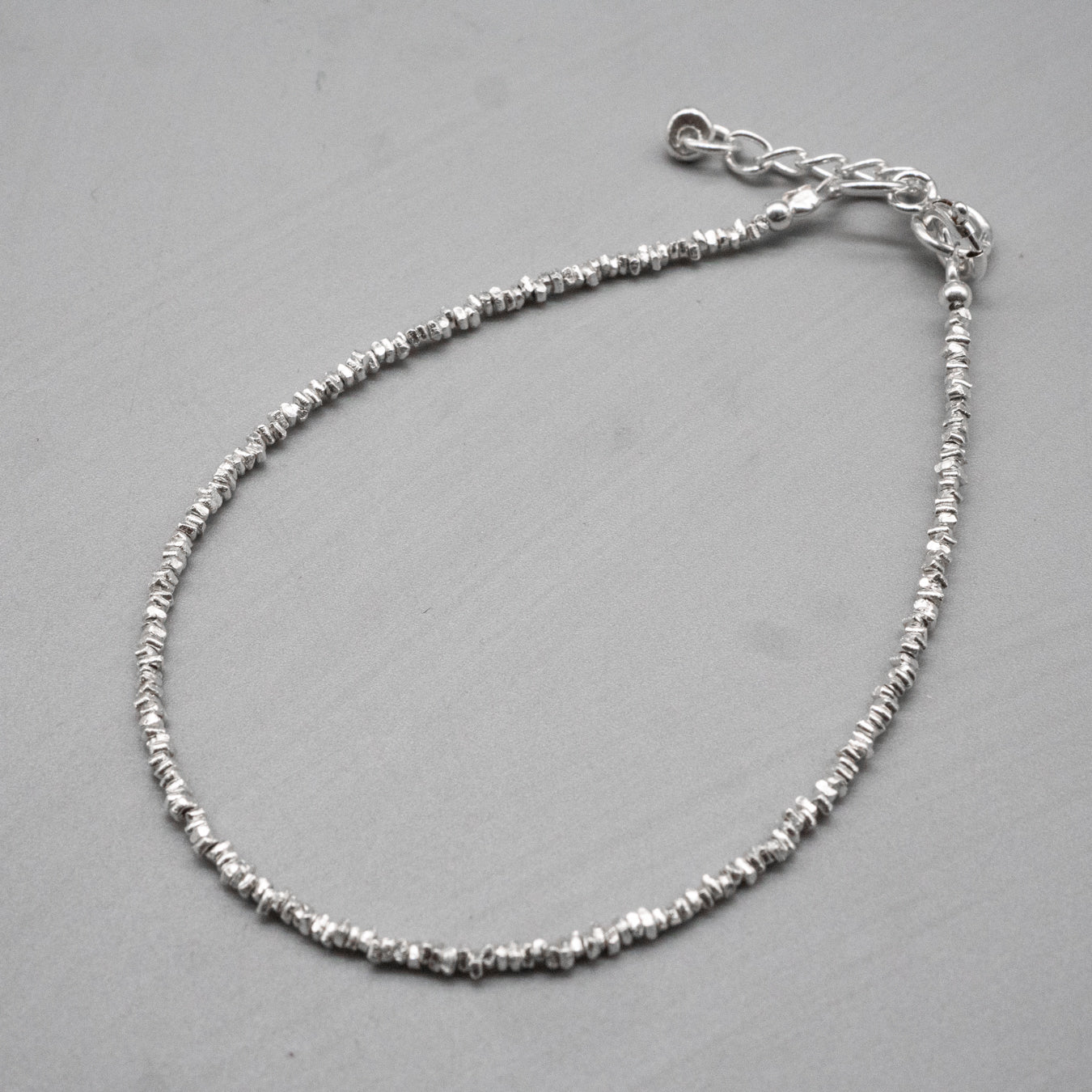 タイ北部からミャンマーにかけて分布する少数民族、カレン族が製作したシルバーアクセサリー。95%以上の高純度のシルバーで、軽くて柔らかいのが特徴です。さりげなく特徴的なデザインでとても付けやすいです。こちらはブレスレットになります。留め具の所からチェーンが出ており、長さの微調整が可能です。