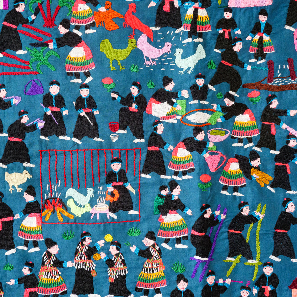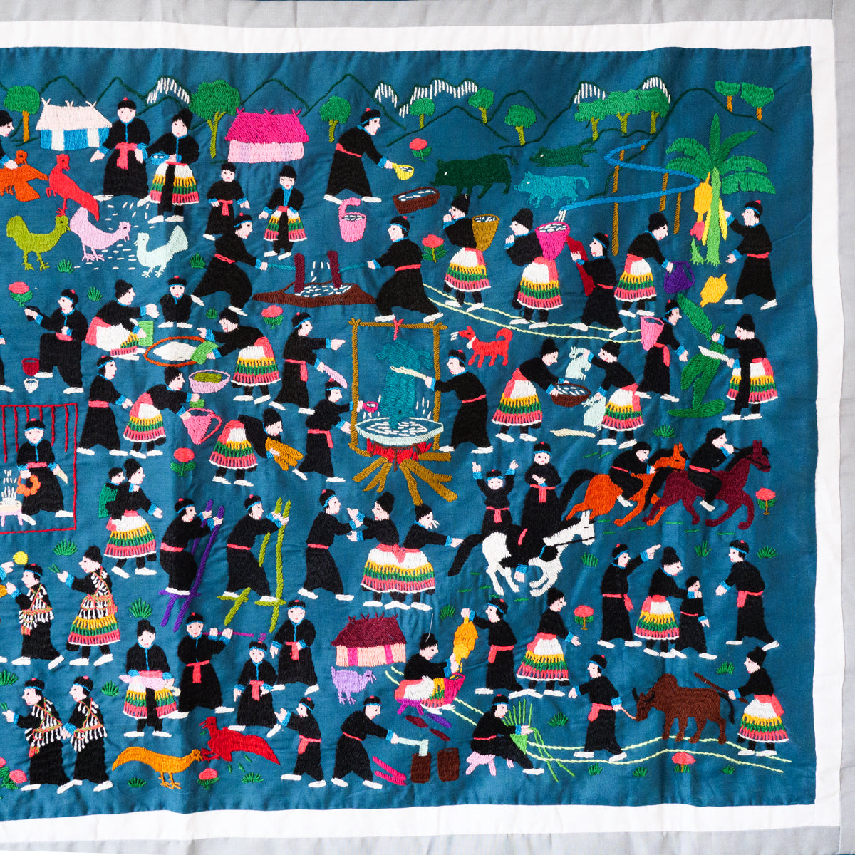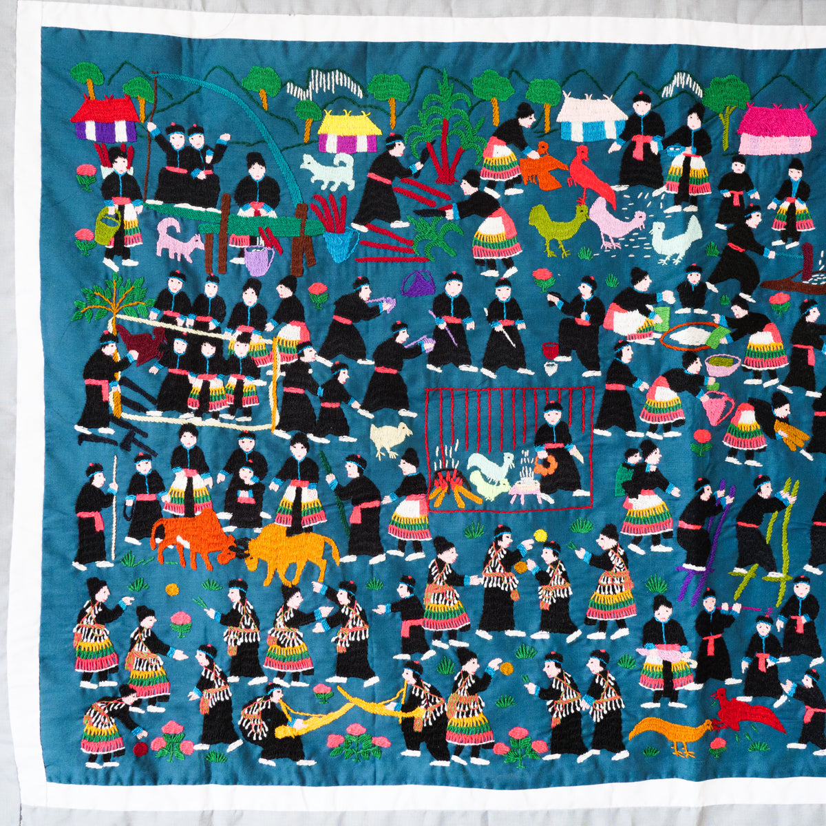 ラオス北部のモン族が彼らの生活様式を手刺繍で表したタペストリー。眺めているだけで幸せな気持ちになりそうな、微笑ましく愛らしい逸品です。
