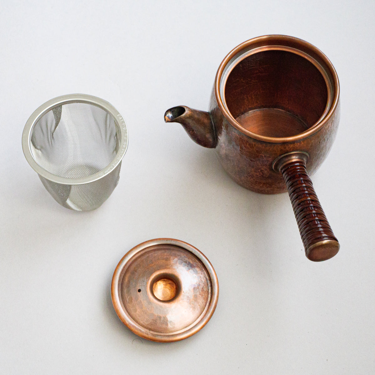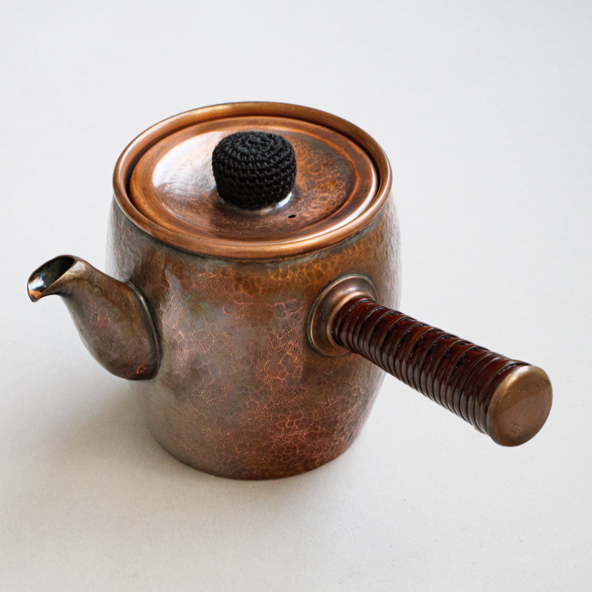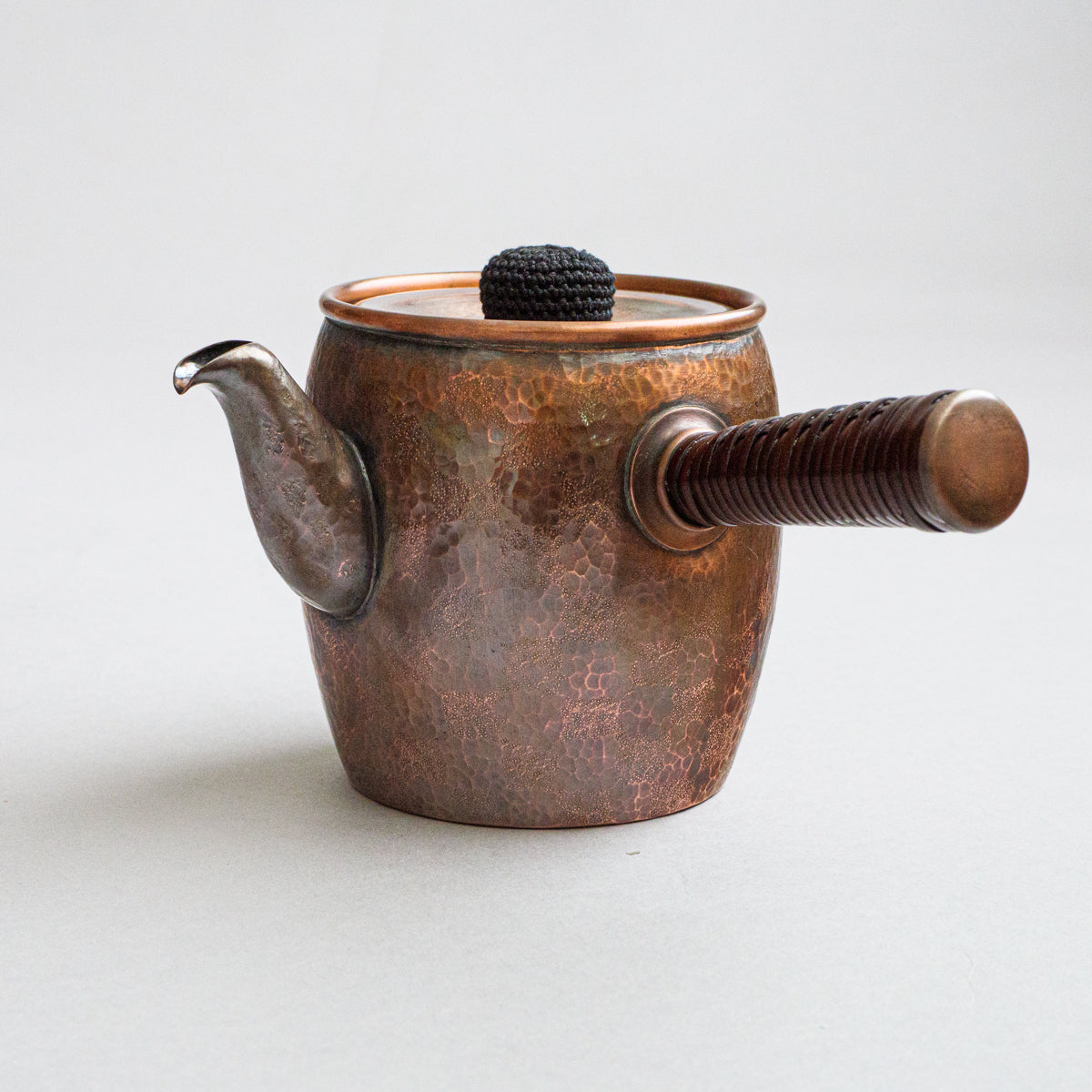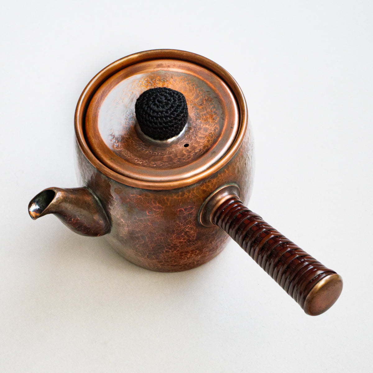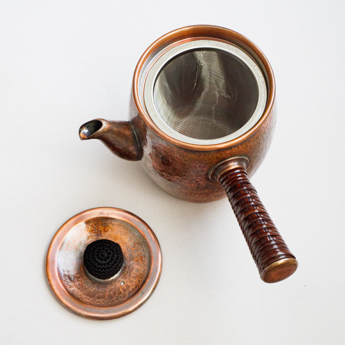 こちらは銅の急須で、持ち手は熱くならないように蔓を巻き付け、さらに持ち蓋には手編みキャップも付いております。装着可能な金属の茶こしアミも付属。銅は熱伝導が良いため、濃いお茶が好きな方にオススメで、さらに抗菌作用があるのでお手入れも乾拭きだけで大丈夫です。銅は経年変化も美しく、まさに一生ものの逸品です。また丹精に数千回も叩き描いた槌目模様は美しさだけではなく、本体の強度を増す役割も果たしています。