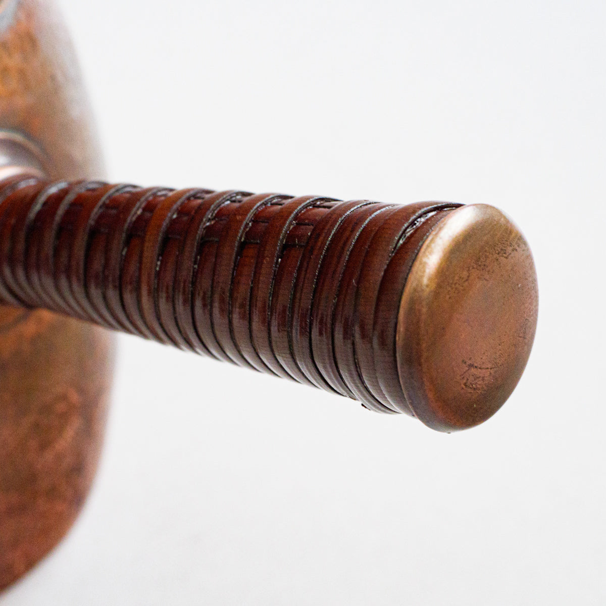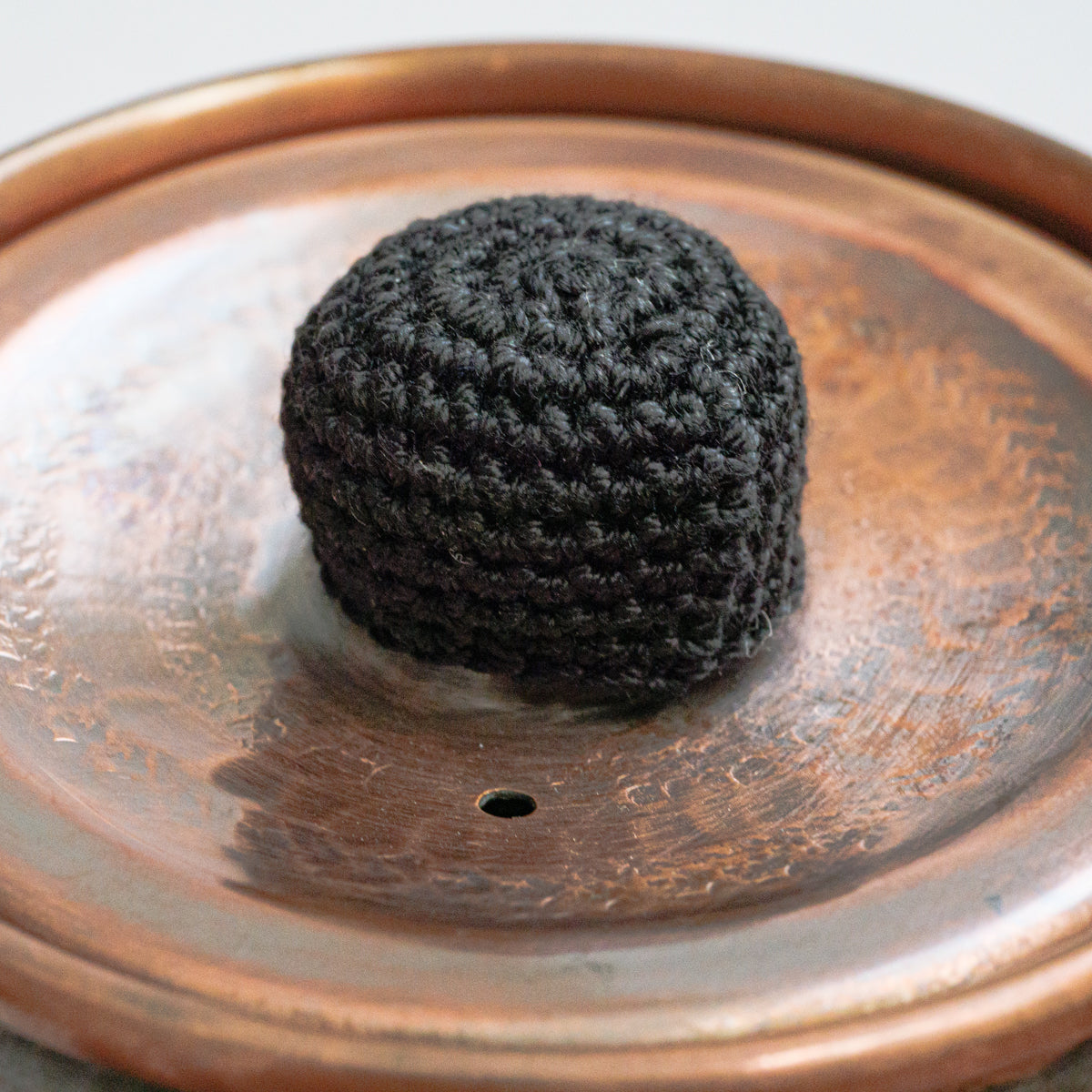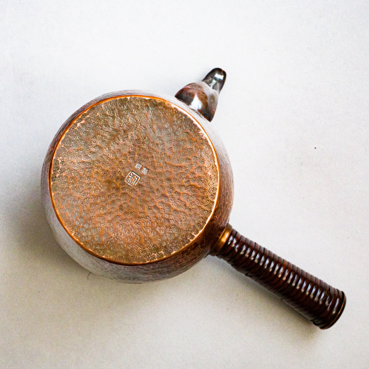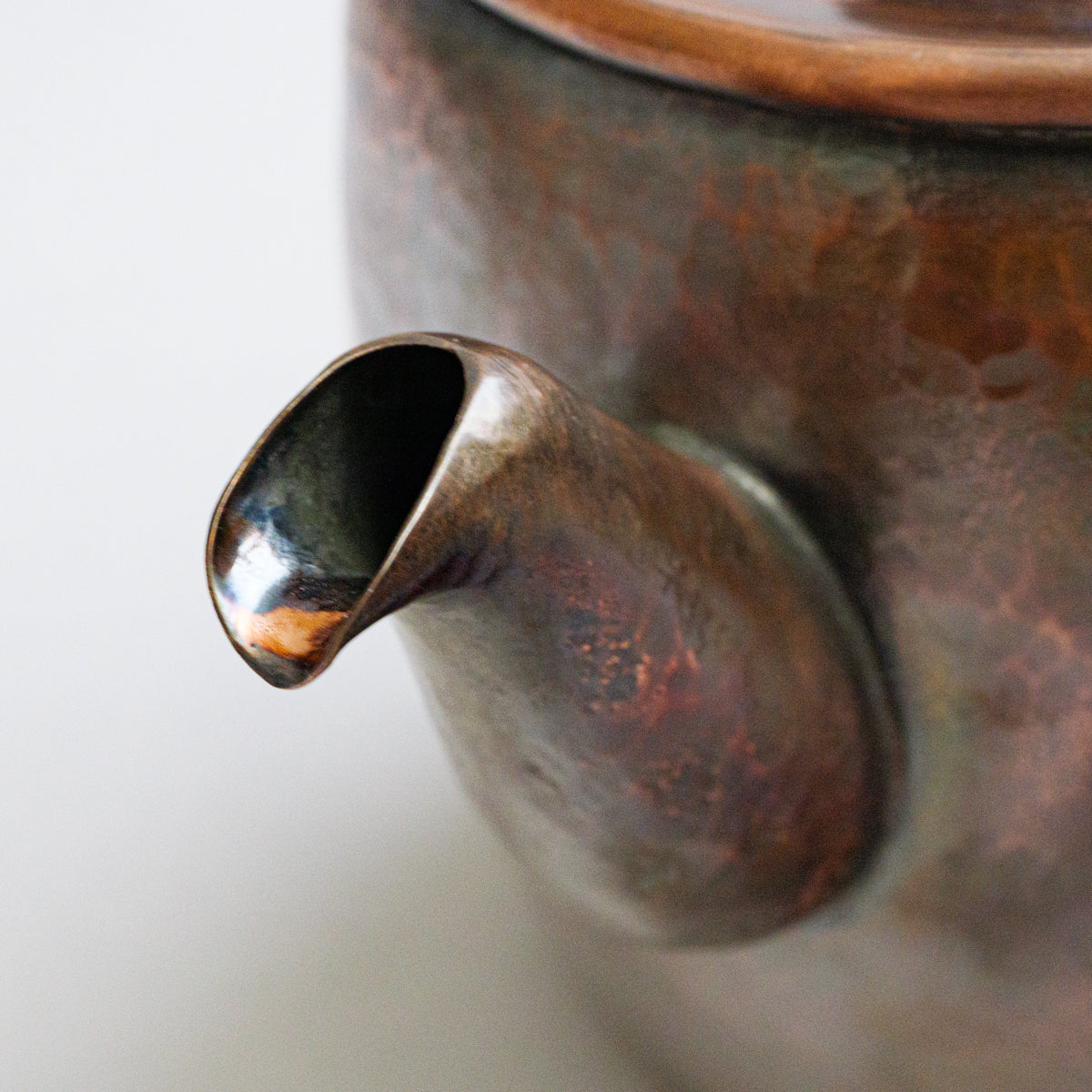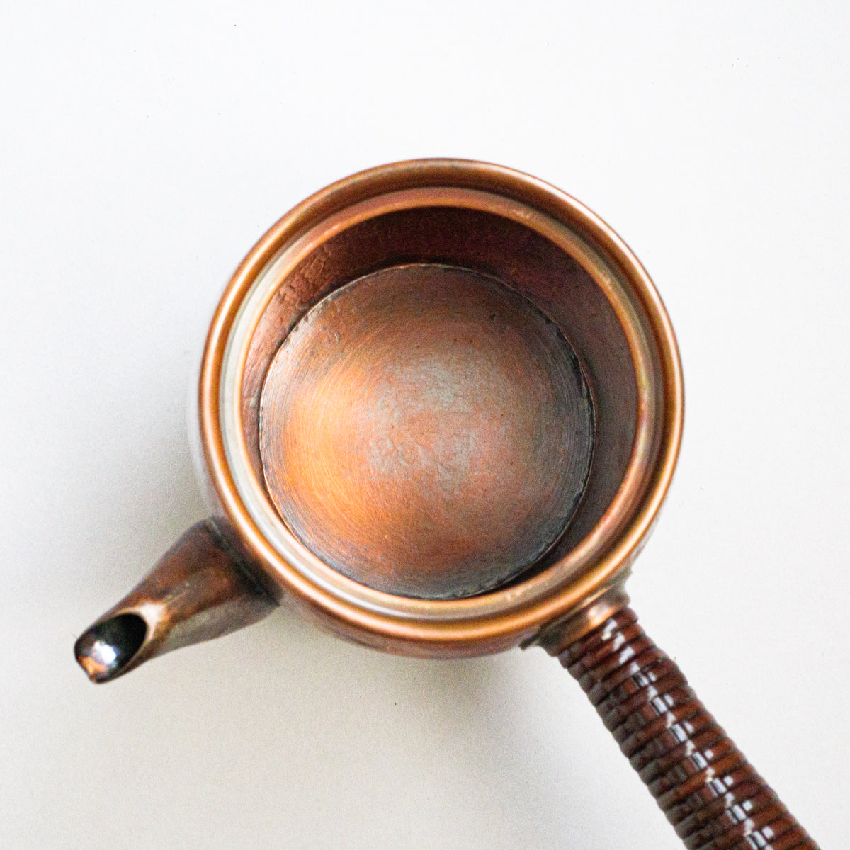 こちらは銅の急須で、持ち手は熱くならないように蔓を巻き付け、さらに持ち蓋には手編みキャップも付いております。装着可能な金属の茶こしアミも付属。銅は熱伝導が良いため、濃いお茶が好きな方にオススメで、さらに抗菌作用があるのでお手入れも乾拭きだけで大丈夫です。銅は経年変化も美しく、まさに一生ものの逸品です。また丹精に数千回も叩き描いた槌目模様は美しさだけではなく、本体の強度を増す役割も果たしています。