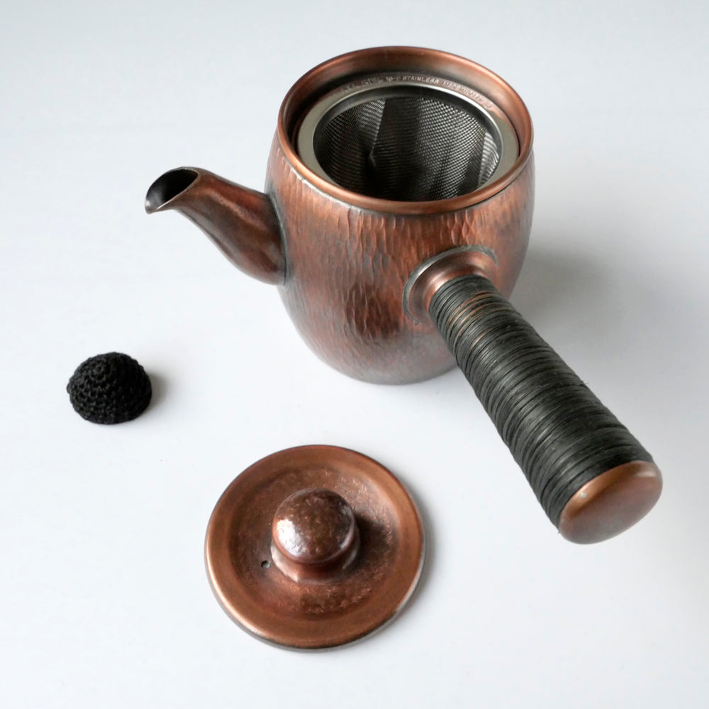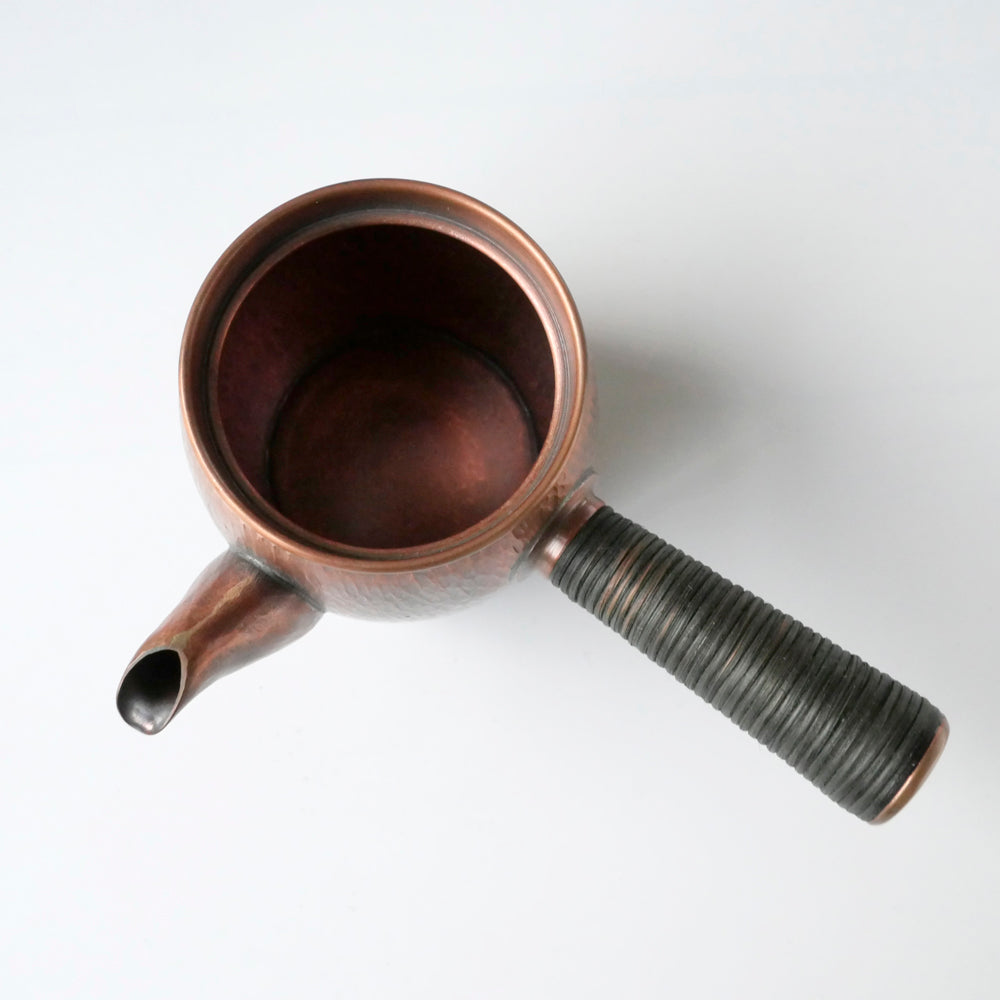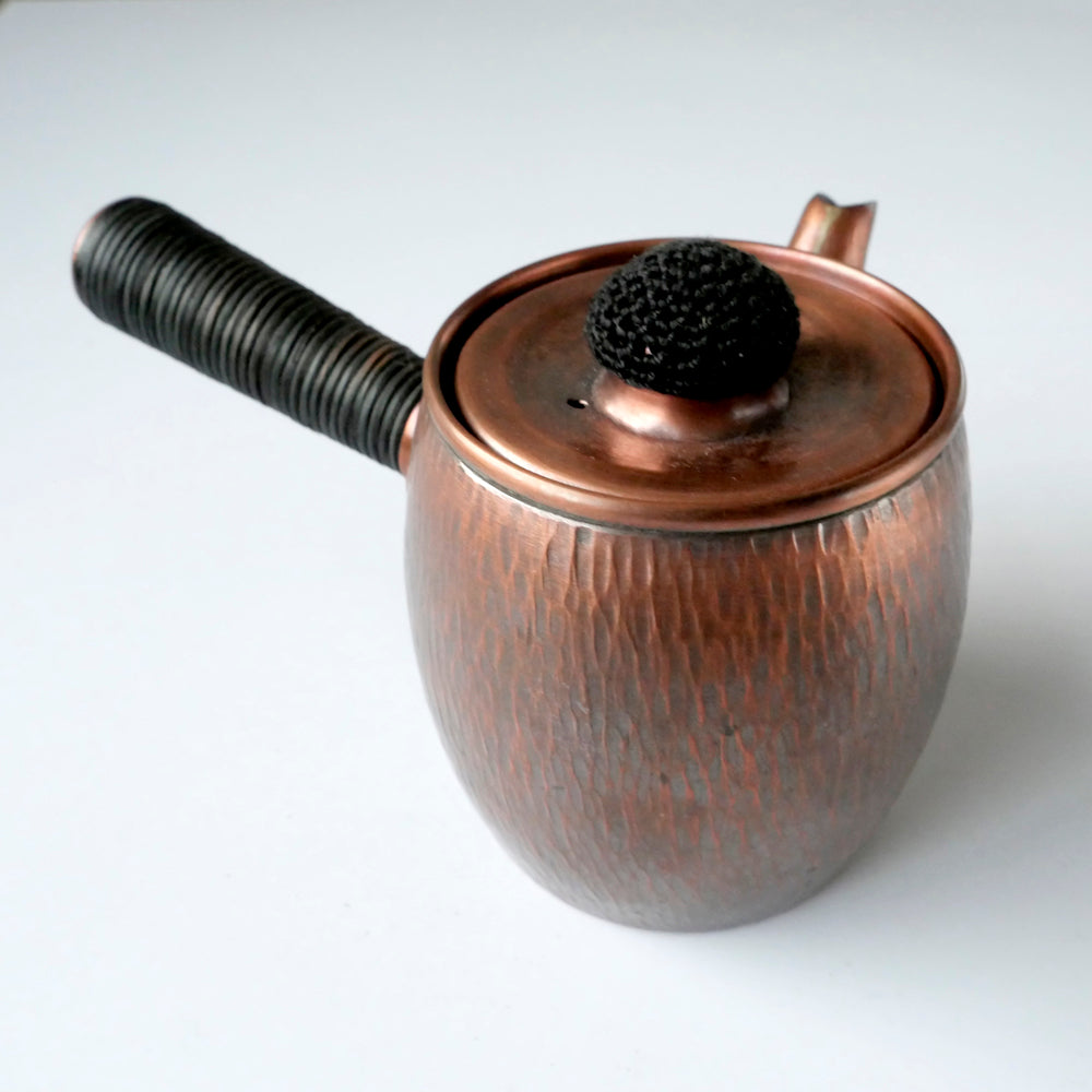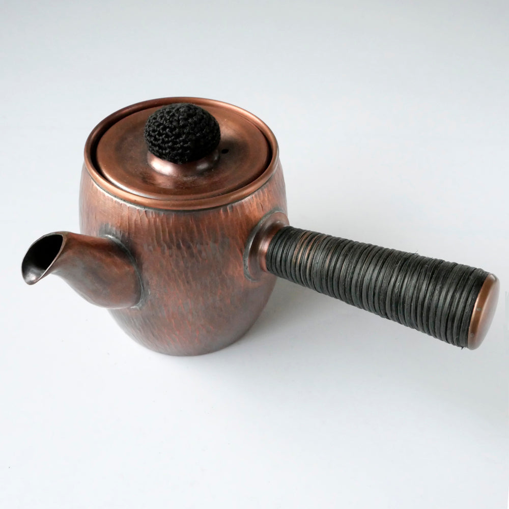 こちらは銅の急須で、持ち手は熱くならないように蔓を巻き付け、さらに持ち蓋には手編みキャップも付いております。装着可能な金属の茶こしアミも付属。銅は熱伝導が良いため、濃いお茶が好きな方にオススメで、さらに抗菌作用があるのでお手入れも乾拭きだけで大丈夫です。銅は経年変化も美しく、まさに一生ものの逸品です。また丹精に数千回も叩き描いた槌目模様は美しさだけではなく、本体の強度を増す役割も果たしています。