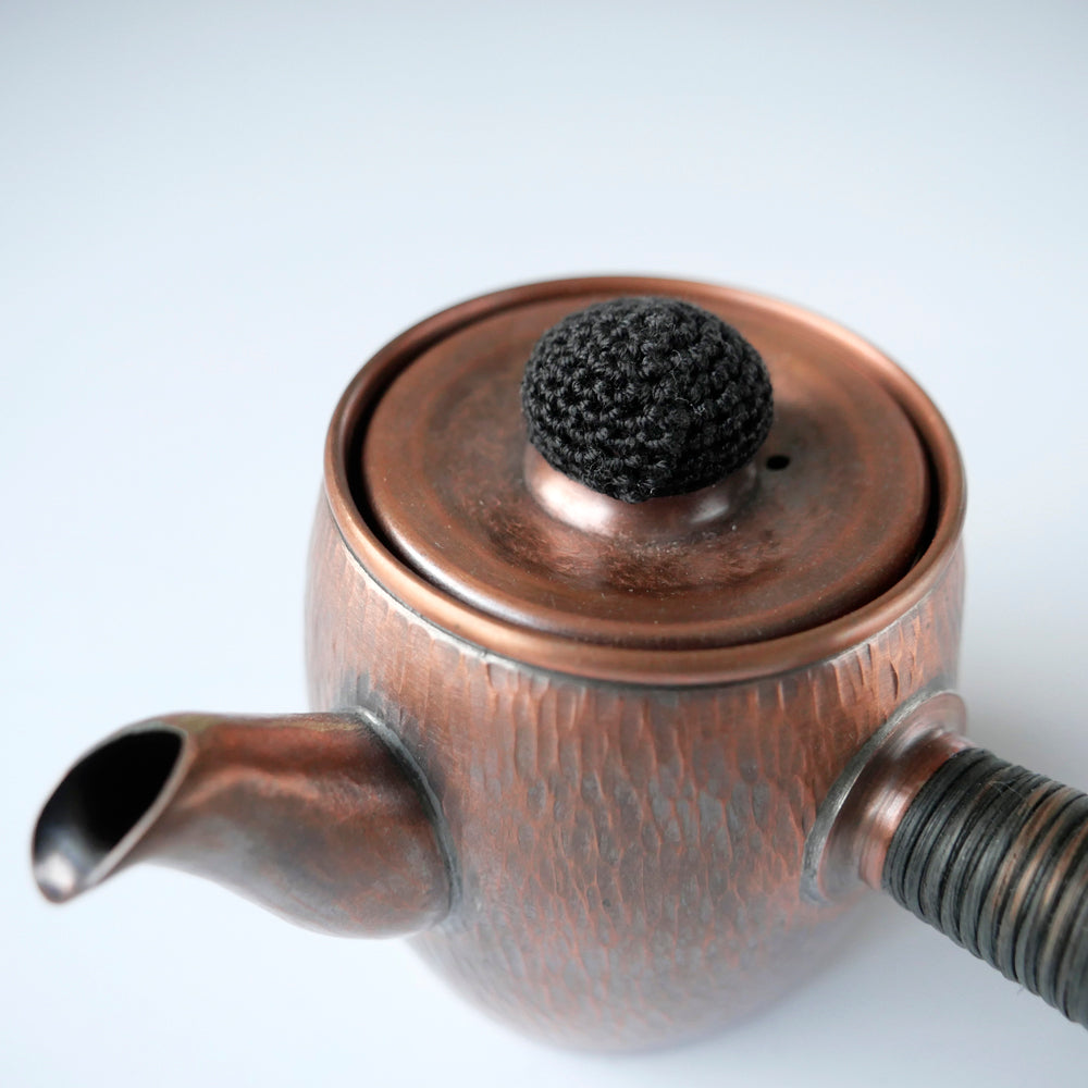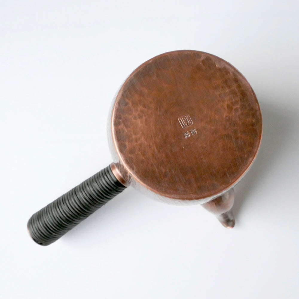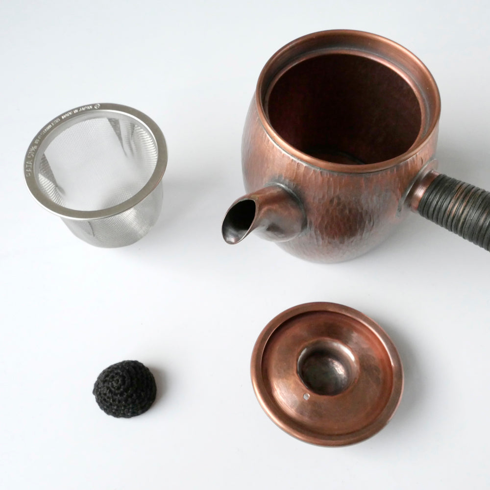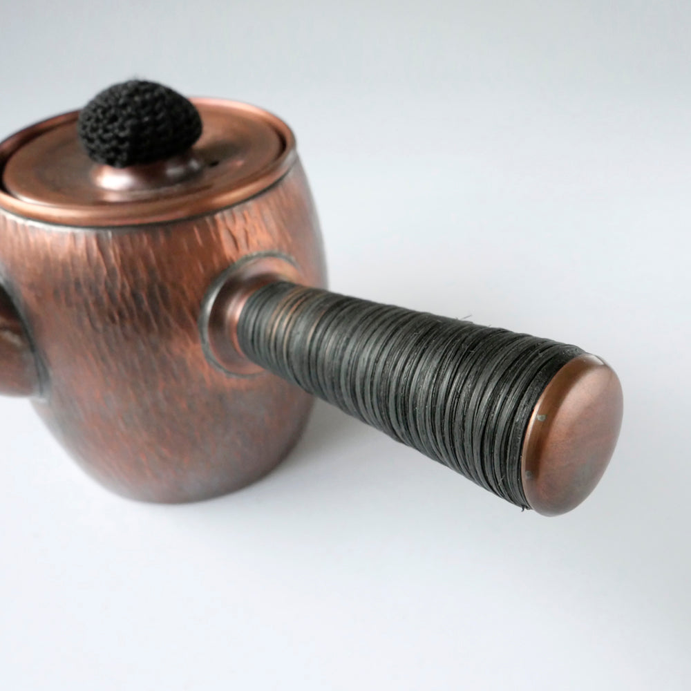 こちらは銅の急須で、持ち手は熱くならないように蔓を巻き付け、さらに持ち蓋には手編みキャップも付いております。装着可能な金属の茶こしアミも付属。銅は熱伝導が良いため、濃いお茶が好きな方にオススメで、さらに抗菌作用があるのでお手入れも乾拭きだけで大丈夫です。銅は経年変化も美しく、まさに一生ものの逸品です。また丹精に数千回も叩き描いた槌目模様は美しさだけではなく、本体の強度を増す役割も果たしています。