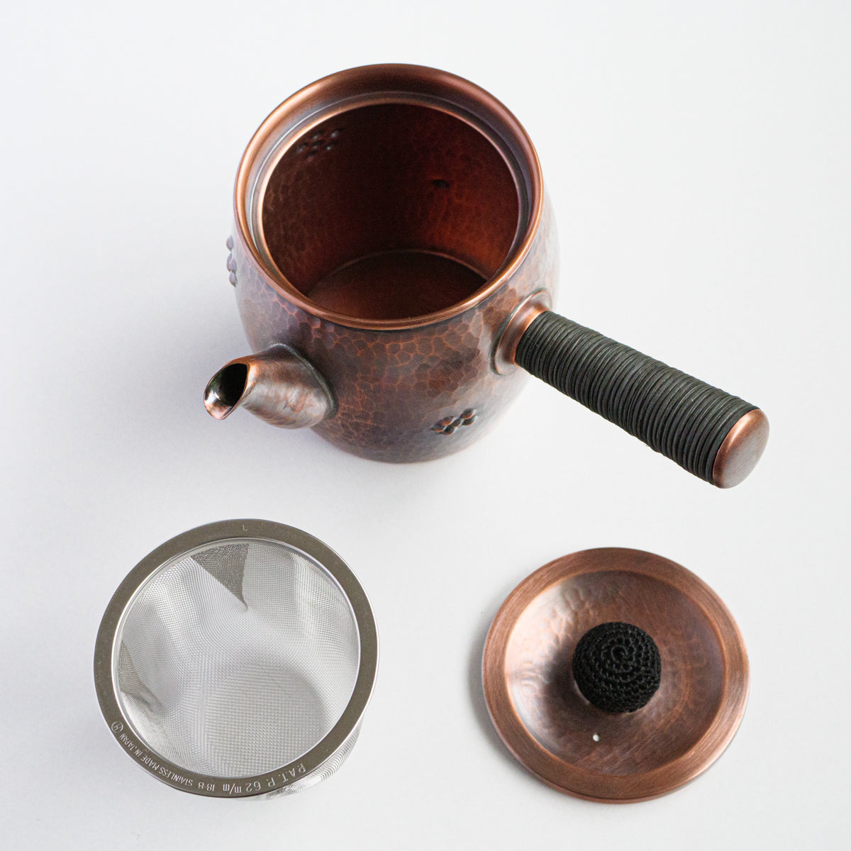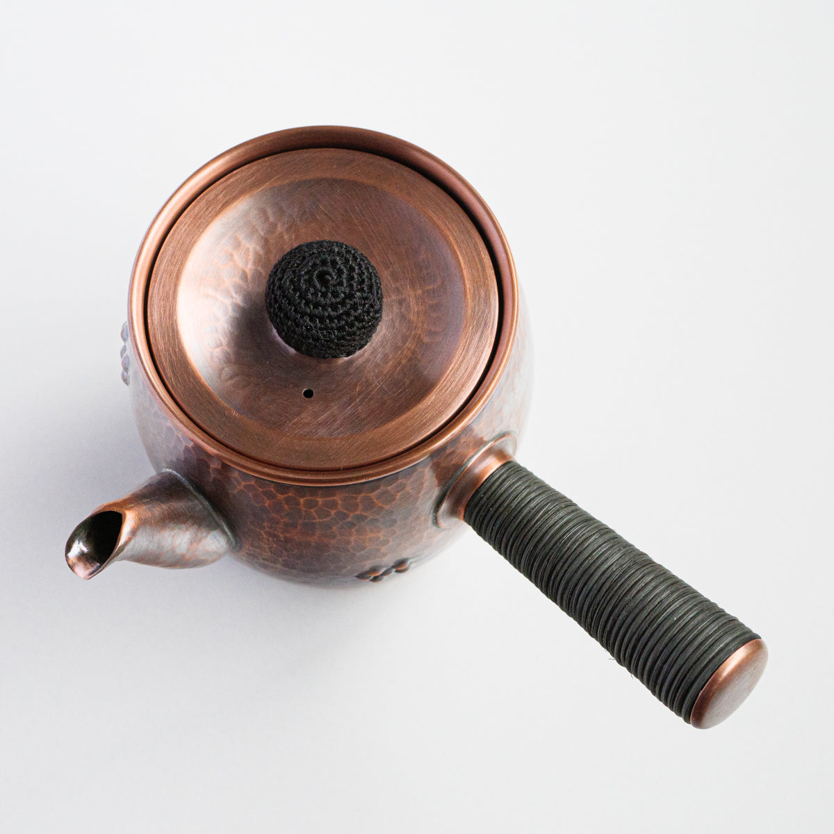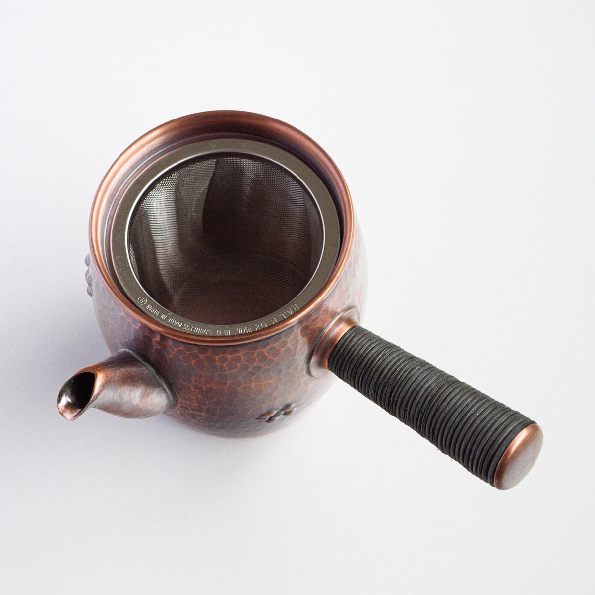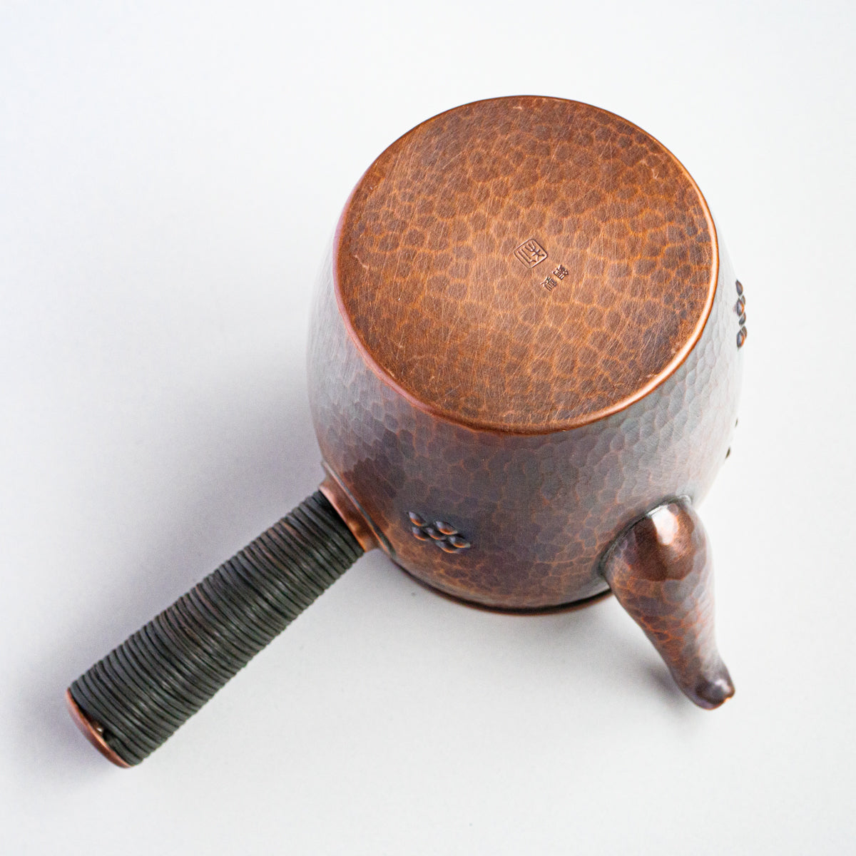 こちらは銅の急須で、持ち手は熱くならないように蔓を巻き付け、さらに持ち蓋には手編みキャップも付いております。装着可能な金属の茶こしアミも付属。銅は熱伝導が良いため、濃いお茶が好きな方にオススメで、さらに抗菌作用があるのでお手入れも乾拭きだけで大丈夫です。銅は経年変化も美しく、まさに一生ものの逸品です。また丹精に数千回も叩き描いた槌目模様は美しさだけではなく、本体の強度を増す役割も果たしています。