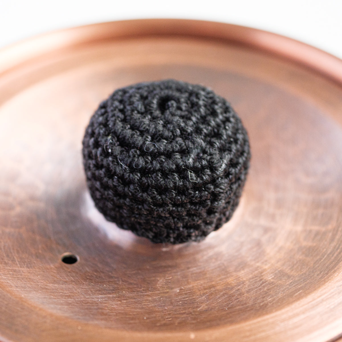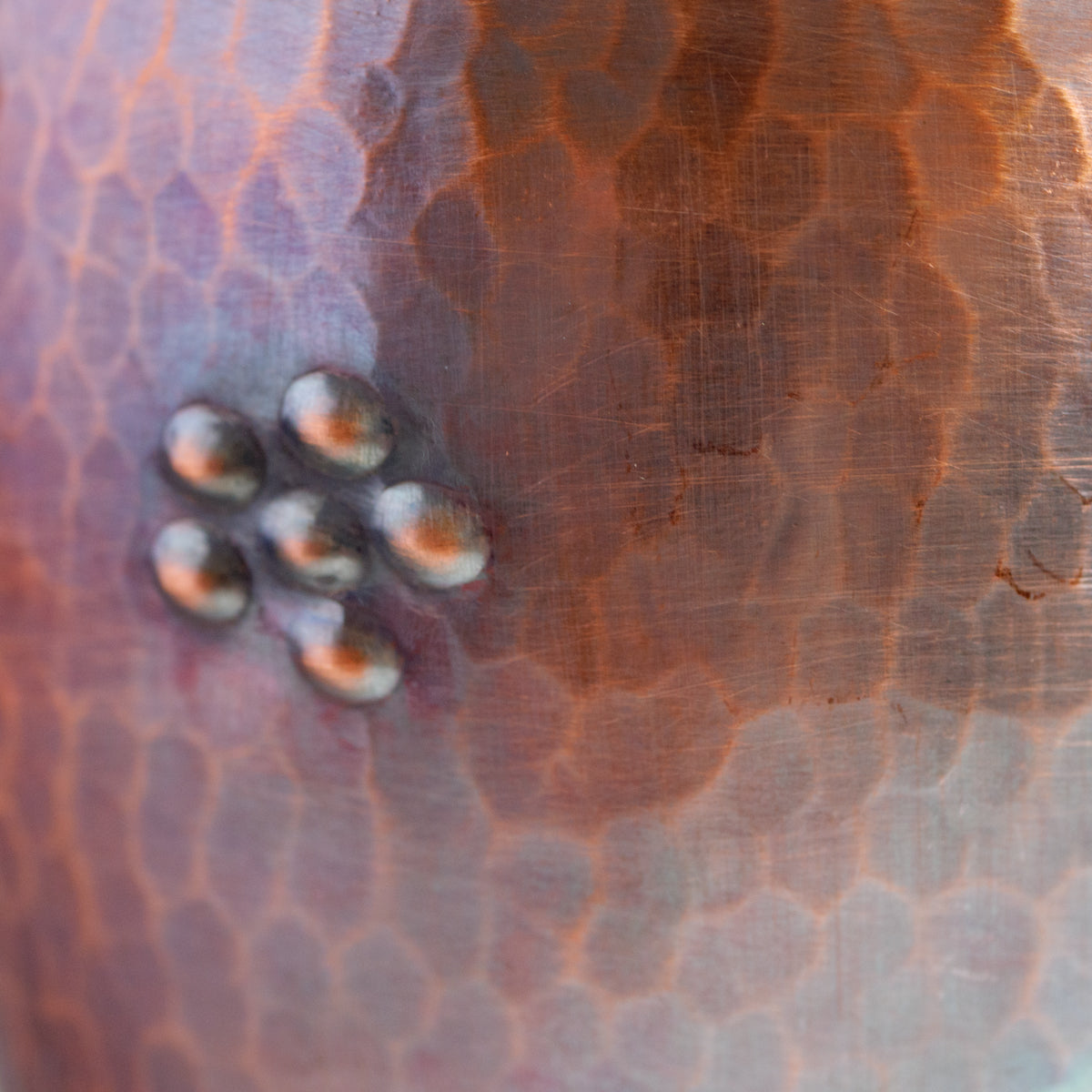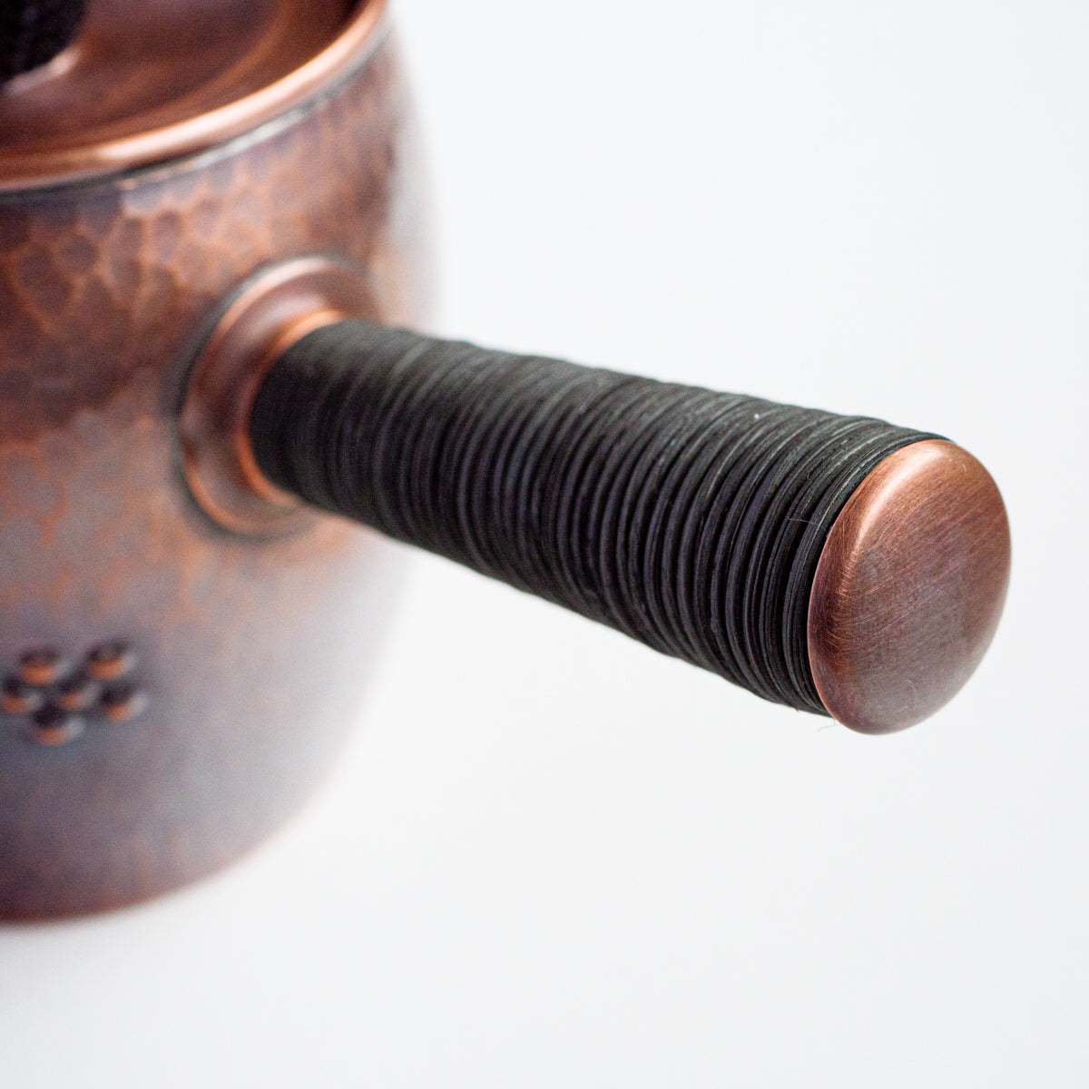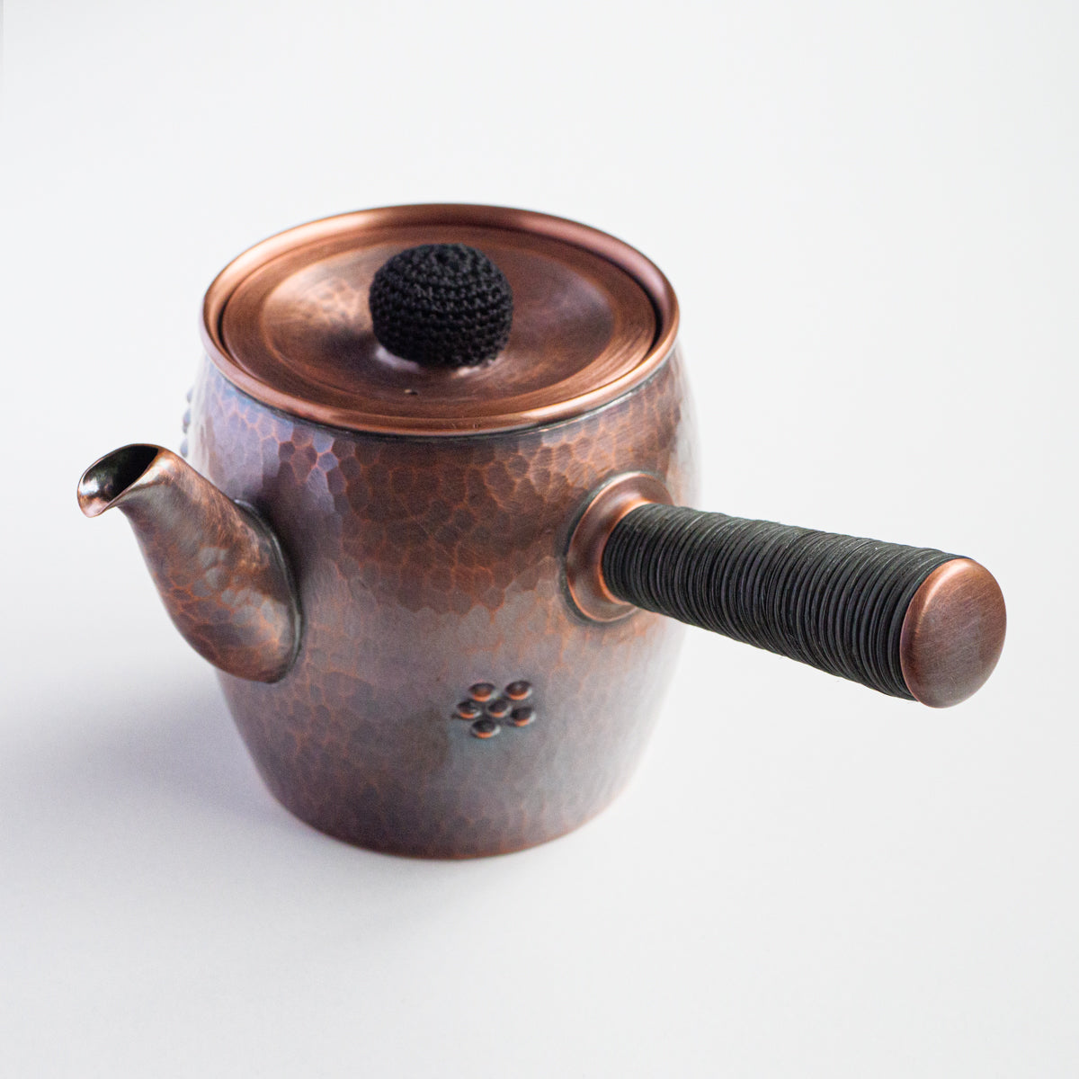 こちらは銅の急須で、持ち手は熱くならないように蔓を巻き付け、さらに持ち蓋には手編みキャップも付いております。装着可能な金属の茶こしアミも付属。銅は熱伝導が良いため、濃いお茶が好きな方にオススメで、さらに抗菌作用があるのでお手入れも乾拭きだけで大丈夫です。銅は経年変化も美しく、まさに一生ものの逸品です。また丹精に数千回も叩き描いた槌目模様は美しさだけではなく、本体の強度を増す役割も果たしています。