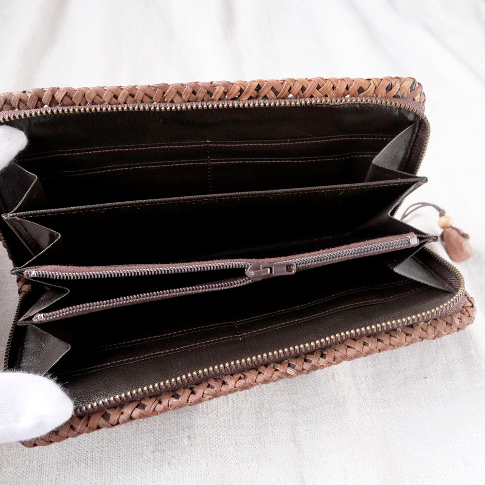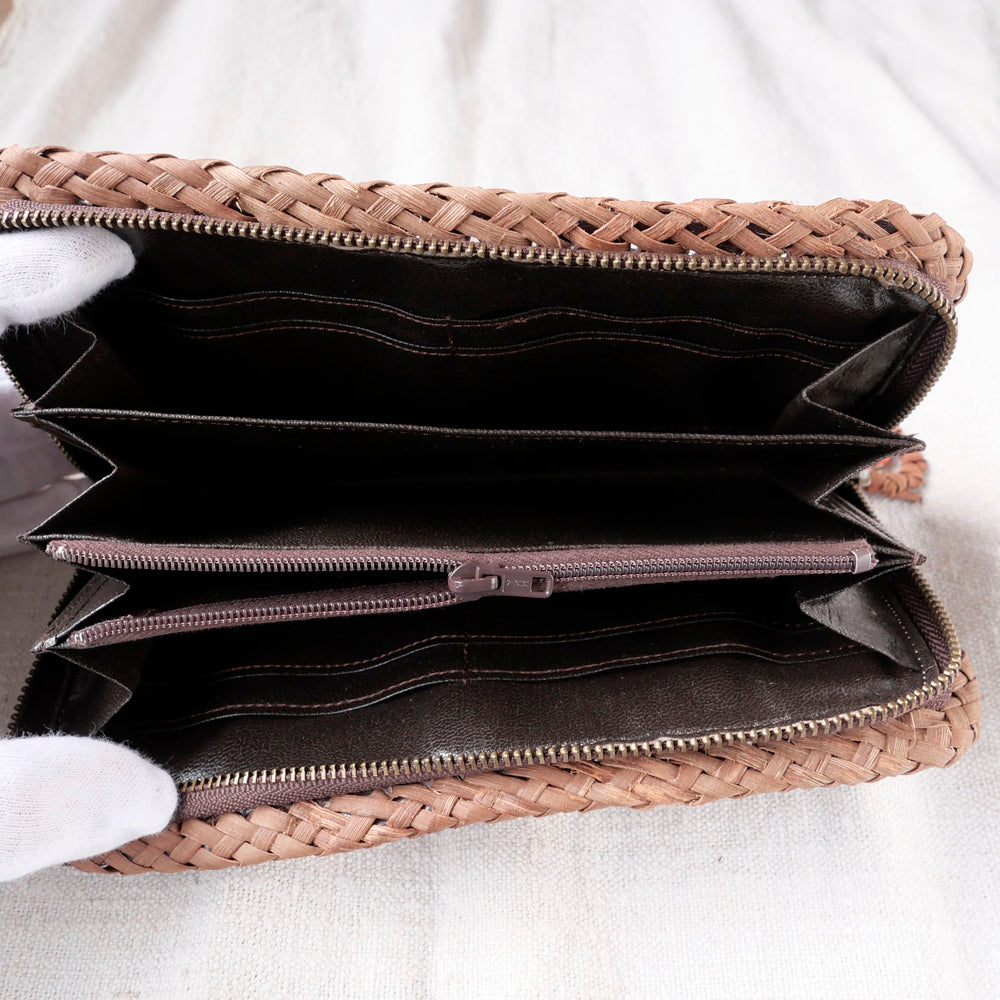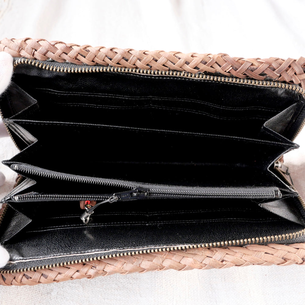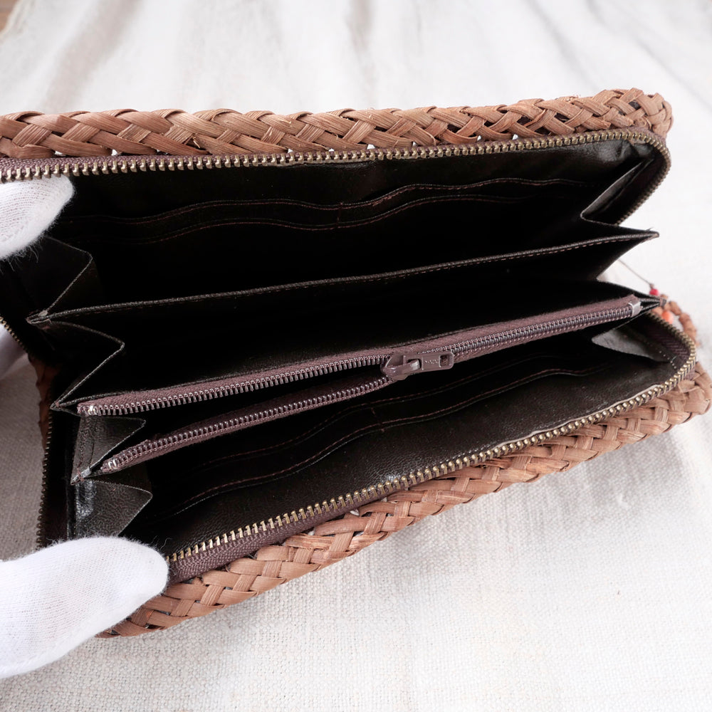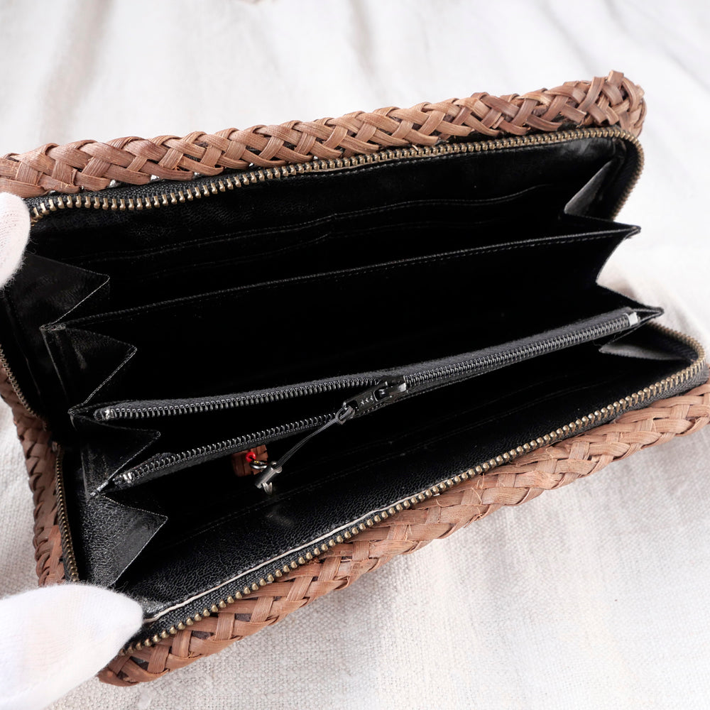 新潟の裂織り/山葡萄作家さん仁科俊子氏による山葡萄の長財布。内側には濡れに強い合皮を使用しております、長財布ならでは収納する場所がたくさん付いてます。使用するごとに、表面が手の脂でとても美しい飴色に経年変化をしてきます。