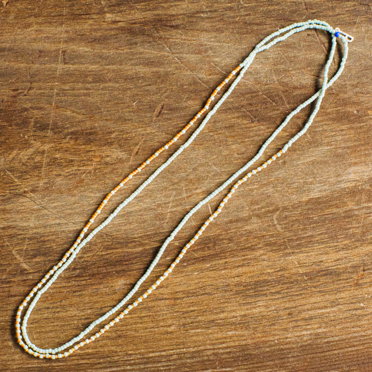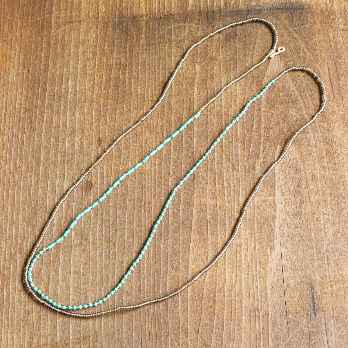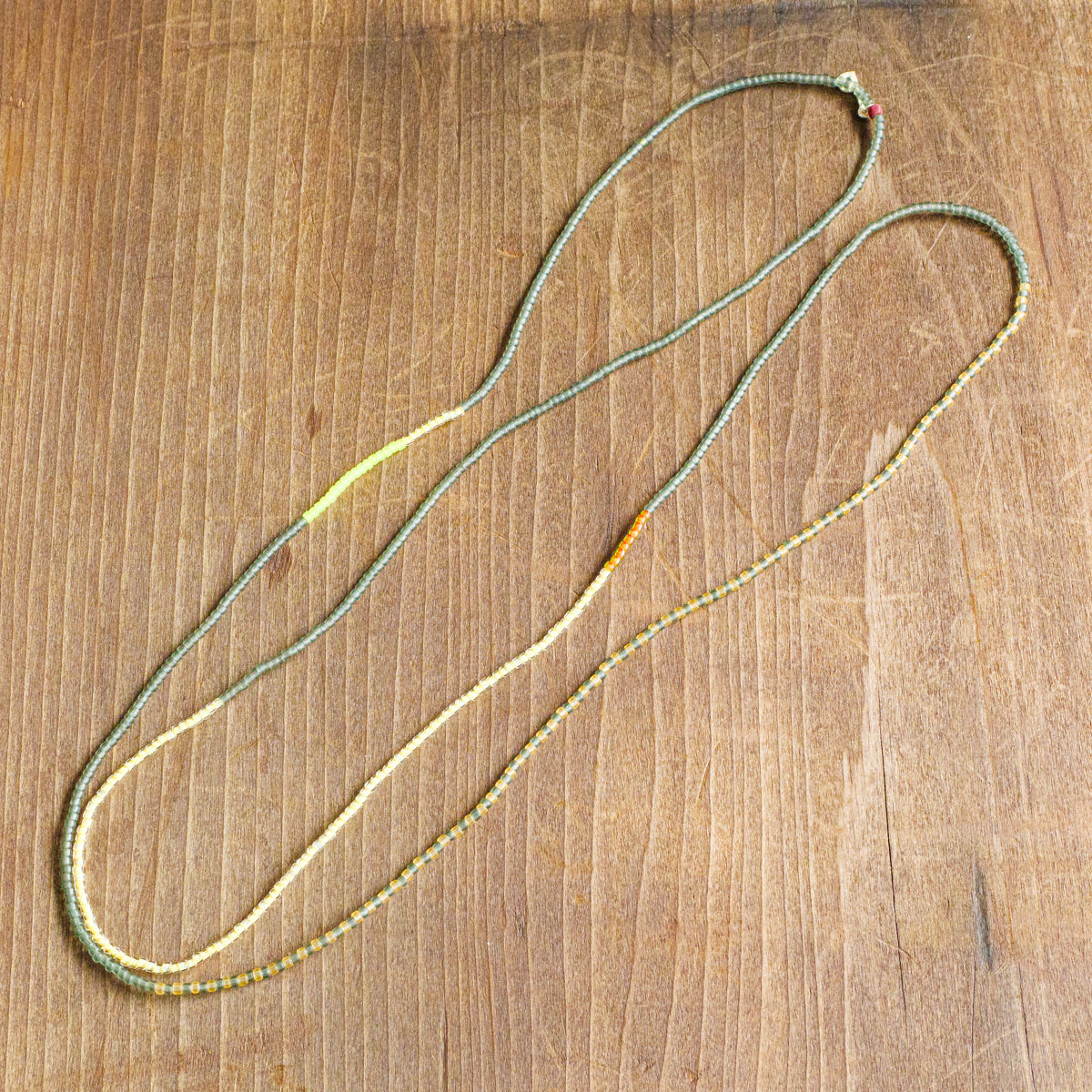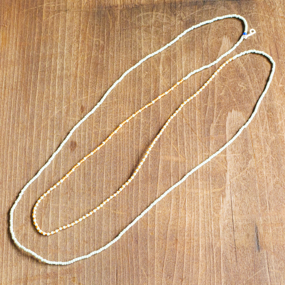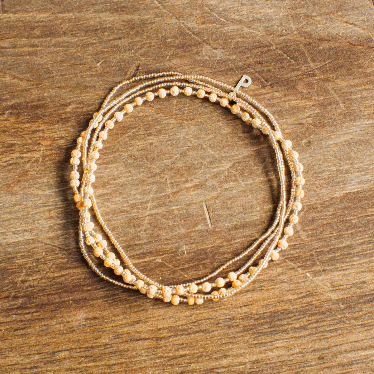 当店で大人気のインドネシアのバリのブランドPERAPERAKによるビーズのネックレス。中にはシリコンゴムが入っているので伸縮性がありとても便利です。ぐるっと巻いて、短めのネックレスにもなりますし、さらにぐるぐる巻くとバングルやアンクレットとしてもご使用になれます。表記のとおり、一部のデザインには菩提樹の実が付いています。
