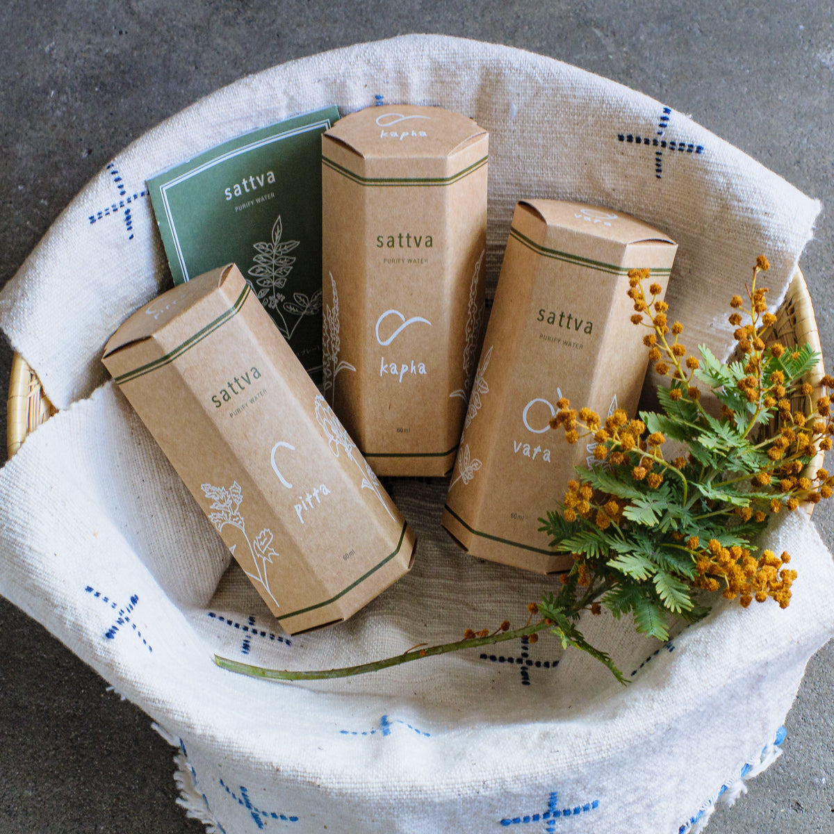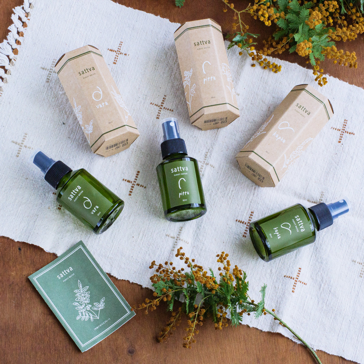 サットヴァは、インドの伝統医療「アーユルヴェーダ」の考えを取り入れた天然のアロマスプレー。私たちの心身や、身の回りの世界を司っている「ドーシャ」と呼ばれる三つの要素、カファー(Kapha)、ピッタ(Pitta)、ヴァータ(Vata)をバランスさせる香りを、それぞれ三タイプご用意しました。