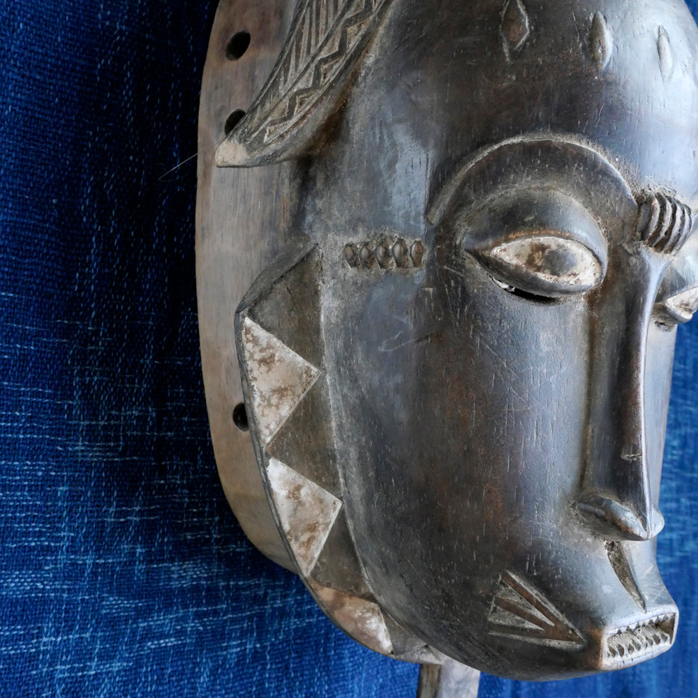 達観したかのような表情が妙に迫力がある美しい女性像の仮面。状態もとても良好で、お部屋に抜群のインテリア効果をもたらしてくれます。