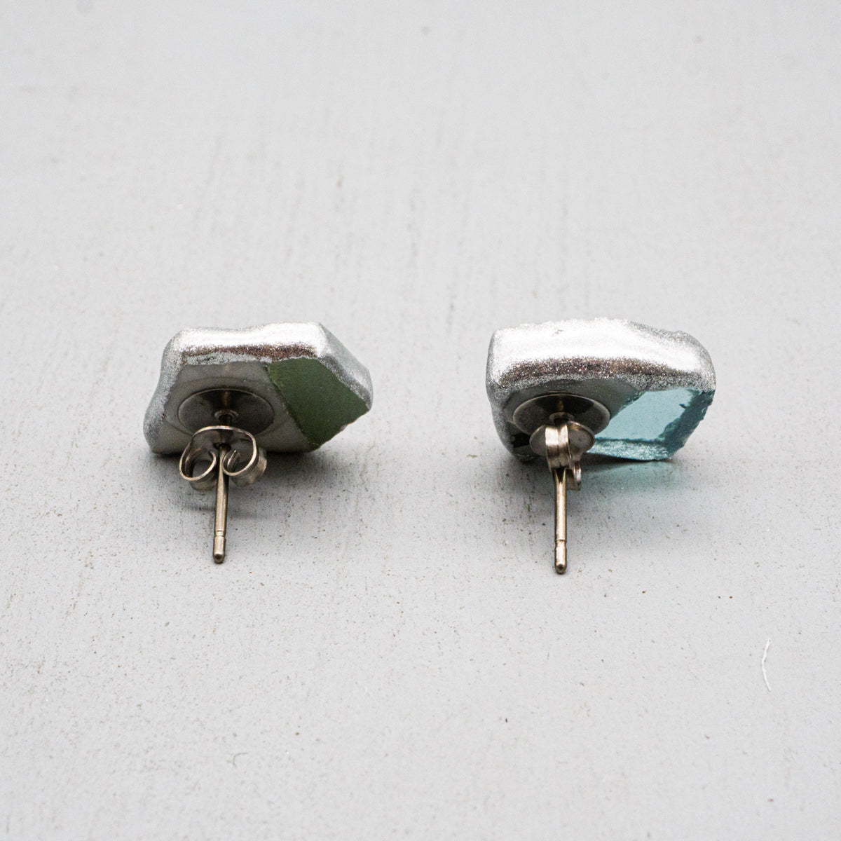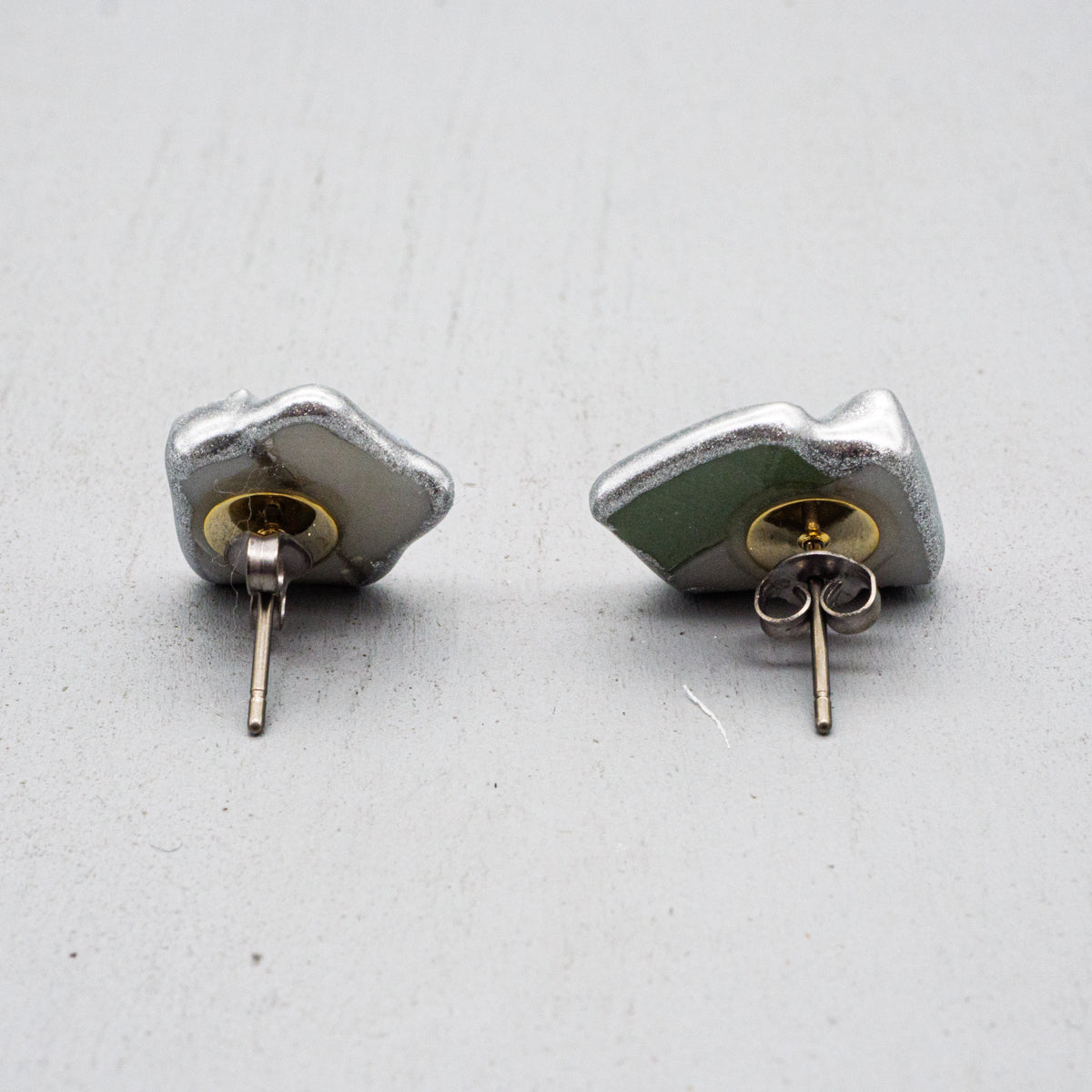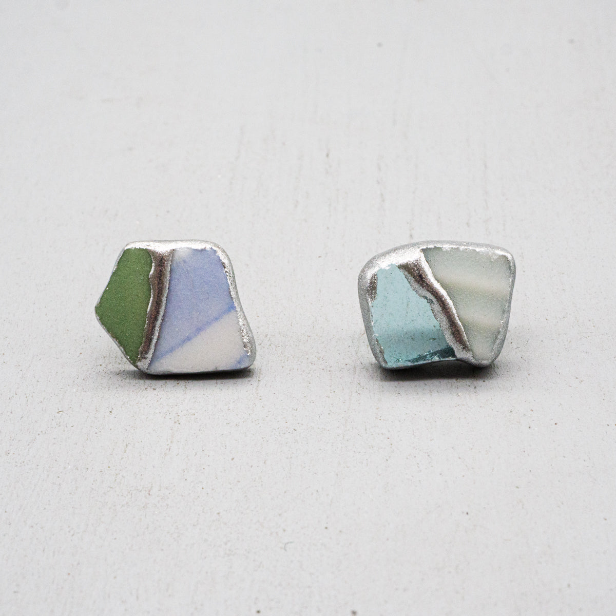 福島会津の伝統的な焼き物じゃんがら焼きの陶器の破片を使用したアクセサリー。1つとして同じものがない、まるで宝物のようなアクセサリーです。こちらは少しだけ大きめの破片を使用したcakeraシリーズ。イヤリングの方は耳への装着部分は最後のお写真にあるように、目立たない透明タイプになります。