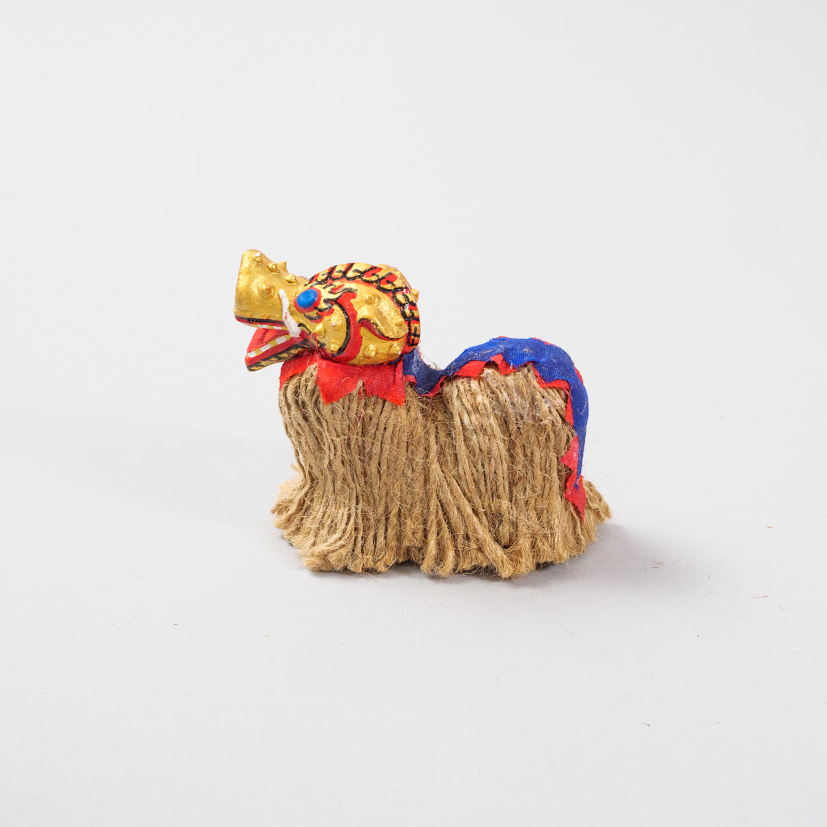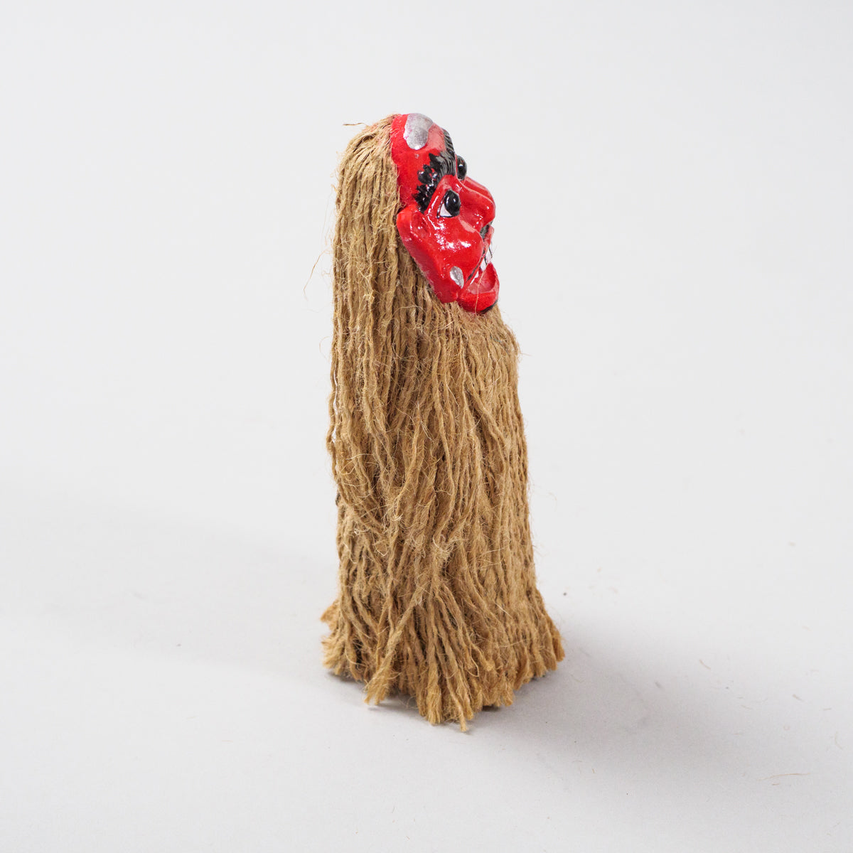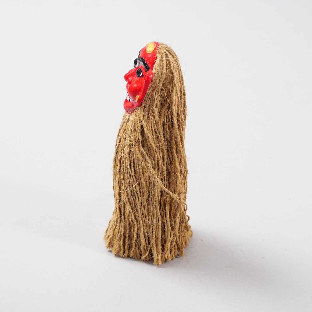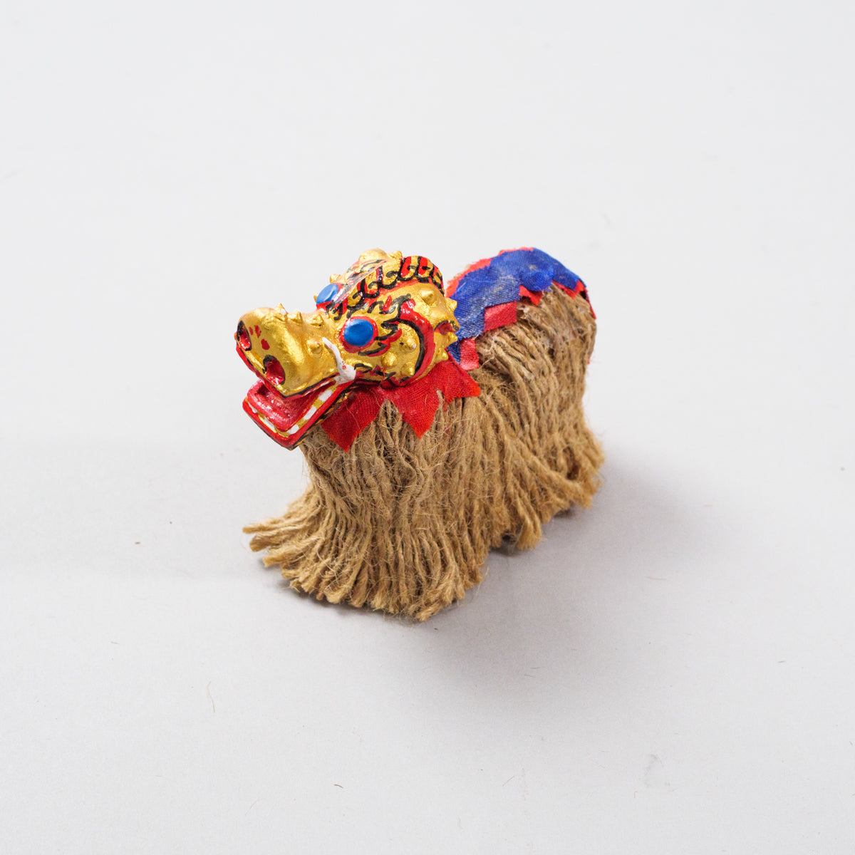 木材と麻紐で作られたラオスのお正月に登場する精霊人形のプーニュ・ニャーニュ・シィン。諸説があるのですが、人間が作り出した精霊がプーニュとニャーニュで、その遣いが獅子のシィンとのことです。すっとぼけた、真っ赤なお顔が可愛らしい置物人形で、芯には木材が使用されており、胴体部分には麻紐が垂れ下がっています。なお獅子のお顔部分は紙粘土で作られているため、お取り扱いにご注意ください。