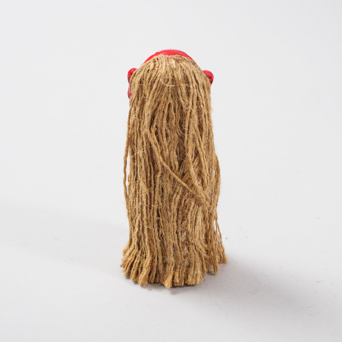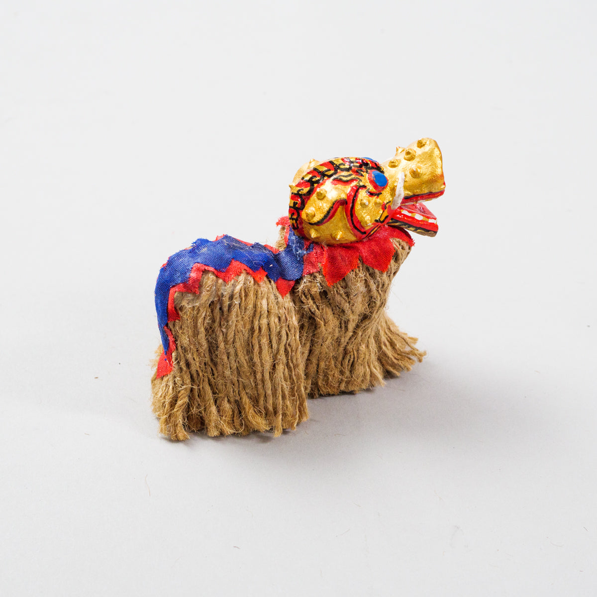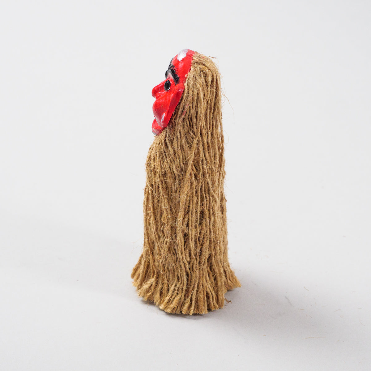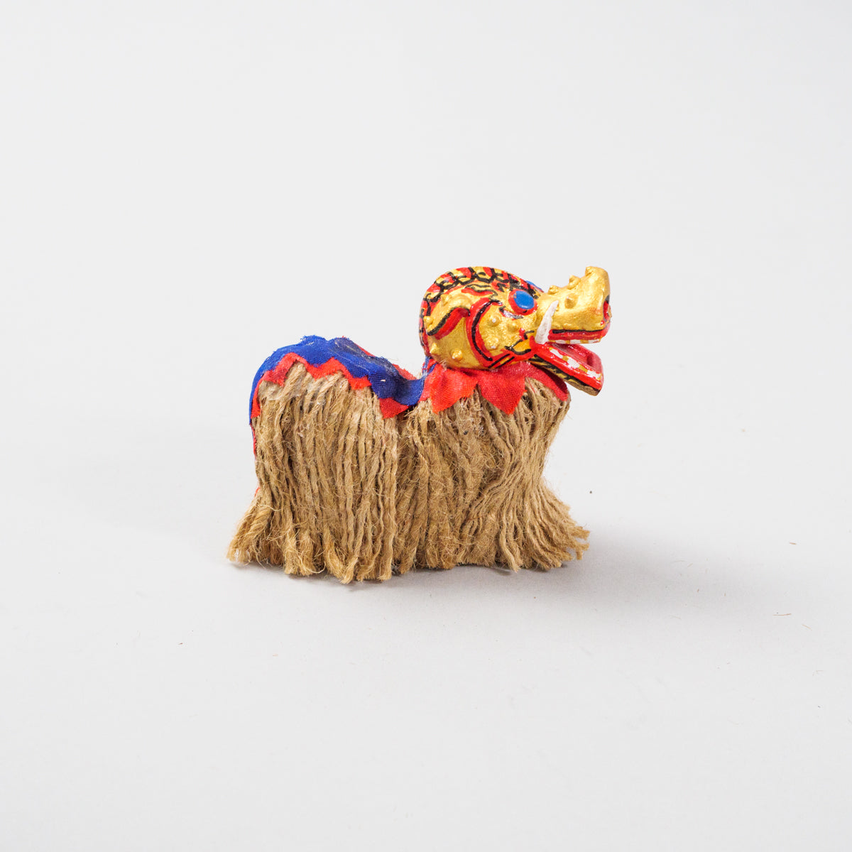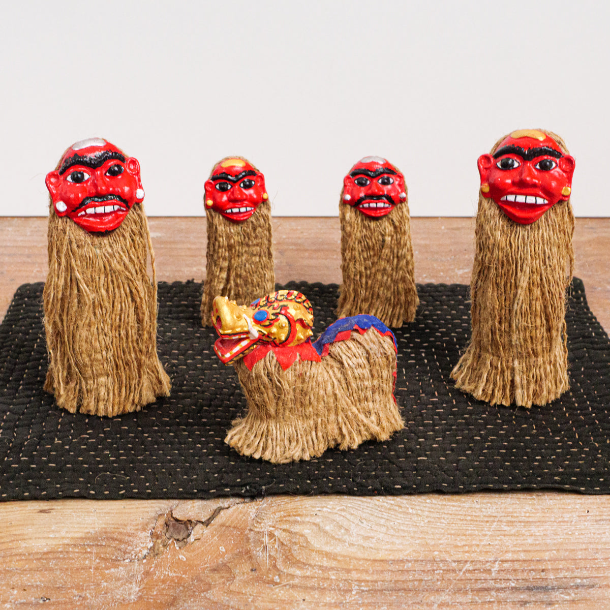 木材と麻紐で作られたラオスのお正月に登場する精霊人形のプーニュ・ニャーニュ・シィン。諸説があるのですが、人間が作り出した精霊がプーニュとニャーニュで、その遣いが獅子のシィンとのことです。すっとぼけた、真っ赤なお顔が可愛らしい置物人形で、芯には木材が使用されており、胴体部分には麻紐が垂れ下がっています。なお獅子のお顔部分は紙粘土で作られているため、お取り扱いにご注意ください。