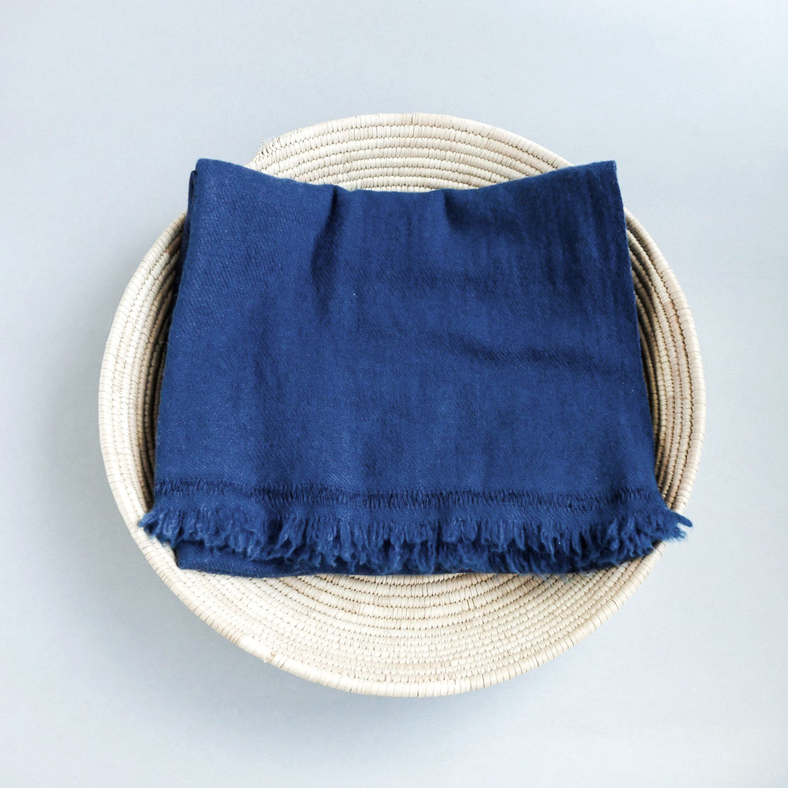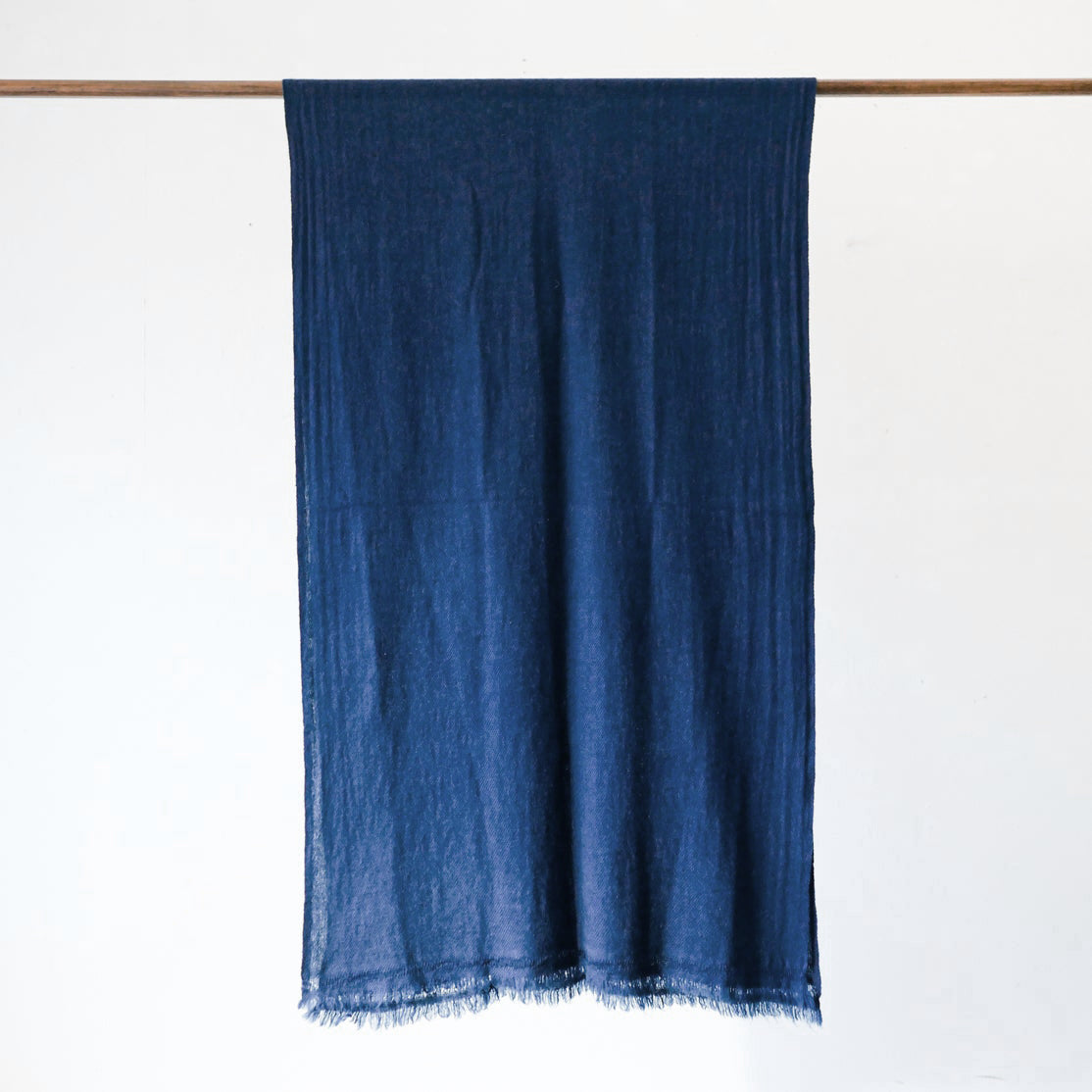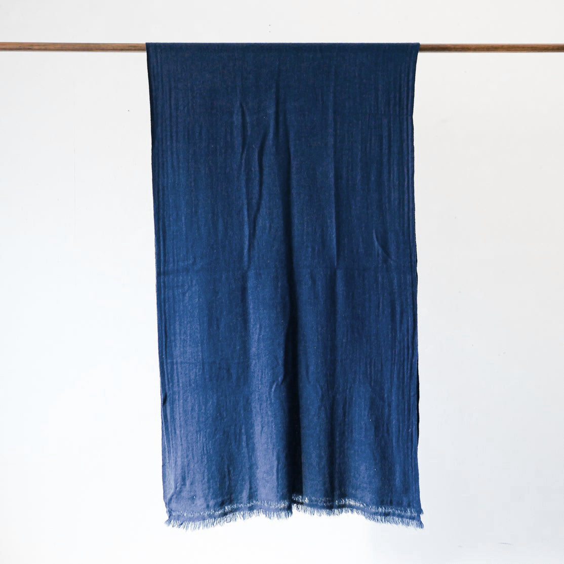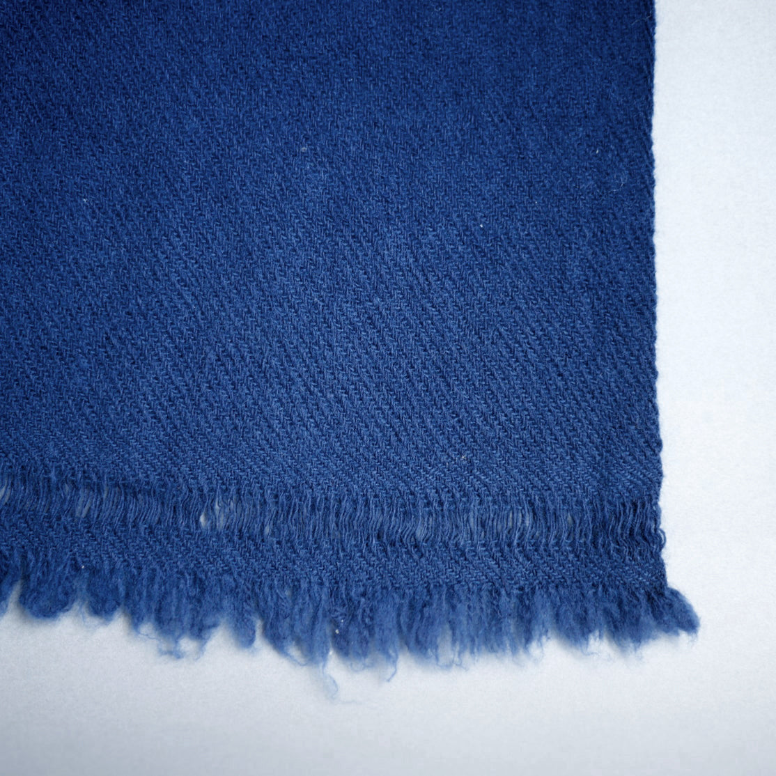 とても繊維が細く弾力性があり、極上の柔らかさを誇る高級素材である手織りのカシミヤのマフラー。ヒマラヤ山脈に生息する山羊の毛を使用したもので、こちらは藍染めを施したものになります。厚さ的には通常の真冬タイプよりも少し薄手なので、真冬を越しても着けられます。保温性や保湿性に優れており、とても重宝します。お洗濯の際にはドライクリーニングに出してください。