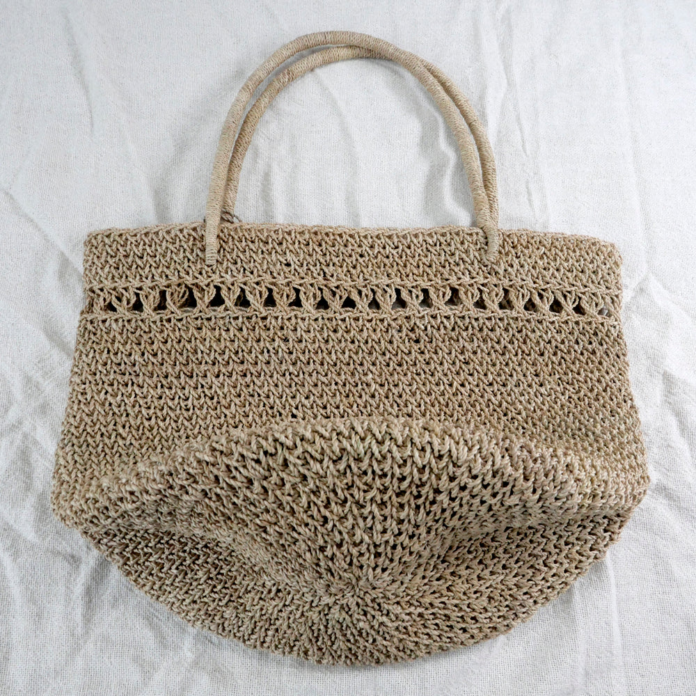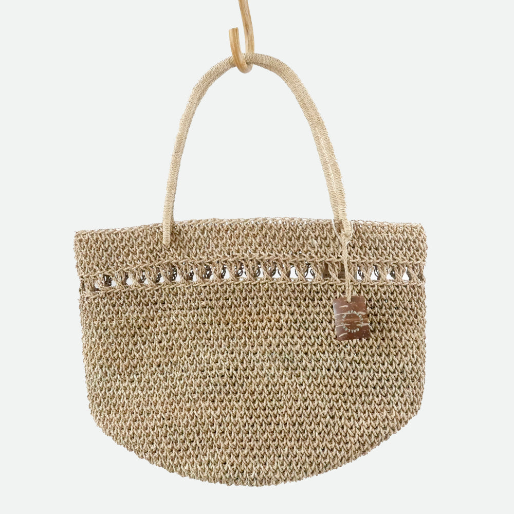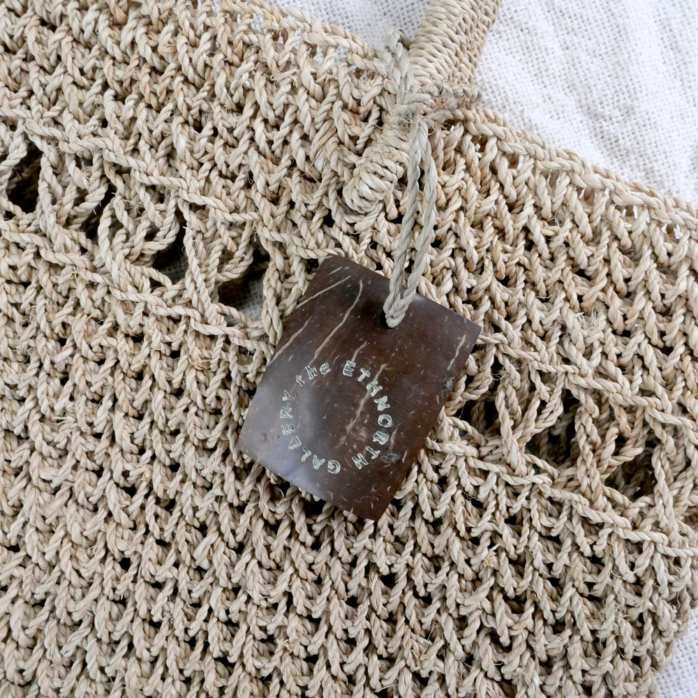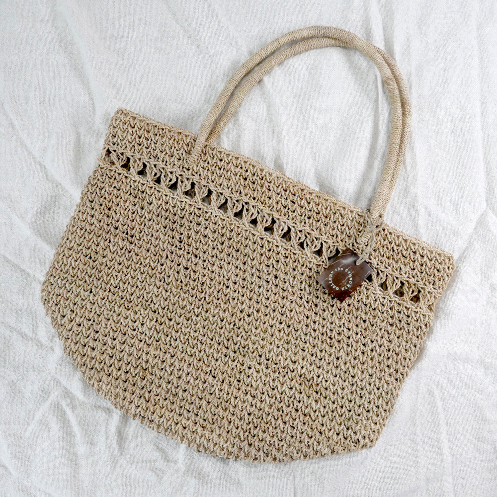 インドネシアのスラバヤ郊外の工房で作られている、ヤシの葉の繊維を手編みしたバッグ。底には円状のマチが付いています。さらに当ブランドロゴのココナッツ殻で作ったタグが付いており、その紐の部分はパイナップルの繊維で作られています。こちらは開き口が広く使いやすいハンドバッグタイプ底マチも大きくとってあります。