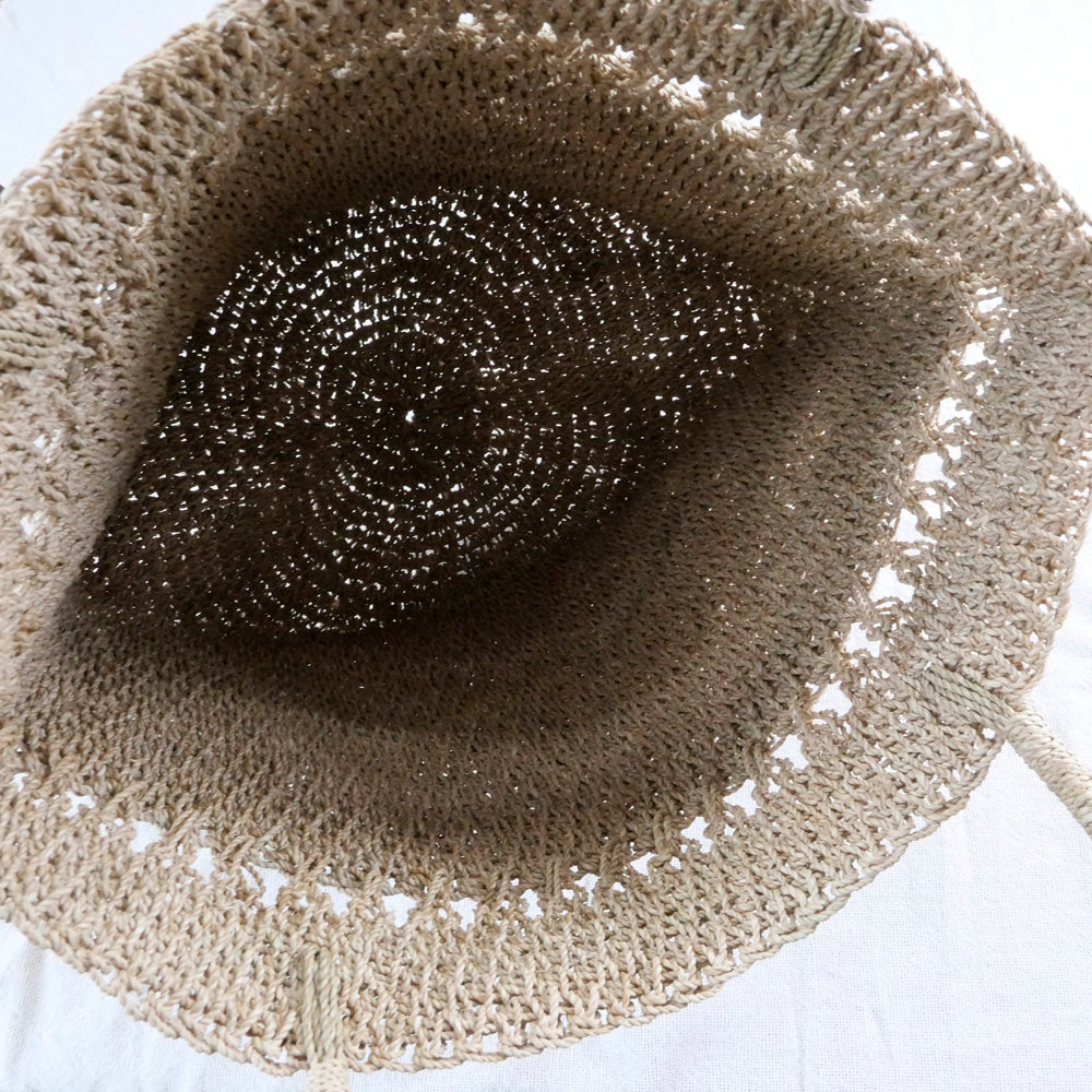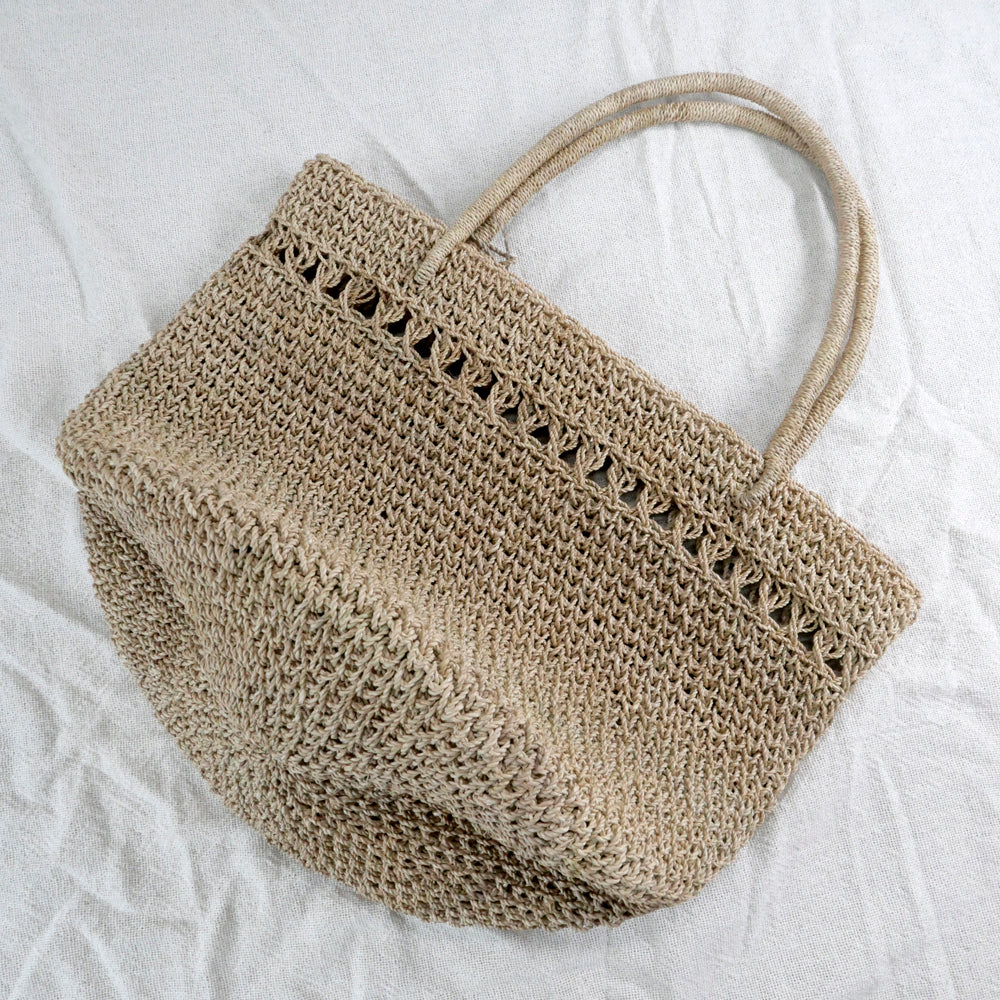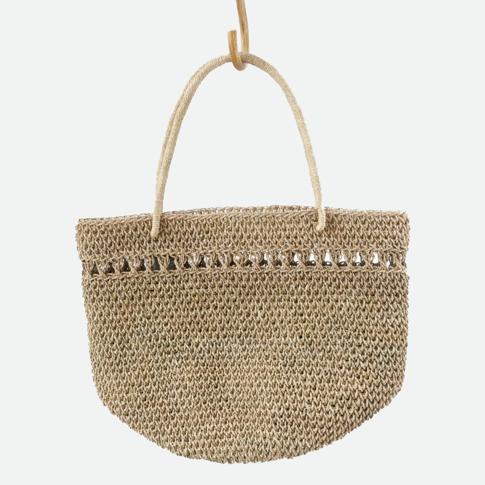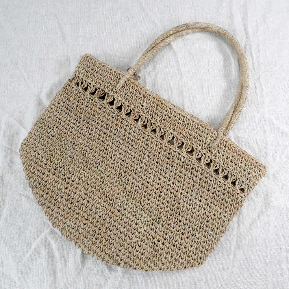 インドネシアのスラバヤ郊外の工房で作られている、ヤシの葉の繊維を手編みしたバッグ。底には円状のマチが付いています。さらに当ブランドロゴのココナッツ殻で作ったタグが付いており、その紐の部分はパイナップルの繊維で作られています。こちらは開き口が広く使いやすいハンドバッグタイプ底マチも大きくとってあります。
