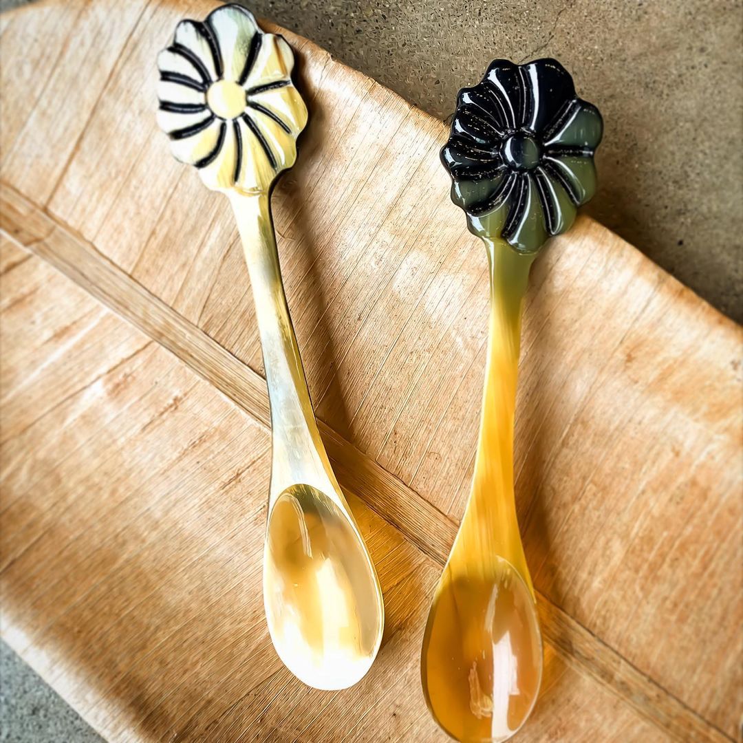 とっても可愛らしいデザインが手彫りされた水牛角を使用したスプーン。我が家でも使用していますが、ヨーグルトなどのデザートを食べると、口あたりがとても滑らかで美味しく感じて頂けます。高熱を加えると変形してしまうので、沸騰したお湯とかに使用するのは避けてください。どれも水牛角そのもののお色です。お花と葉っぱ模様の2種類ございます。